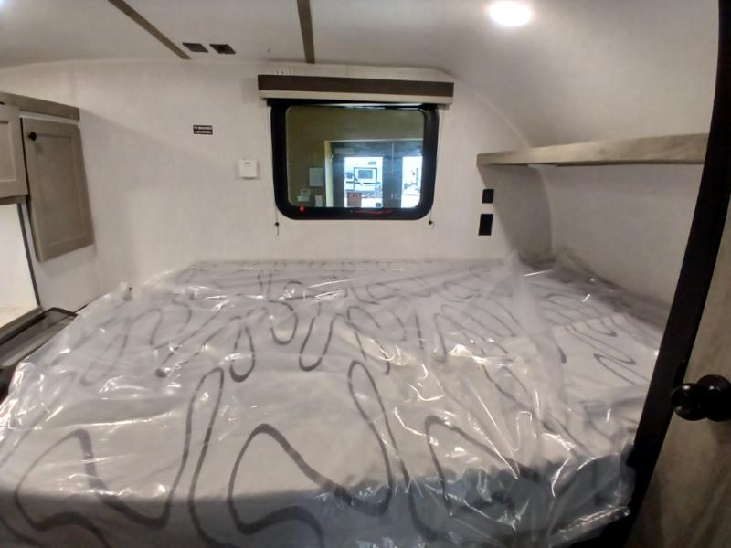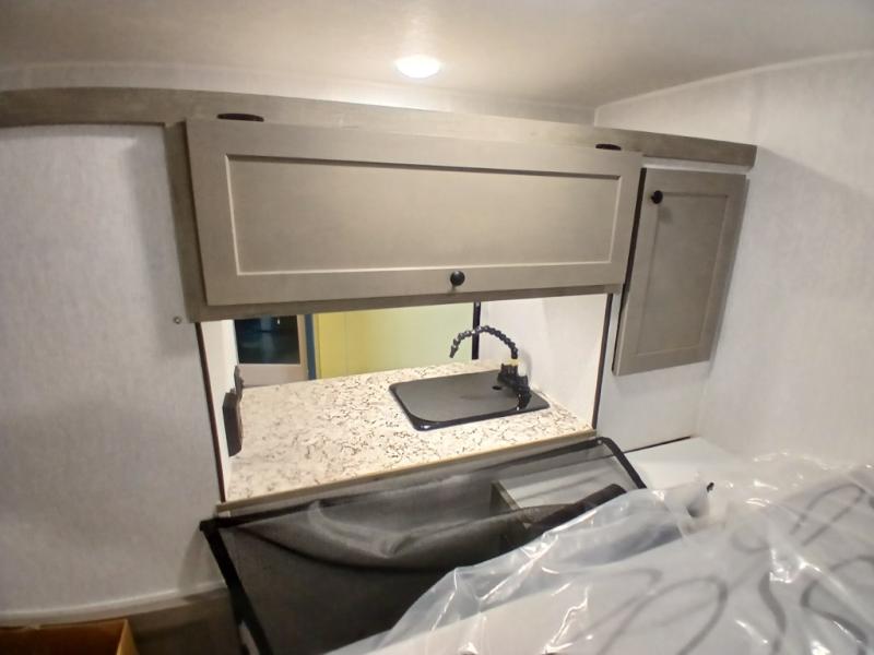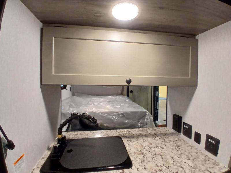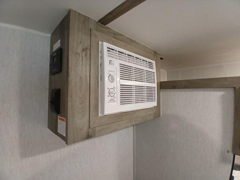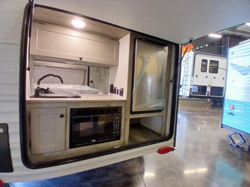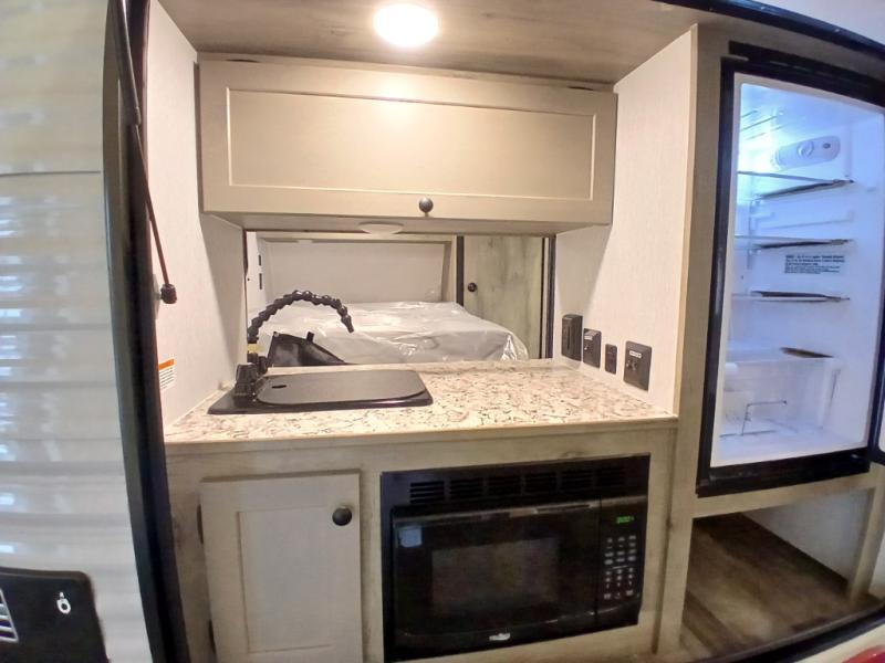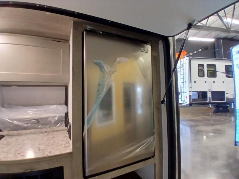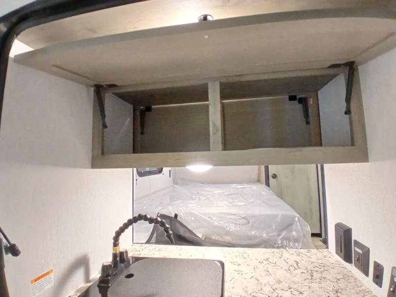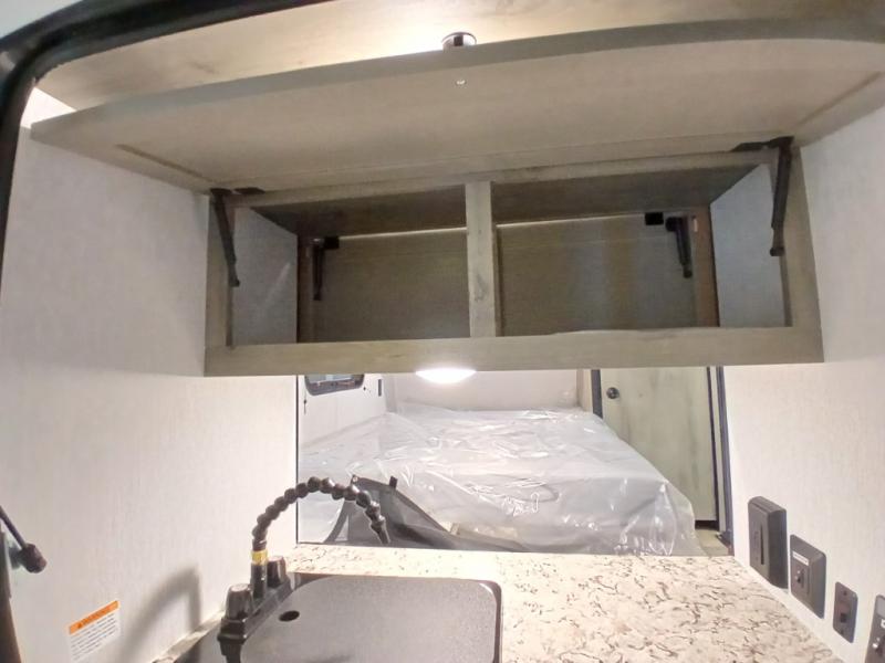 This unit is ideal for travelers seeking maneuverability and ease of towing without compromising on essential comforts. The rear closet provides convenient storage for clothing and personal items, keeping your belongings organized, and the bed assembly creates a cozy sleeping space, perfect for restful nights on the road. Practical storage and organization can be found in the front closet, which offers additional storage for travel essentials and personal belongings, while the front shelf delivers handy space for items you want within easy reach, enhancing convenience. Further, the A/C cabinet provides specialized storage for your air conditioning unit, ensuring efficient integration and protection. Convenience is met in the outdoor kitchen, which features a refrigerator, overhead cabinets, and a two-burner cooktop, providing versatile cooking options for preparing delicious meals outdoors.