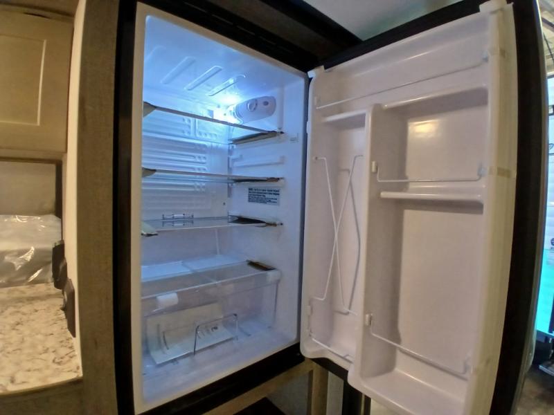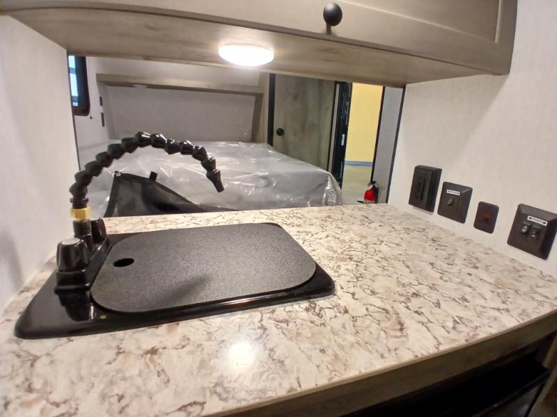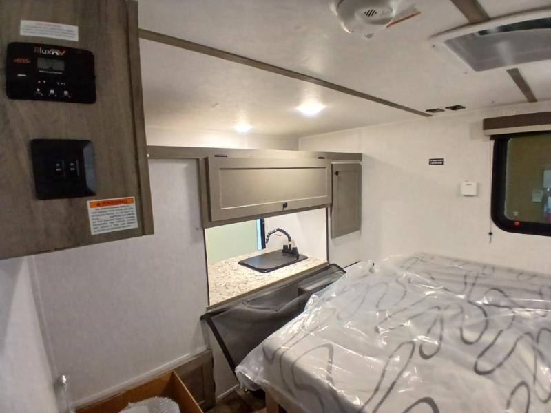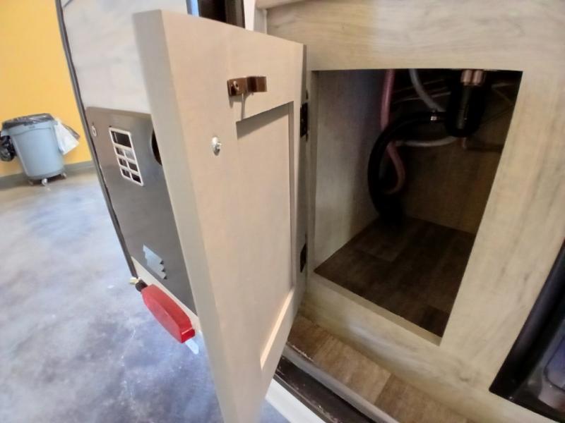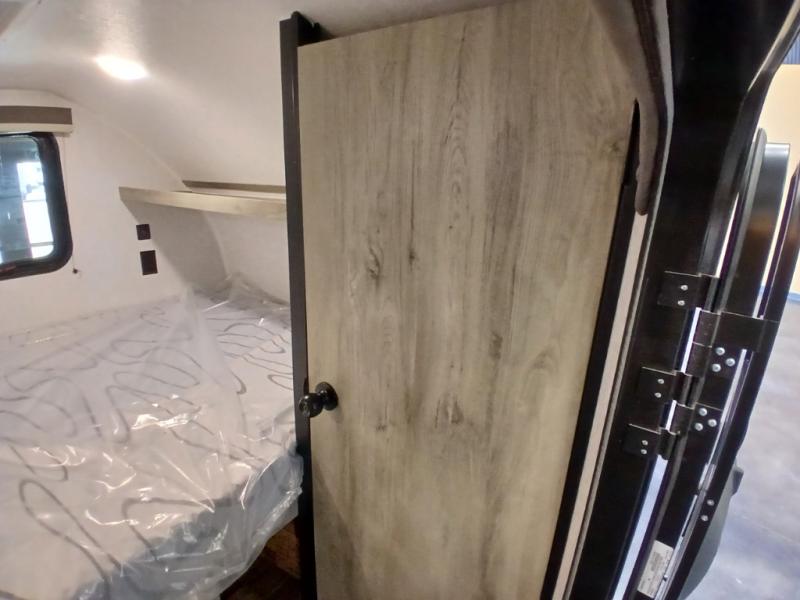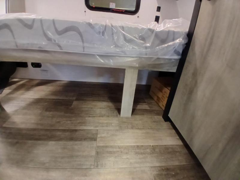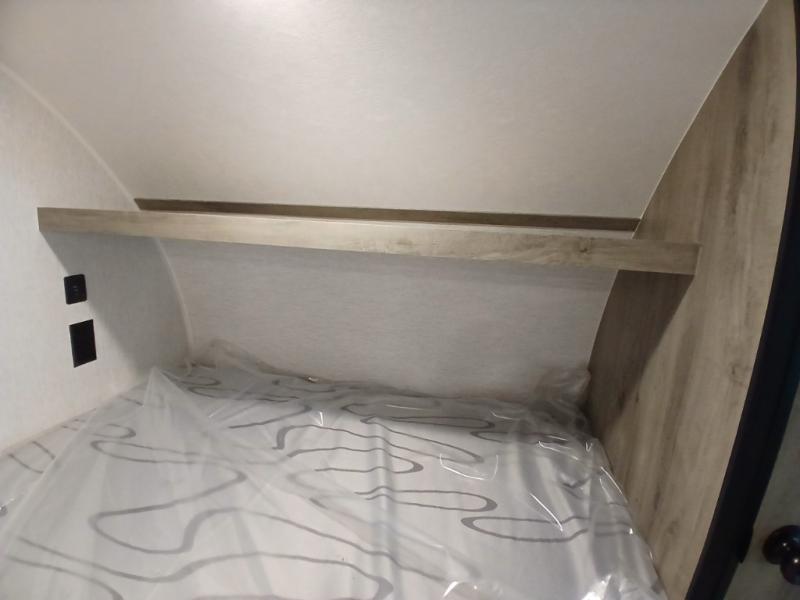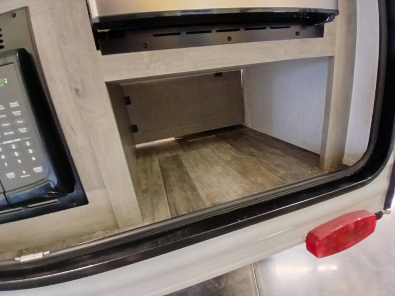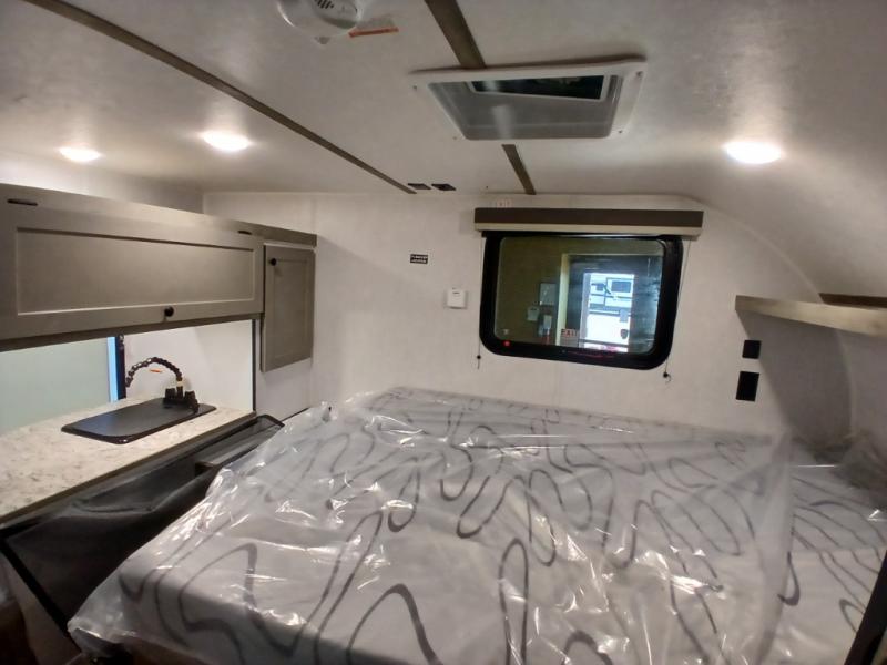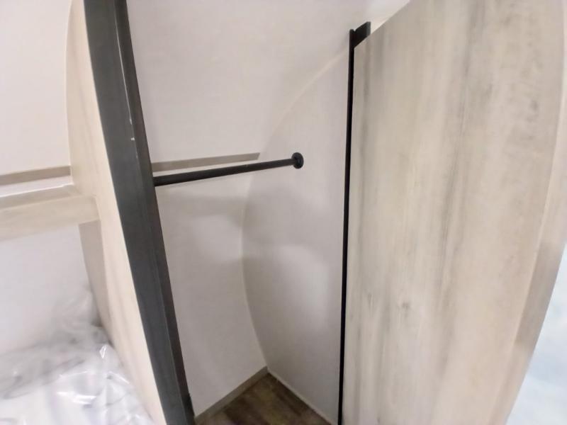 This unit is ideal for travelers seeking maneuverability and ease of towing without compromising on essential comforts. The rear closet provides convenient storage for clothing and personal items, keeping your belongings organized, and the bed assembly creates a cozy sleeping space, perfect for restful nights on the road. Practical storage and organization can be found in the front closet, which offers additional storage for travel essentials and personal belongings, while the front shelf delivers handy space for items you want within easy reach, enhancing convenience. Further, the A/C cabinet provides specialized storage for your air conditioning unit, ensuring efficient integration and protection. Convenience is met in the outdoor kitchen, which features a refrigerator, overhead cabinets, and a two-burner cooktop, providing versatile cooking options for preparing delicious meals outdoors.