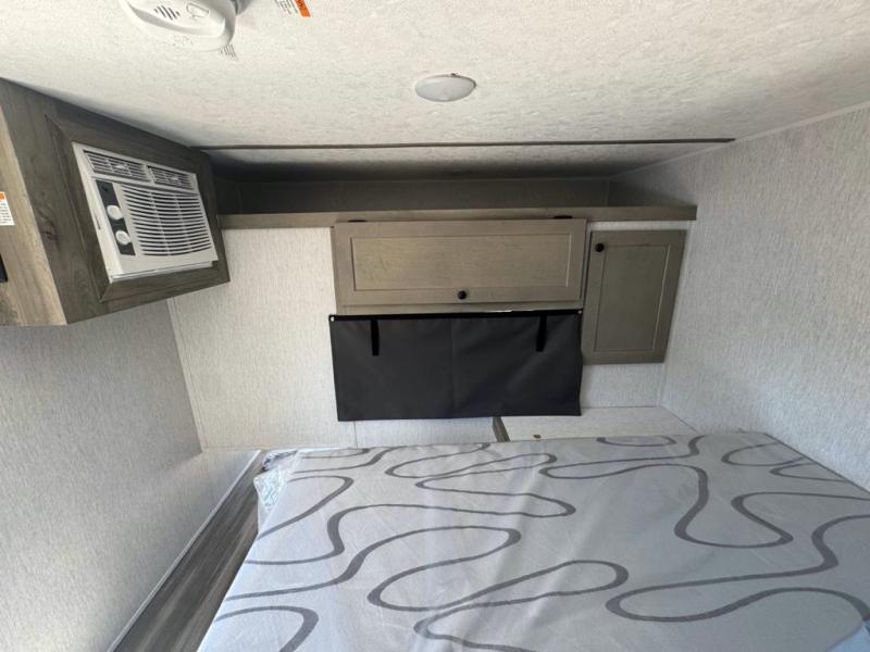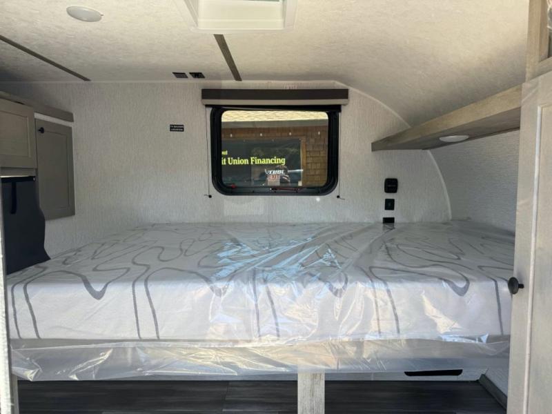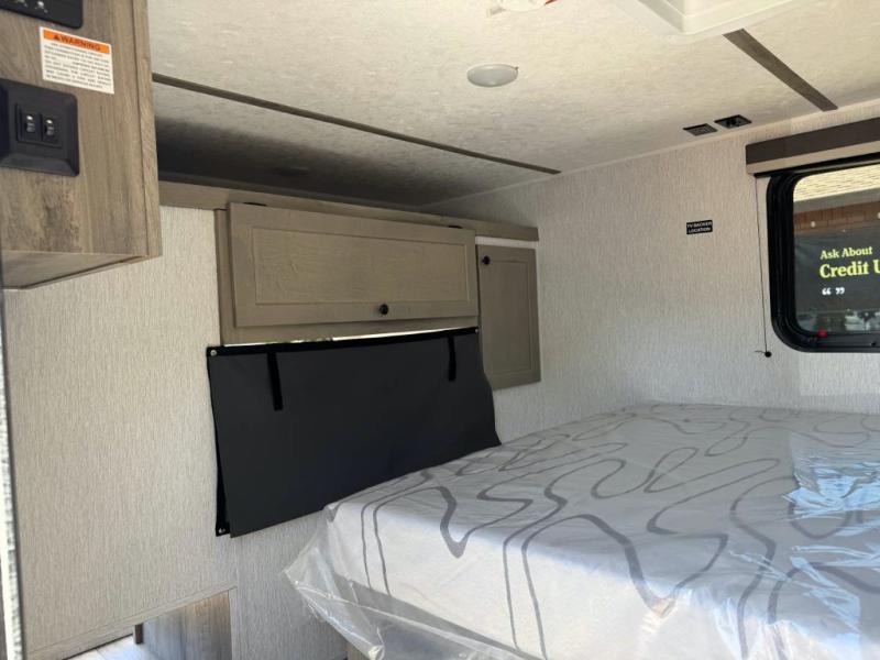 This unit is ideal for travelers seeking maneuverability and ease of towing without compromising on essential comforts. The rear closet provides convenient storage for clothing and personal items, keeping your belongings organized, and the bed assembly creates a cozy sleeping space, perfect for restful nights on the road. Practical storage and organization can be found in the front closet, which offers additional storage for travel essentials and personal belongings, while the front shelf delivers handy space for items you want within easy reach, enhancing convenience. Further, the A/C cabinet provides specialized storage for your air conditioning unit, ensuring efficient integration and protection. Convenience is met in the outdoor kitchen, which features a refrigerator, overhead cabinets, and a two-burner cooktop, providing versatile cooking options for preparing delicious meals outdoors.
