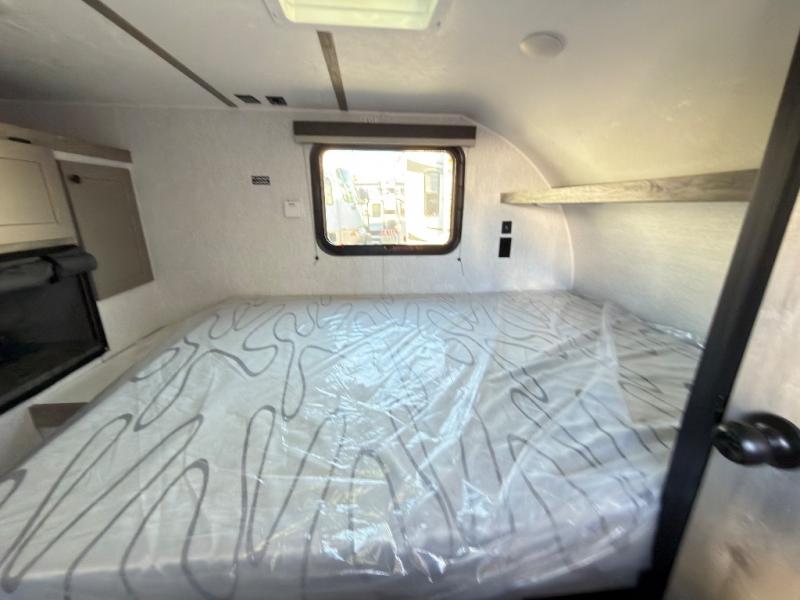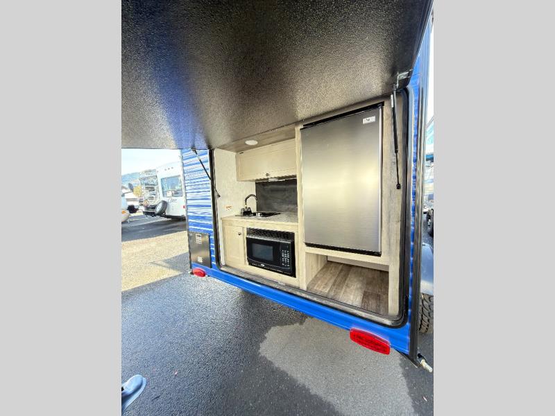 This unit is ideal for travelers seeking maneuverability and ease of towing without compromising on essential comforts. The rear closet provides convenient storage for clothing and personal items, keeping your belongings organized, and the bed assembly creates a cozy sleeping space, perfect for restful nights on the road. Practical storage and organization can be found in the front closet, which offers additional storage for travel essentials and personal belongings, while the front shelf delivers handy space for items you want within easy reach, enhancing convenience. Further, the A/C cabinet provides specialized storage for your air conditioning unit, ensuring efficient integration and protection. Convenience is met in the outdoor kitchen, which features a refrigerator, overhead cabinets, and a two-burner cooktop, providing versatile cooking options for preparing delicious meals outdoors.