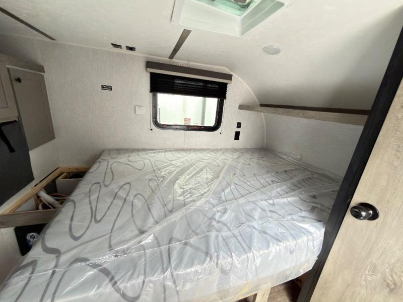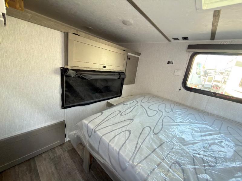 This unit is ideal for travelers seeking maneuverability and ease of towing without compromising on essential comforts. The rear closet provides convenient storage for clothing and personal items, keeping your belongings organized, and the bed assembly creates a cozy sleeping space, perfect for restful nights on the road. Practical storage and organization can be found in the front closet, which offers additional storage for travel essentials and personal belongings, while the front shelf delivers handy space for items you want within easy reach, enhancing convenience. Further, the A/C cabinet provides specialized storage for your air conditioning unit, ensuring efficient integration and protection. Convenience is met in the outdoor kitchen, which features a refrigerator, overhead cabinets, and a two-burner cooktop, providing versatile cooking options for preparing delicious meals outdoors.