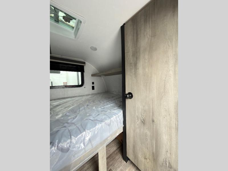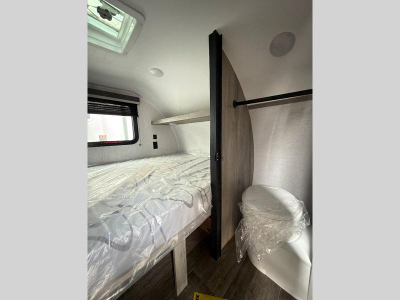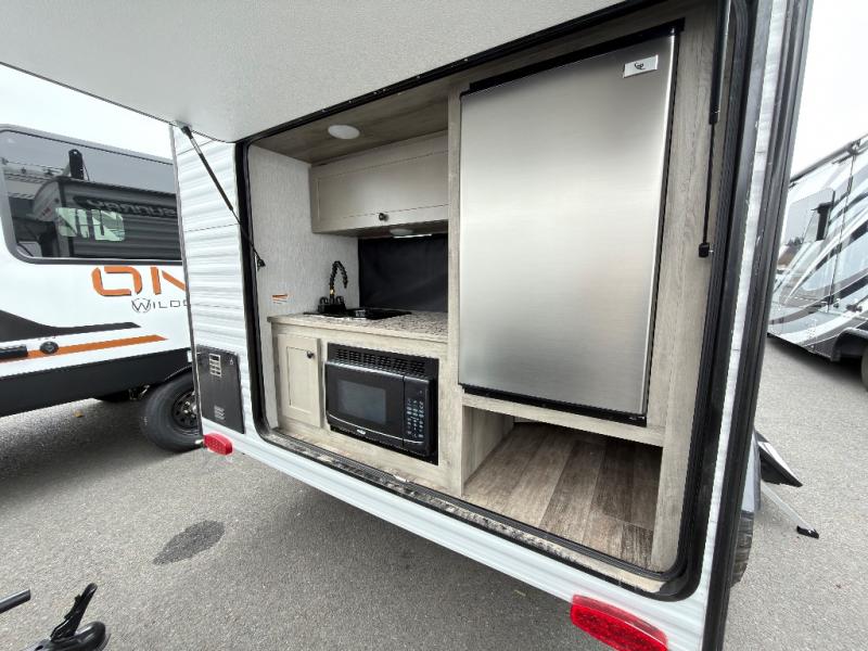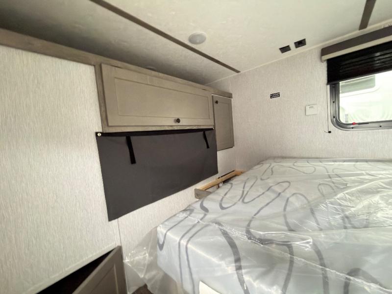 This unit is ideal for travelers seeking maneuverability and ease of towing without compromising on essential comforts. The rear closet provides convenient storage for clothing and personal items, keeping your belongings organized, and the bed assembly creates a cozy sleeping space, perfect for restful nights on the road. Practical storage and organization can be found in the front closet, which offers additional storage for travel essentials and personal belongings, while the front shelf delivers handy space for items you want within easy reach, enhancing convenience. Further, the A/C cabinet provides specialized storage for your air conditioning unit, ensuring efficient integration and protection. Convenience is met in the outdoor kitchen, which features a refrigerator, overhead cabinets, and a two-burner cooktop, providing versatile cooking options for preparing delicious meals outdoors.