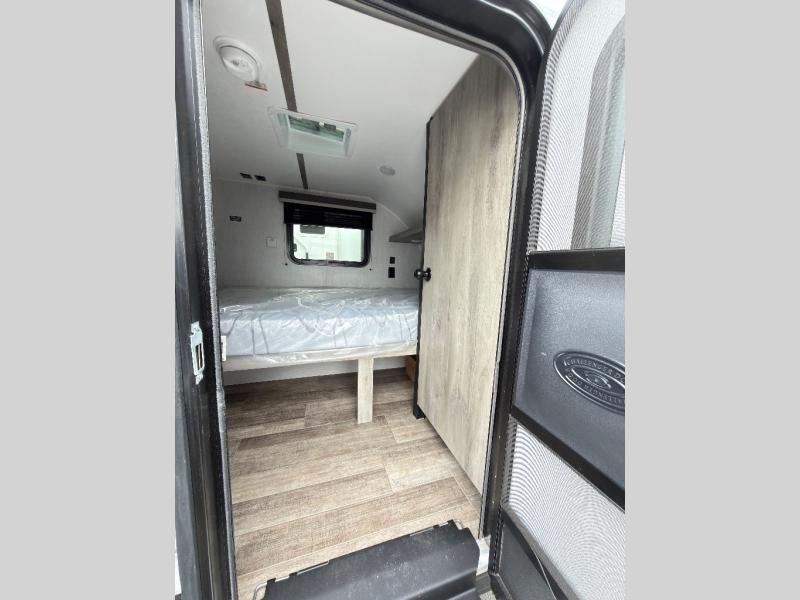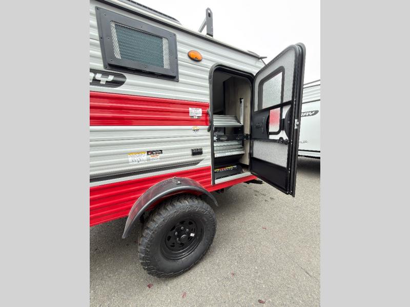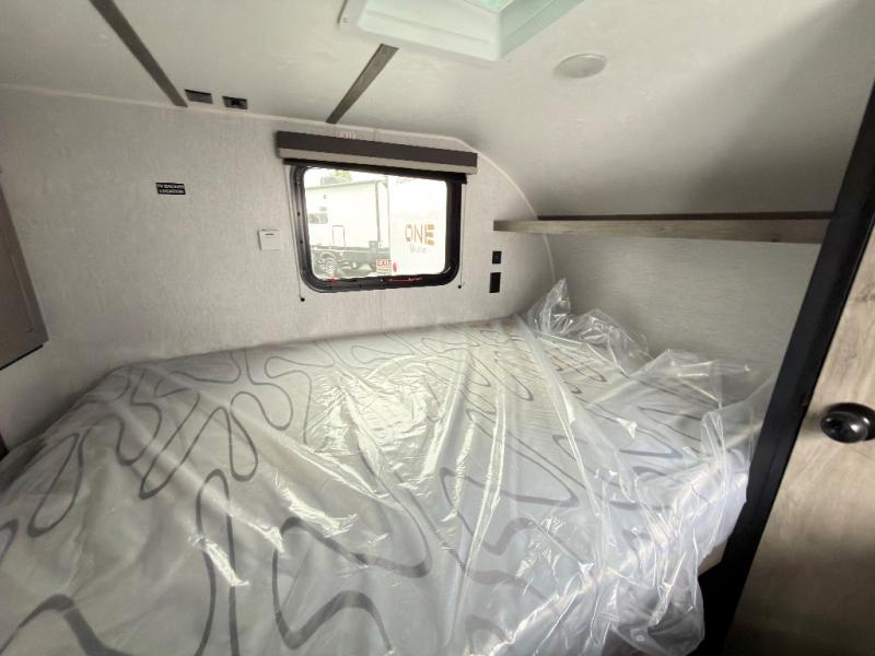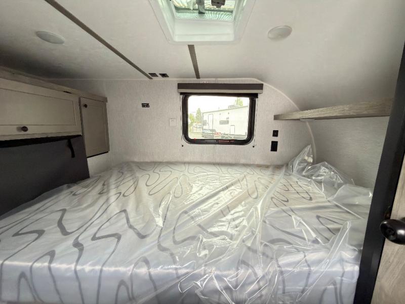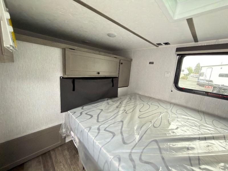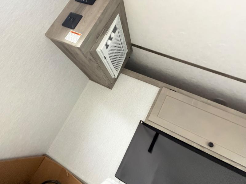 This unit is ideal for travelers seeking maneuverability and ease of towing without compromising on essential comforts. The rear closet provides convenient storage for clothing and personal items, keeping your belongings organized, and the bed assembly creates a cozy sleeping space, perfect for restful nights on the road. Practical storage and organization can be found in the front closet, which offers additional storage for travel essentials and personal belongings, while the front shelf delivers handy space for items you want within easy reach, enhancing convenience. Further, the A/C cabinet provides specialized storage for your air conditioning unit, ensuring efficient integration and protection. Convenience is met in the outdoor kitchen, which features a refrigerator, overhead cabinets, and a two-burner cooktop, providing versatile cooking options for preparing delicious meals outdoors.
