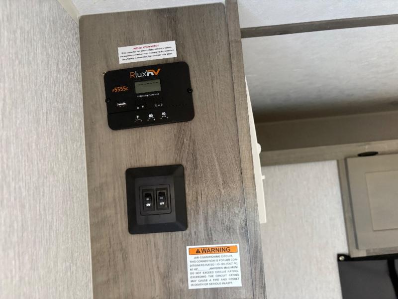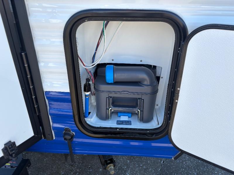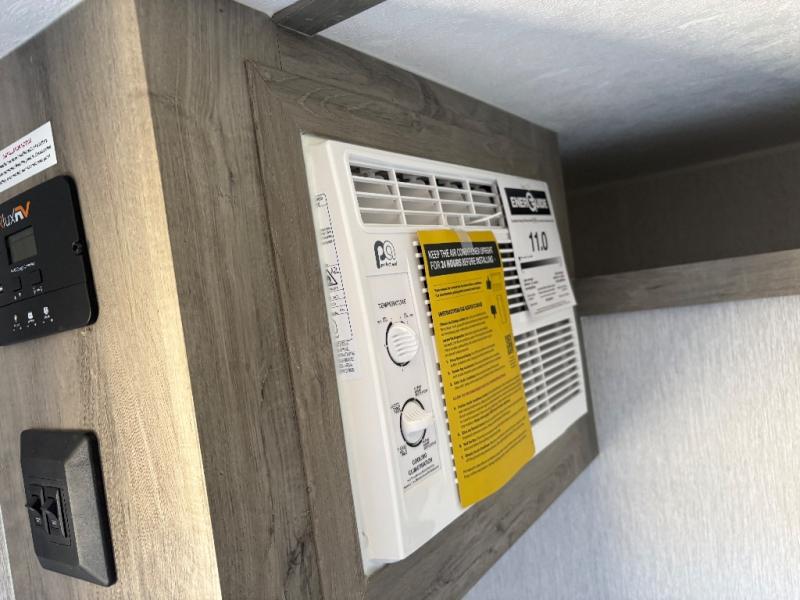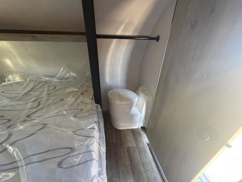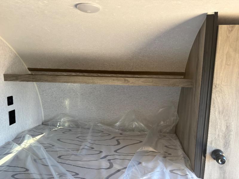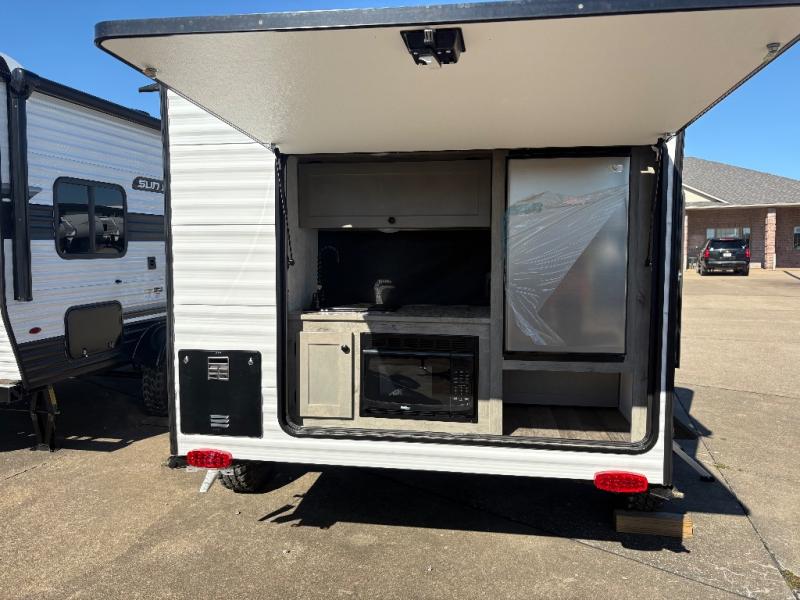 This unit is ideal for travelers seeking maneuverability and ease of towing without compromising on essential comforts. The rear closet provides convenient storage for clothing and personal items, keeping your belongings organized, and the bed assembly creates a cozy sleeping space, perfect for restful nights on the road. Practical storage and organization can be found in the front closet, which offers additional storage for travel essentials and personal belongings, while the front shelf delivers handy space for items you want within easy reach, enhancing convenience. Further, the A/C cabinet provides specialized storage for your air conditioning unit, ensuring efficient integration and protection. Convenience is met in the outdoor kitchen, which features a refrigerator, overhead cabinets, and a two-burner cooktop, providing versatile cooking options for preparing delicious meals outdoors.