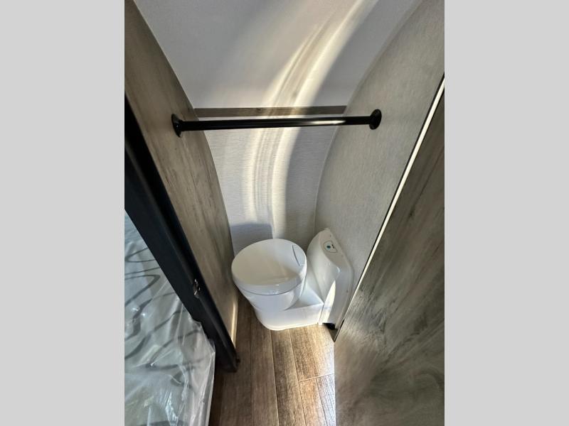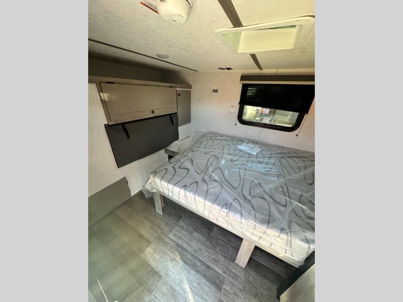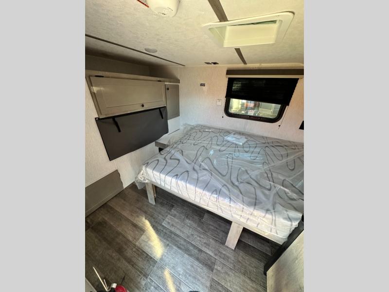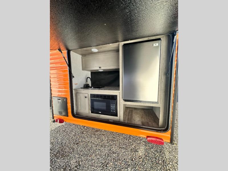This unit is ideal for travelers seeking maneuverability and ease of towing without compromising on essential comforts. The rear closet provides convenient storage for clothing and personal items, keeping your belongings organized, and the bed assembly creates a cozy sleeping space, perfect for restful nights on the road. Practical storage and organization can be found in the front closet, which offers additional storage for travel essentials and personal belongings, while the front shelf delivers handy space for items you want within easy reach, enhancing convenience. Further, the A/C cabinet provides specialized storage for your air conditioning unit, ensuring efficient integration and protection. Convenience is met in the outdoor kitchen, which features a refrigerator, overhead cabinets, and a two-burner cooktop, providing versatile cooking options for preparing delicious meals outdoors.