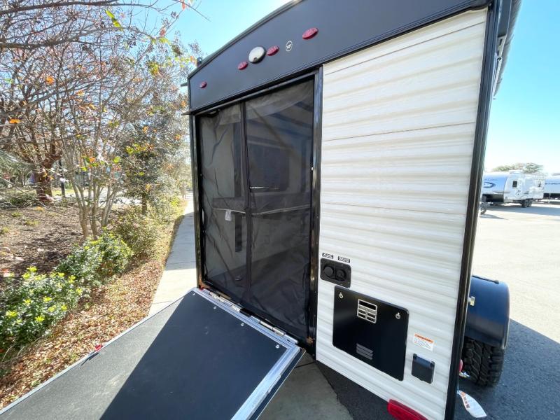 A ramp door makes it easy to load and unload this Sunray travel trailer! Since there is a folding bed, you won't have to blow up an air mattress to sleep at night. Make your world-famous pancakes on the outside two-burner stove top, and spend some time washing dishes afterwards in the indoor and outdoor sinks. Also on the interior, you will find a private toilet which will be ultra convenient when you wake up in the middle of the night and need to go to the bathroom. The tinted safety glass windows come with night shades to give you privacy at night and sunlight during the day. You could even add an optional fireplace for a truly relaxing evening indoors!