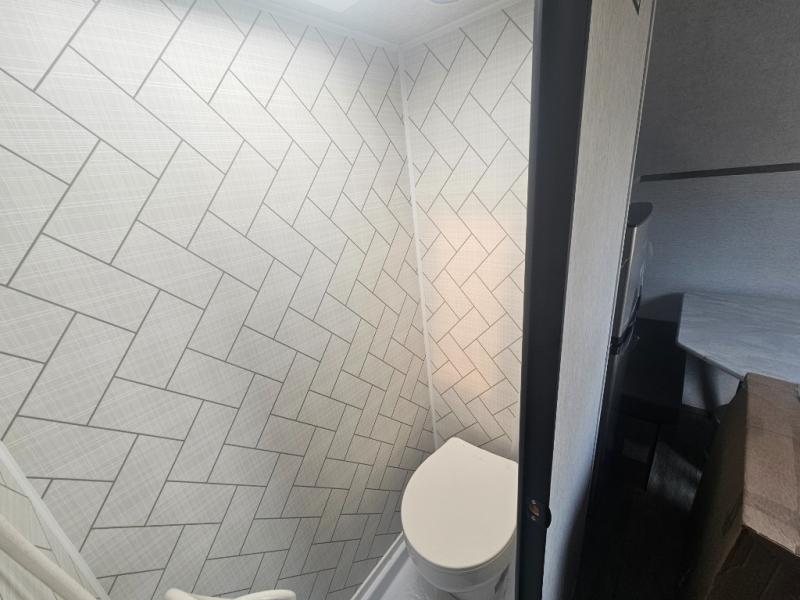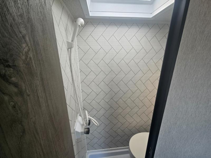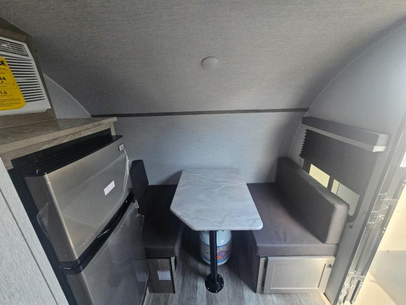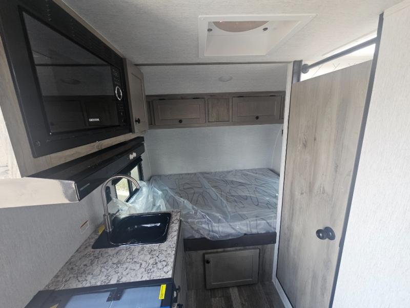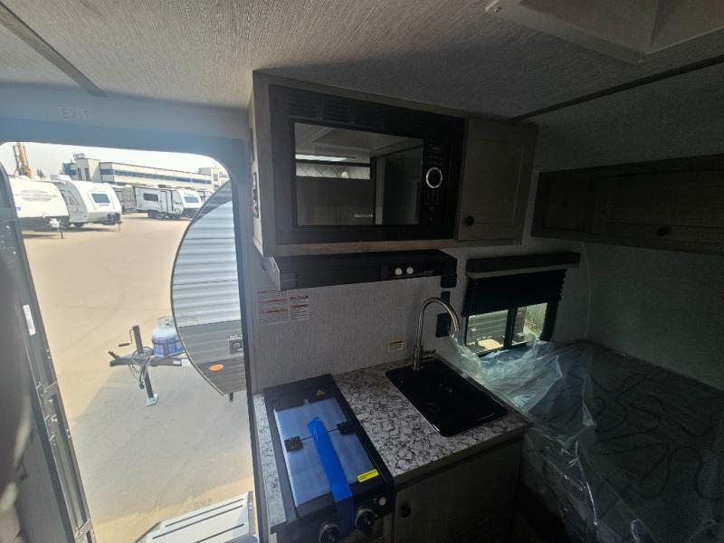 This Sunray travel trailer is the largest and most accommodating because it comes with a wet bath so that you can even take a shower in your trailer! There is a small kitchen on the interior that comes with a two-burner stove top, a refrigerator, and a microwave so that you can cook dinner without having to start a fire, and since it is indoors, you will be able to keep the bugs away while you prepare something delicious to eat. If you need to rinse off some gear, the outside shower will be especially useful, and if you need to charge your devices, use the USB ports. You will also find a Winegard HDTV antenna on this model. Add the available Classic option for 14" tires instead of the off-road version, color matching rims with Moon Caps, and Retro decor and Diner-Style countertops.