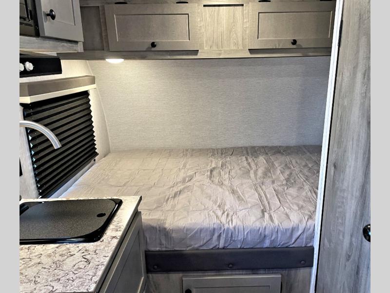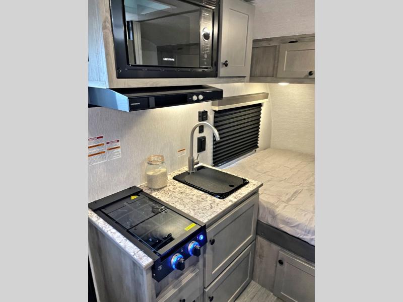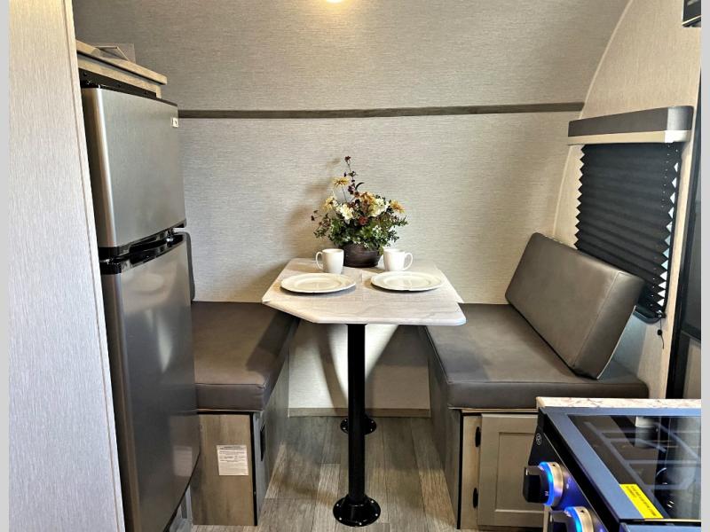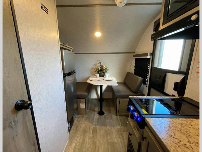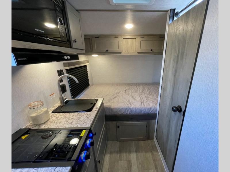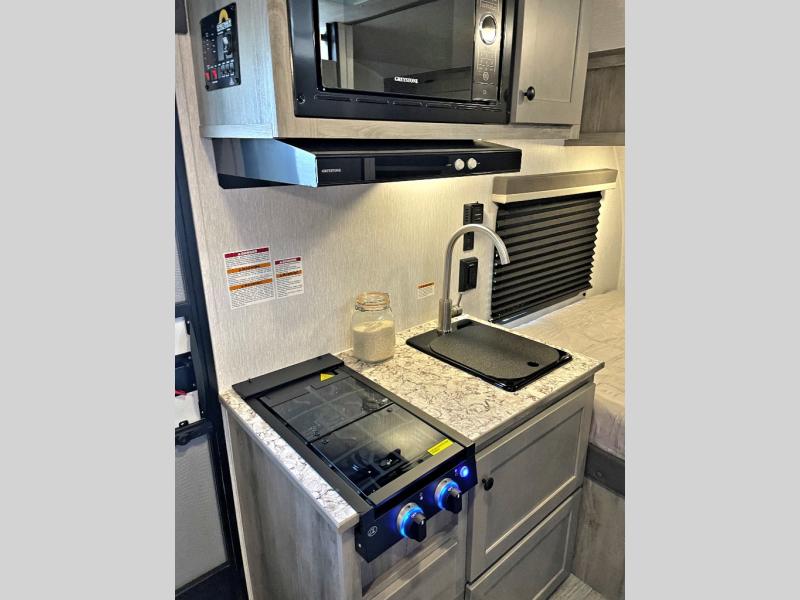 This Sunray travel trailer is the largest and most accommodating because it comes with a wet bath so that you can even take a shower in your trailer! There is a small kitchen on the interior that comes with a two-burner stove top, a refrigerator, and a microwave so that you can cook dinner without having to start a fire, and since it is indoors, you will be able to keep the bugs away while you prepare something delicious to eat. If you need to rinse off some gear, the outside shower will be especially useful, and if you need to charge your devices, use the USB ports. You will also find a Winegard HDTV antenna on this model. Add the available Classic option for 14" tires instead of the off-road version, color matching rims with Moon Caps, and Retro decor and Diner-Style countertops.