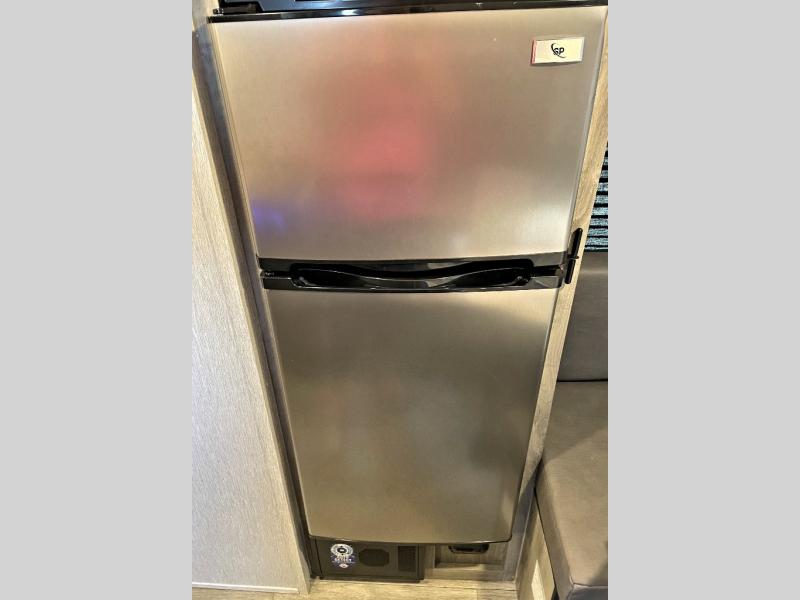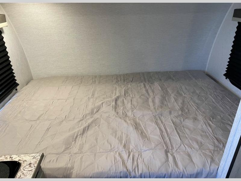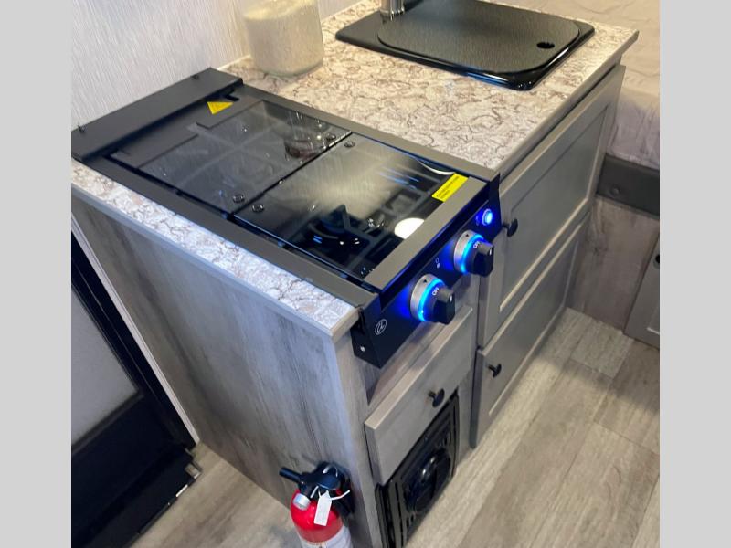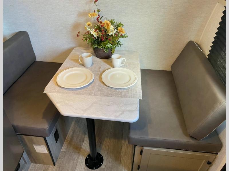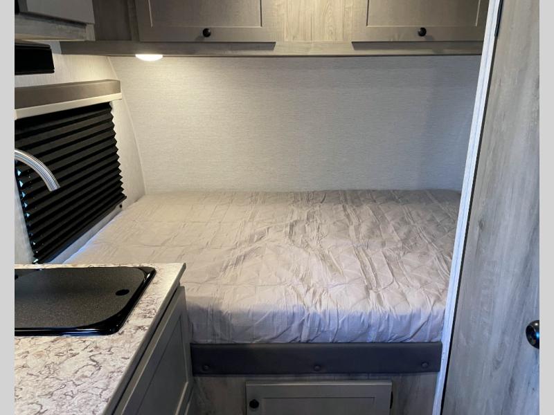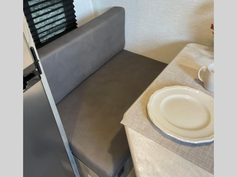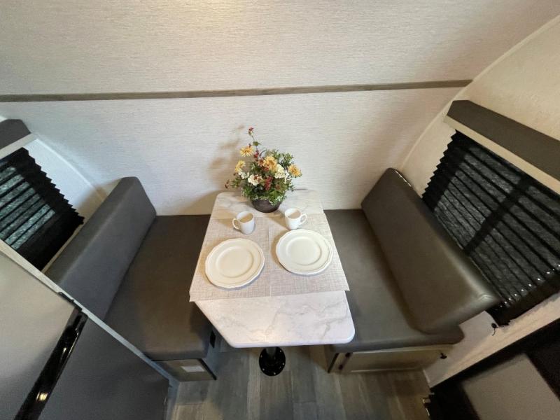 This Sunray travel trailer is the largest and most accommodating because it comes with a wet bath so that you can even take a shower in your trailer! There is a small kitchen on the interior that comes with a two-burner stove top, a refrigerator, and a microwave so that you can cook dinner without having to start a fire, and since it is indoors, you will be able to keep the bugs away while you prepare something delicious to eat. If you need to rinse off some gear, the outside shower will be especially useful, and if you need to charge your devices, use the USB ports. You will also find a Winegard HDTV antenna on this model. Add the available Classic option for 14" tires instead of the off-road version, color matching rims with Moon Caps, and Retro decor and Diner-Style countertops.