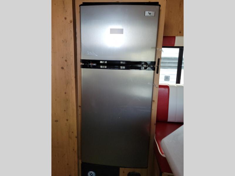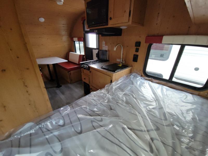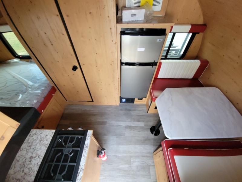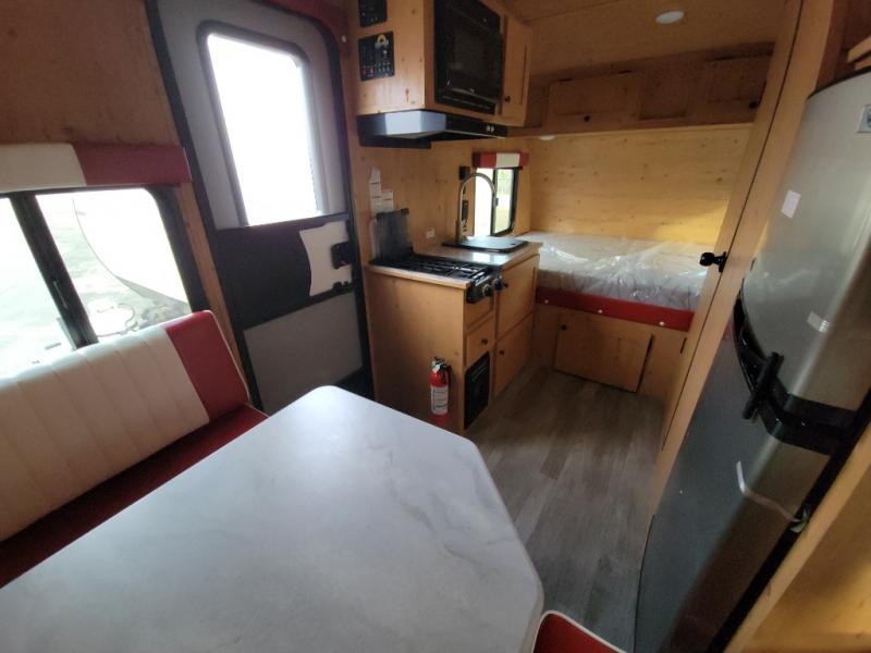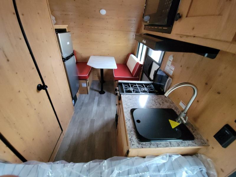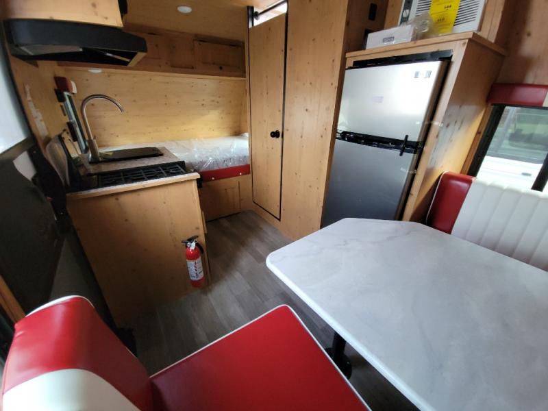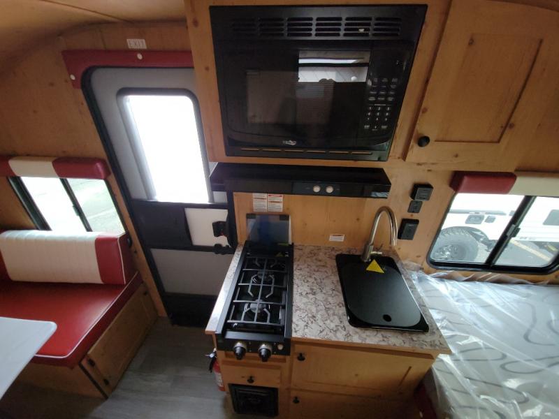 This Sunray travel trailer is the largest and most accommodating because it comes with a wet bath so that you can even take a shower in your trailer! There is a small kitchen on the interior that comes with a two-burner stove top, a refrigerator, and a microwave so that you can cook dinner without having to start a fire, and since it is indoors, you will be able to keep the bugs away while you prepare something delicious to eat. If you need to rinse off some gear, the outside shower will be especially useful, and if you need to charge your devices, use the USB ports. You will also find a Winegard HDTV antenna on this model. Add the available Classic option for 14" tires instead of the off-road version, color matching rims with Moon Caps, and Retro decor and Diner-Style countertops.