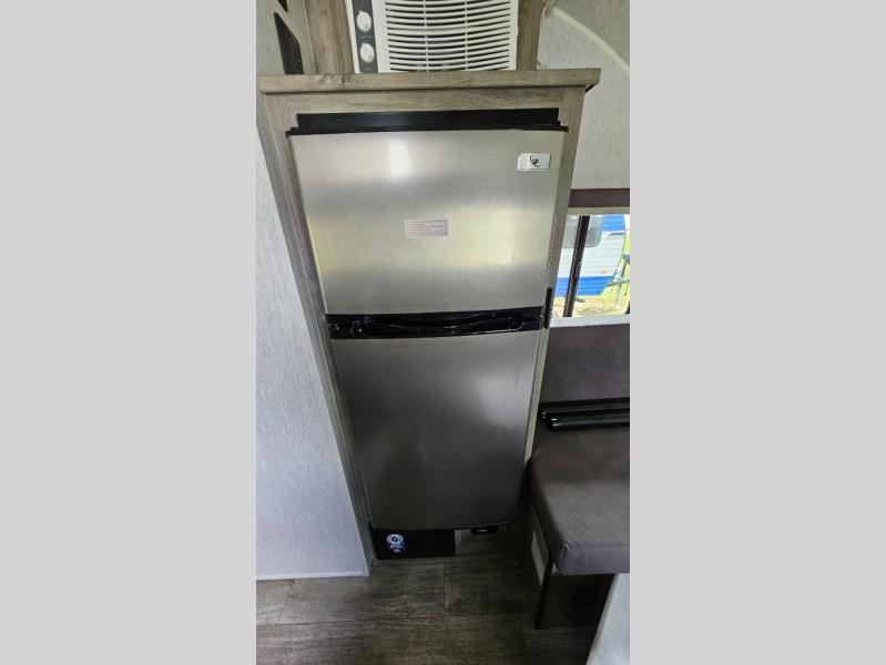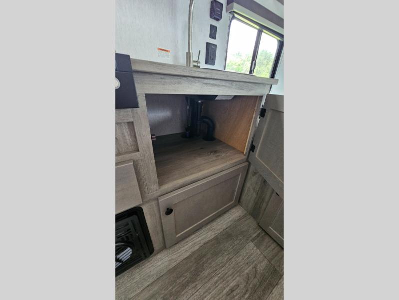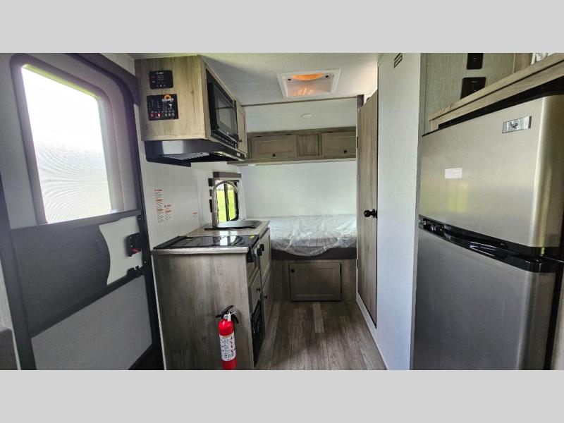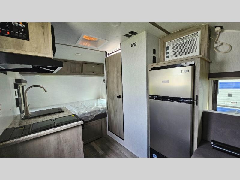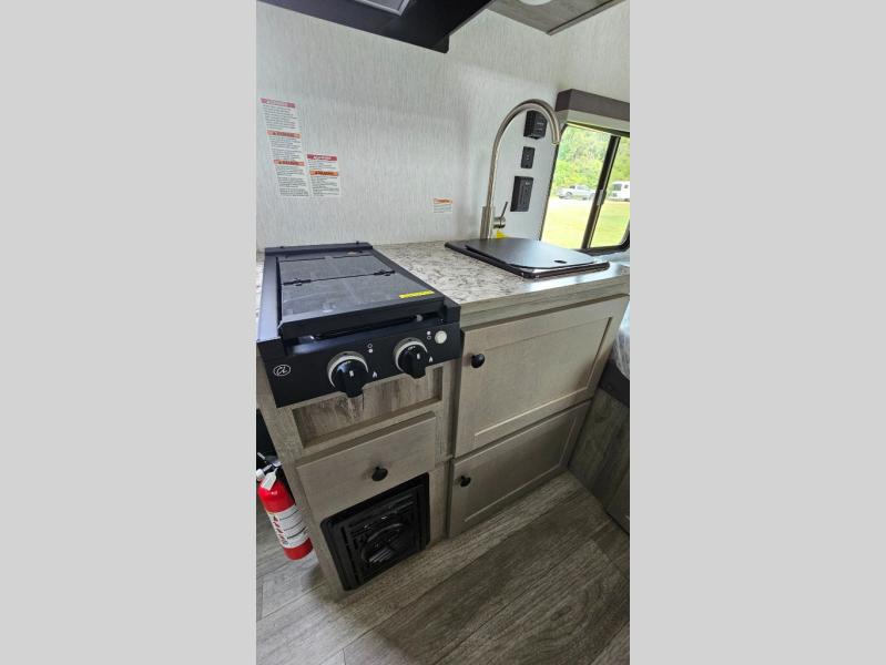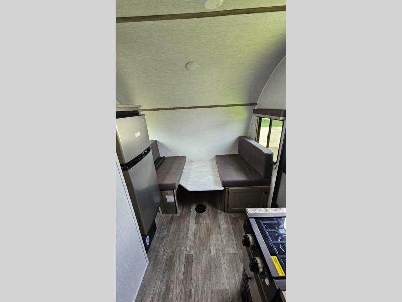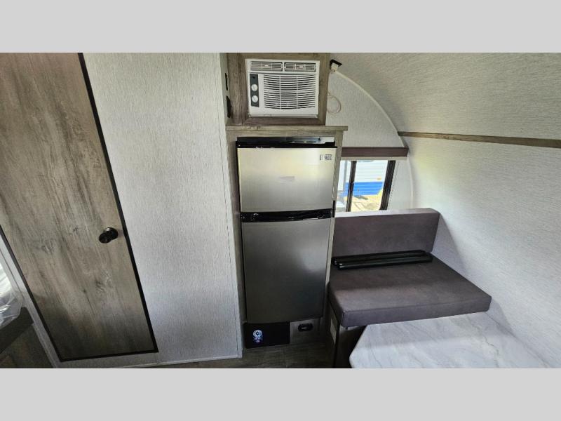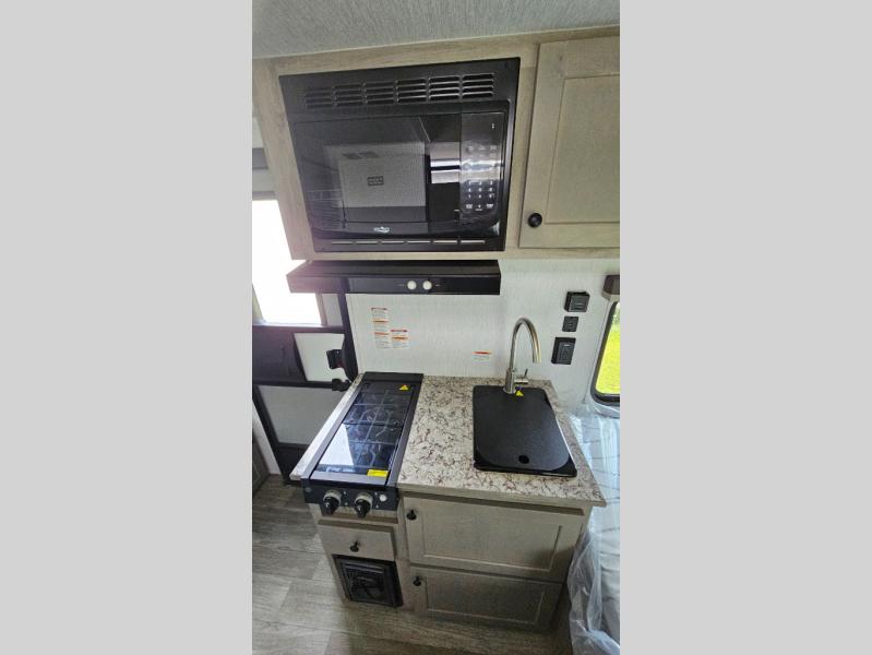 This Sunray travel trailer is the largest and most accommodating because it comes with a wet bath so that you can even take a shower in your trailer! There is a small kitchen on the interior that comes with a two-burner stove top, a refrigerator, and a microwave so that you can cook dinner without having to start a fire, and since it is indoors, you will be able to keep the bugs away while you prepare something delicious to eat. If you need to rinse off some gear, the outside shower will be especially useful, and if you need to charge your devices, use the USB ports. You will also find a Winegard HDTV antenna on this model. Add the available Classic option for 14" tires instead of the off-road version, color matching rims with Moon Caps, and Retro decor and Diner-Style countertops.