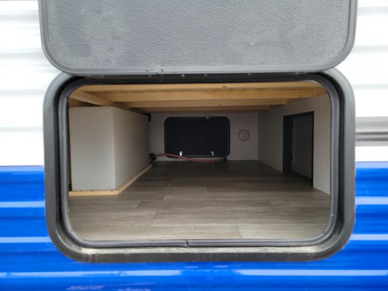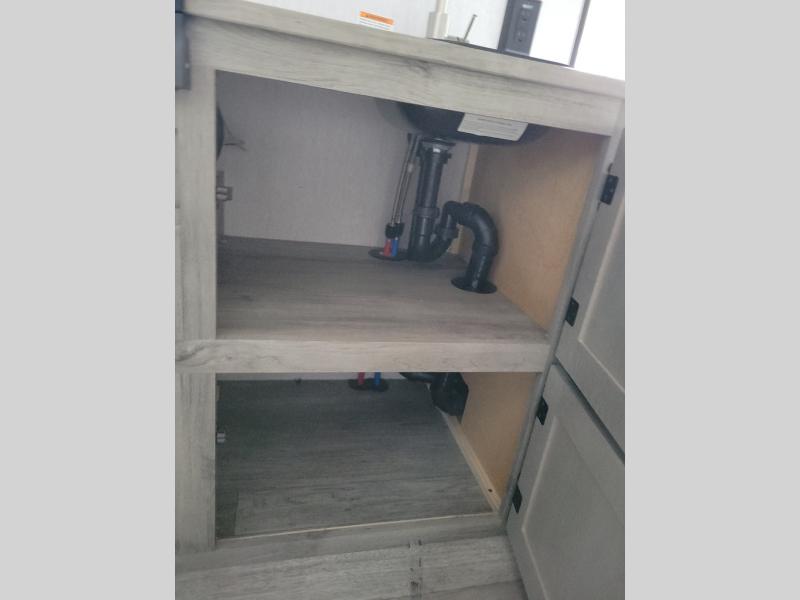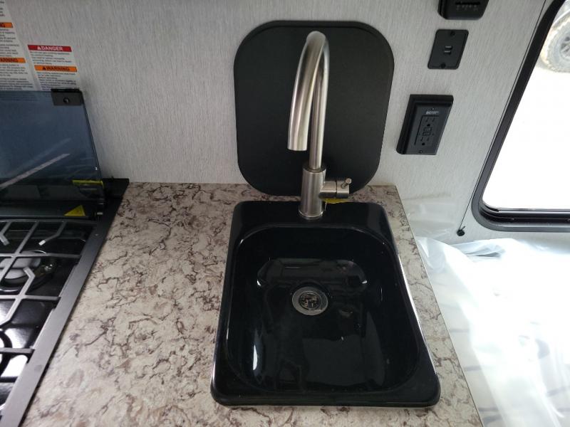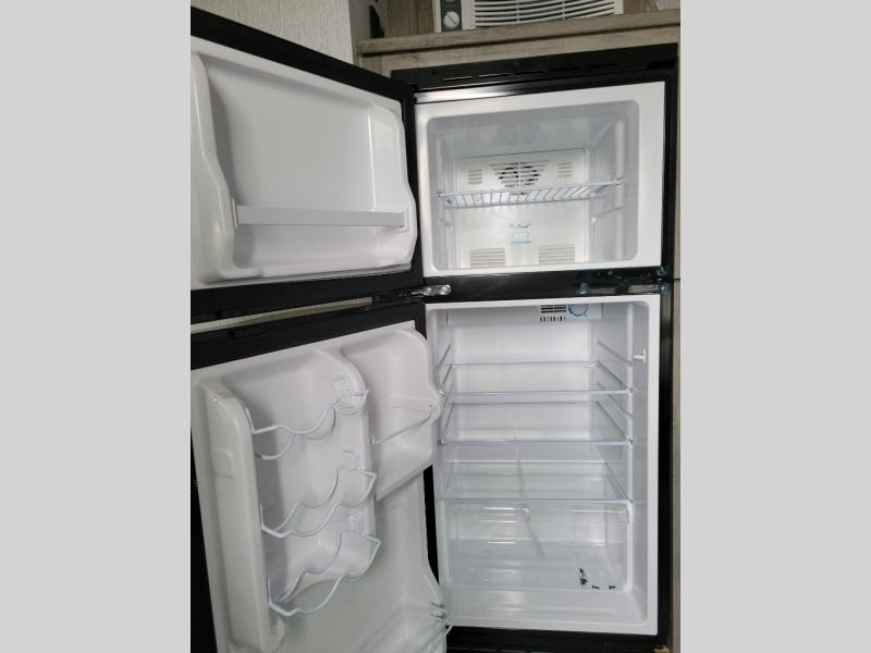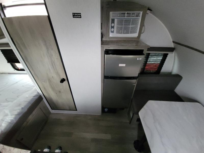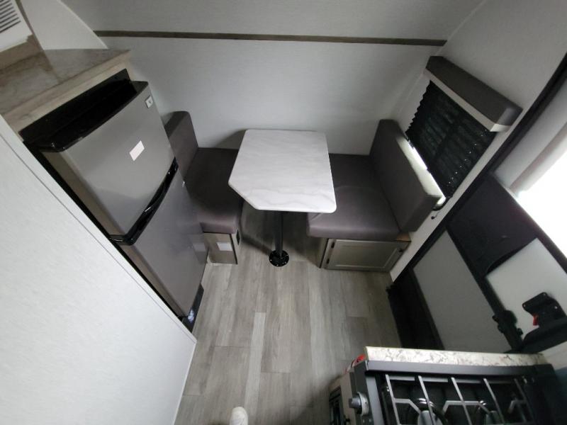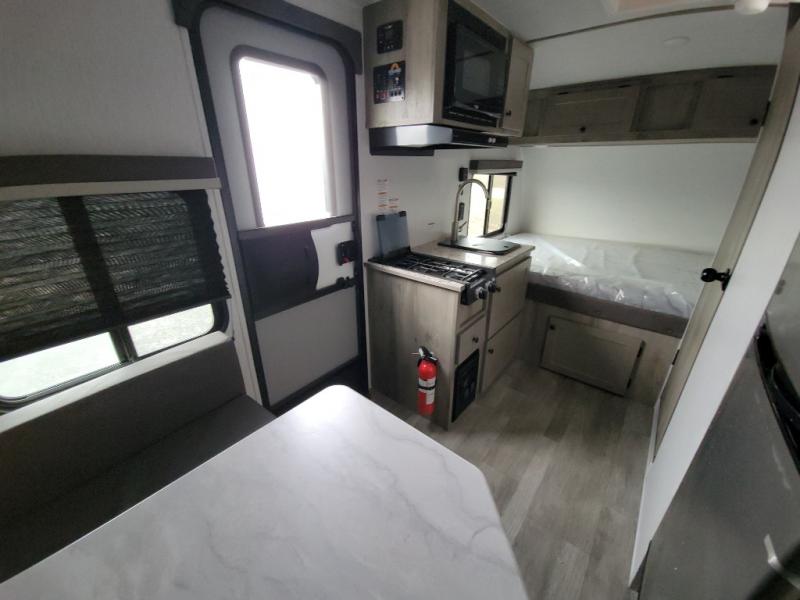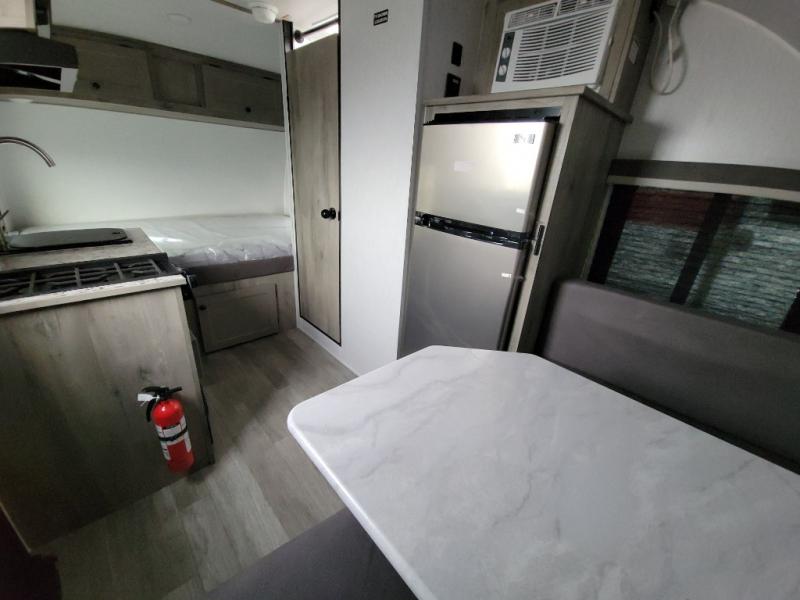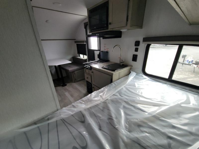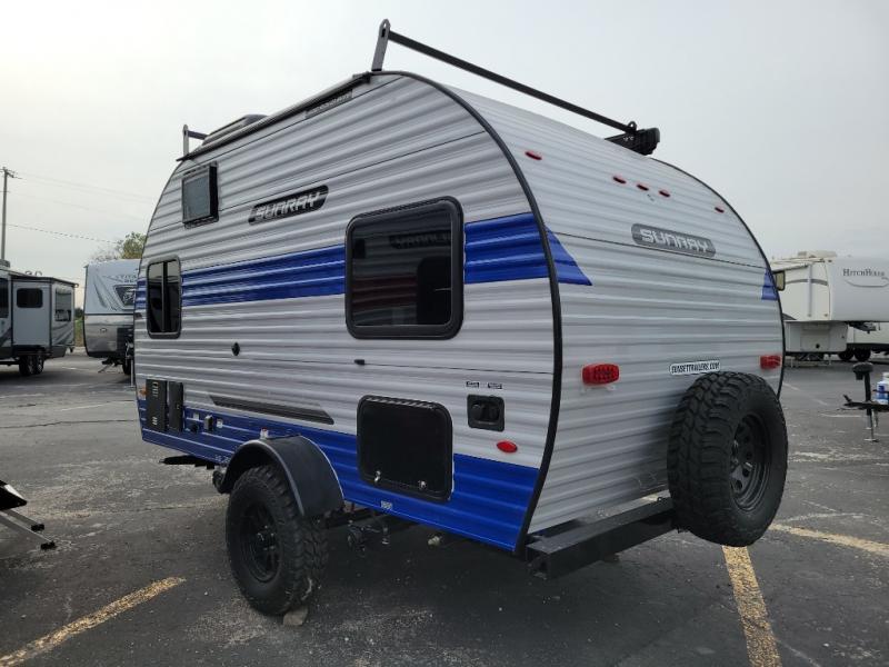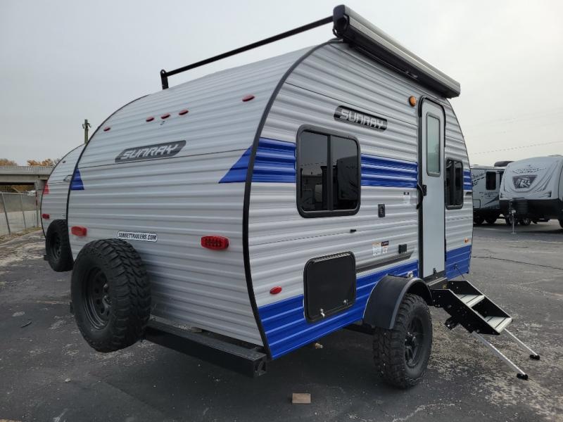This Sunray travel trailer is the largest and most accommodating because it comes with a wet bath so that you can even take a shower in your trailer! There is a small kitchen on the interior that comes with a two-burner stove top, a refrigerator, and a microwave so that you can cook dinner without having to start a fire, and since it is indoors, you will be able to keep the bugs away while you prepare something delicious to eat. If you need to rinse off some gear, the outside shower will be especially useful, and if you need to charge your devices, use the USB ports. You will also find a Winegard HDTV antenna on this model. Add the available Classic option for 14" tires instead of the off-road version, color matching rims with Moon Caps, and Retro decor and Diner-Style countertops.