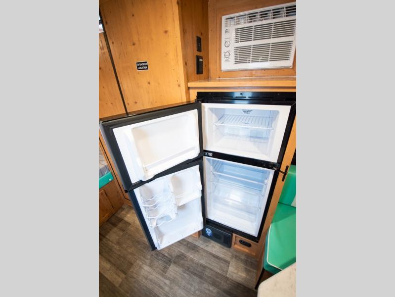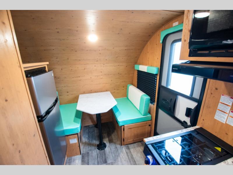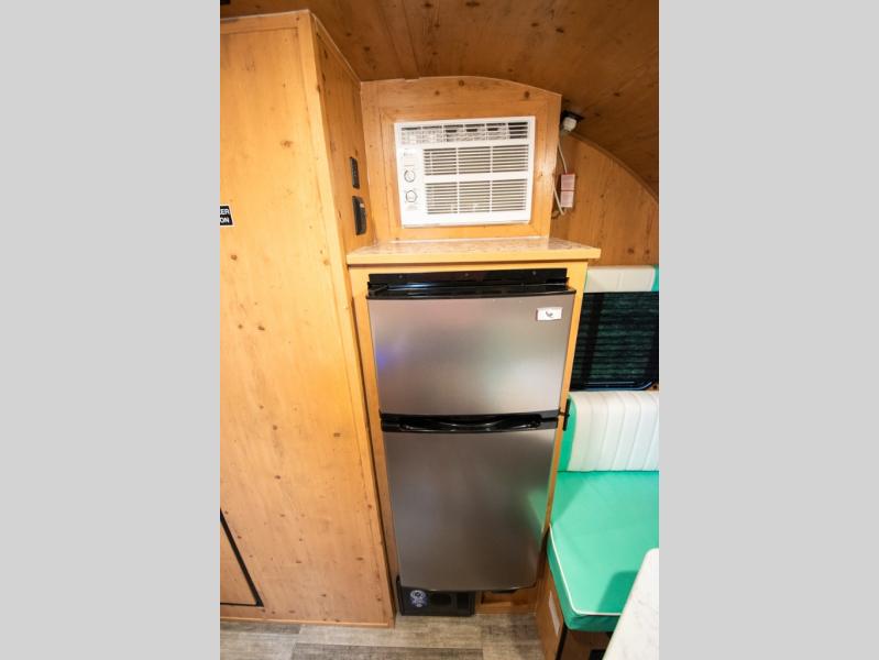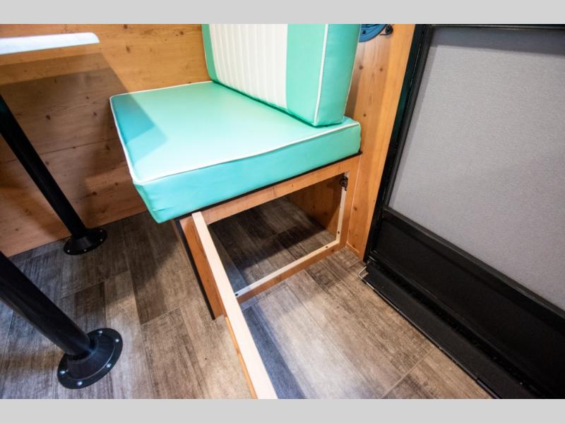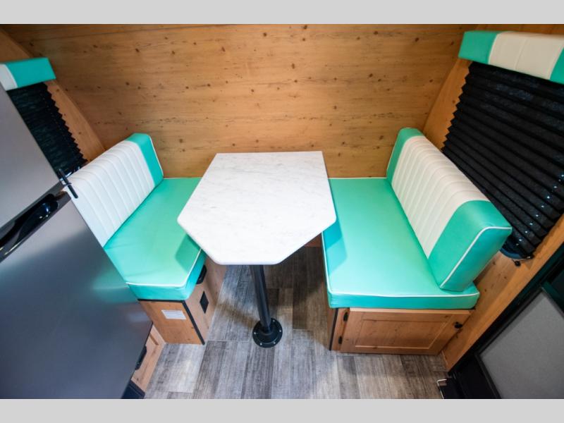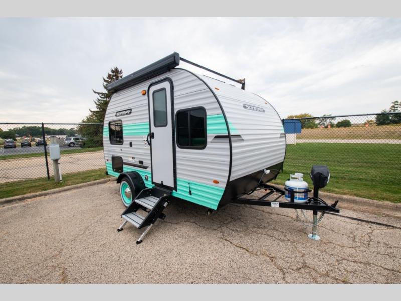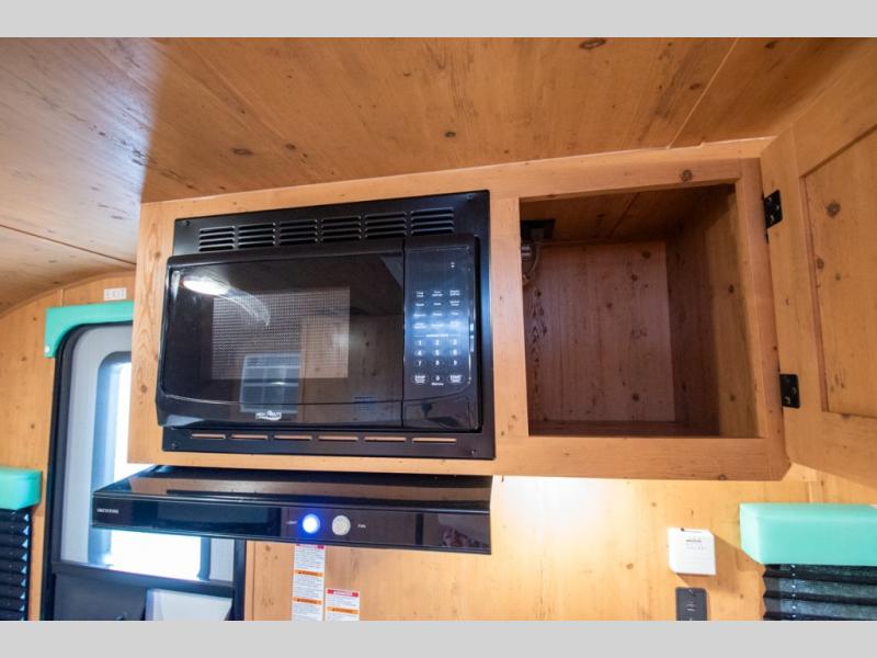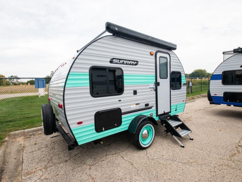 This Sunray travel trailer is the largest and most accommodating because it comes with a wet bath so that you can even take a shower in your trailer! There is a small kitchen on the interior that comes with a two-burner stove top, a refrigerator, and a microwave so that you can cook dinner without having to start a fire, and since it is indoors, you will be able to keep the bugs away while you prepare something delicious to eat. If you need to rinse off some gear, the outside shower will be especially useful, and if you need to charge your devices, use the USB ports. You will also find a Winegard HDTV antenna on this model. Add the available Classic option for 14" tires instead of the off-road version, color matching rims with Moon Caps, and Retro decor and Diner-Style countertops.