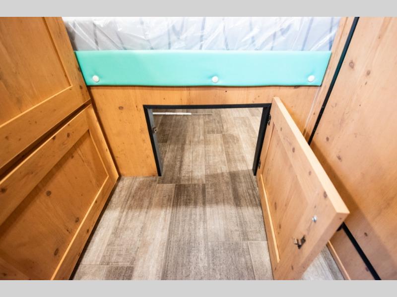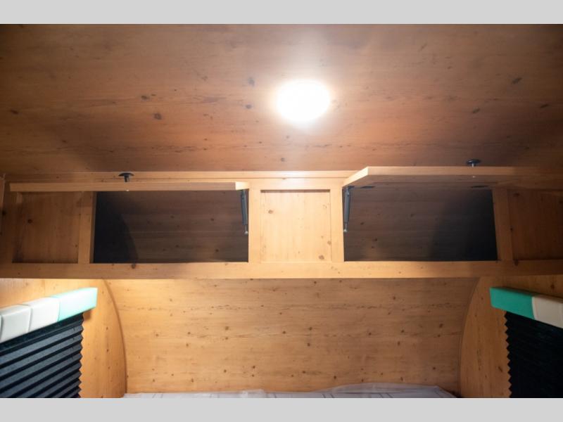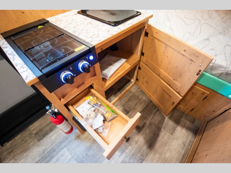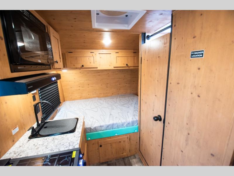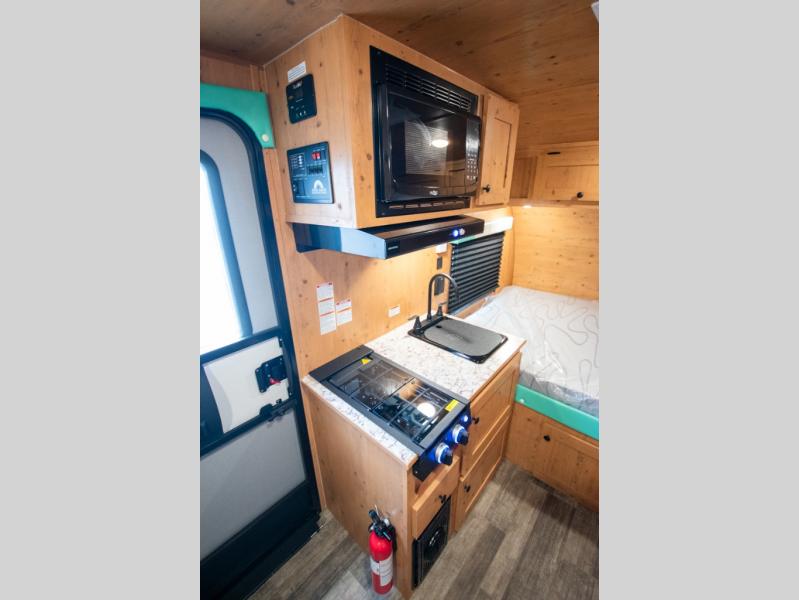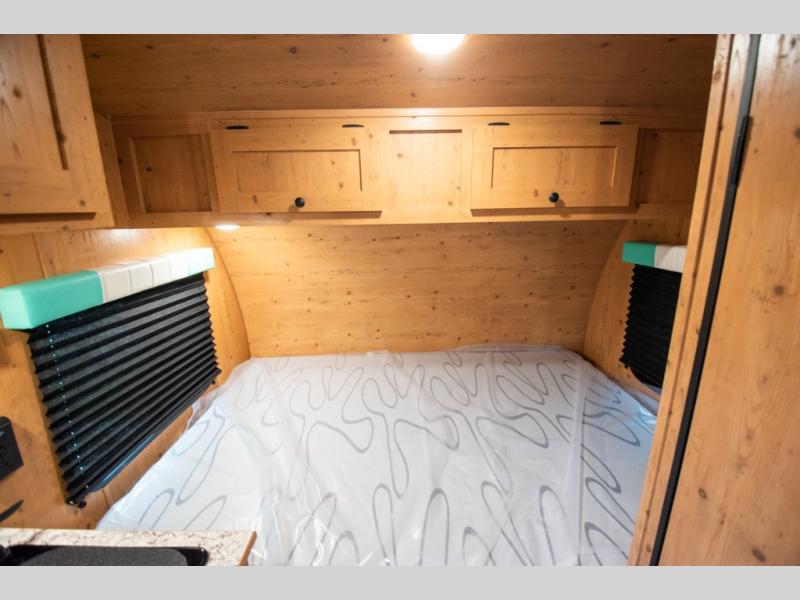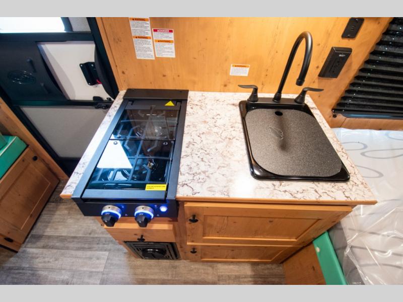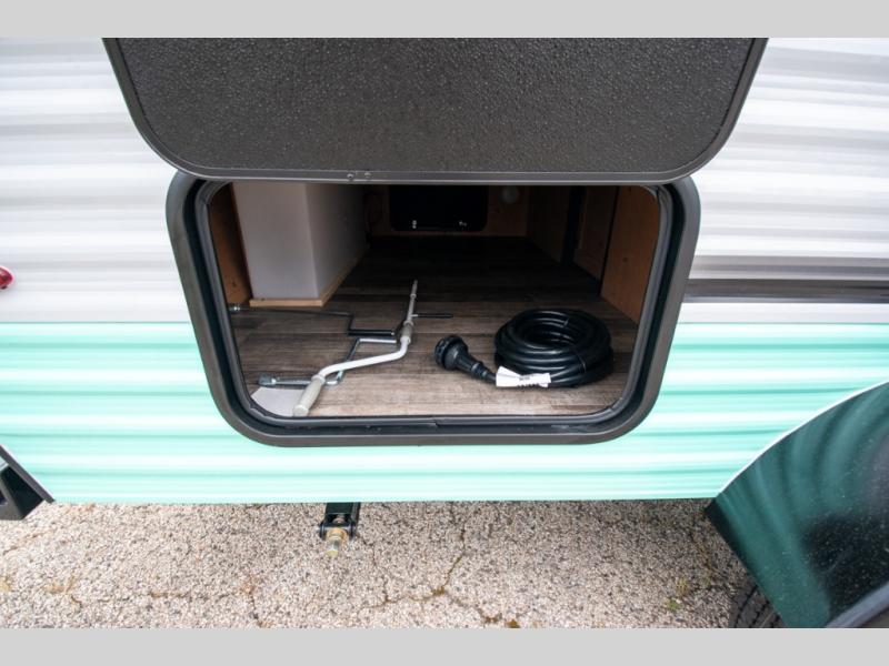 This Sunray travel trailer is the largest and most accommodating because it comes with a wet bath so that you can even take a shower in your trailer! There is a small kitchen on the interior that comes with a two-burner stove top, a refrigerator, and a microwave so that you can cook dinner without having to start a fire, and since it is indoors, you will be able to keep the bugs away while you prepare something delicious to eat. If you need to rinse off some gear, the outside shower will be especially useful, and if you need to charge your devices, use the USB ports. You will also find a Winegard HDTV antenna on this model. Add the available Classic option for 14" tires instead of the off-road version, color matching rims with Moon Caps, and Retro decor and Diner-Style countertops.