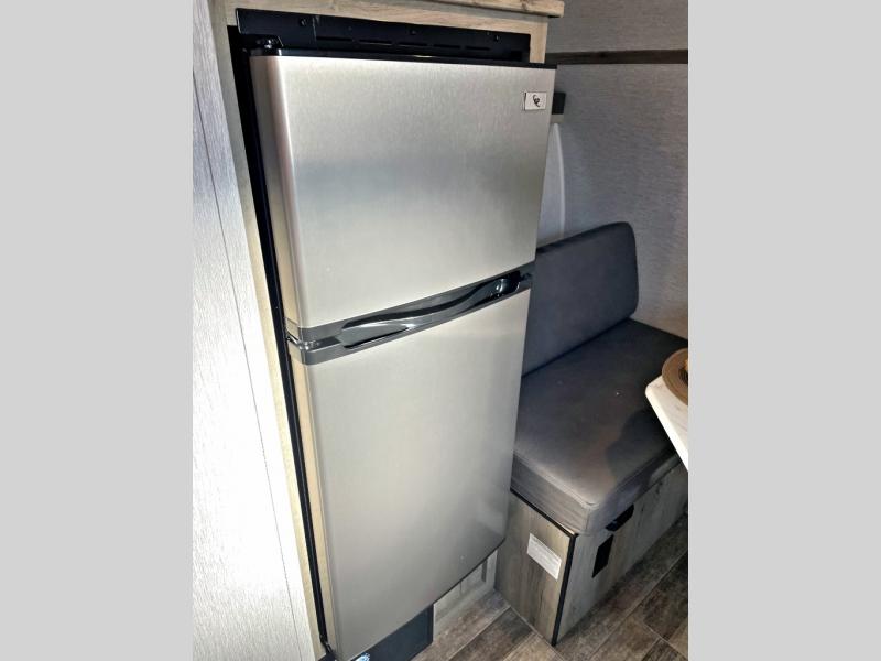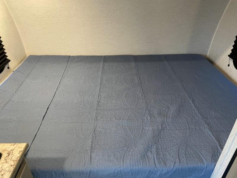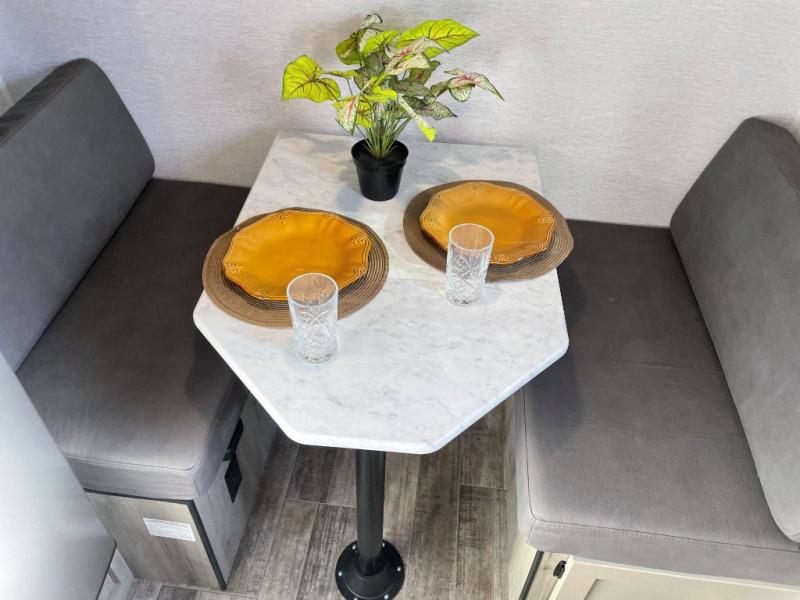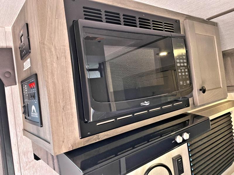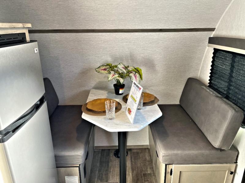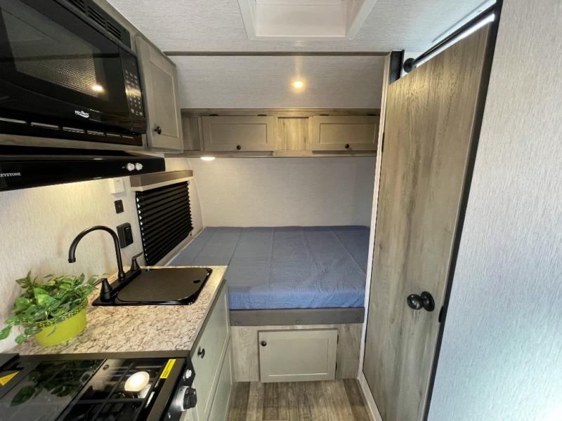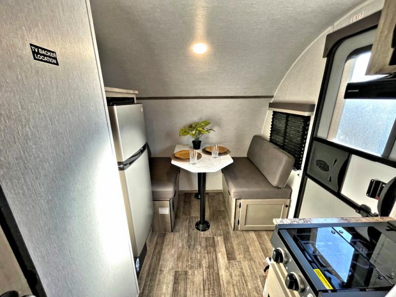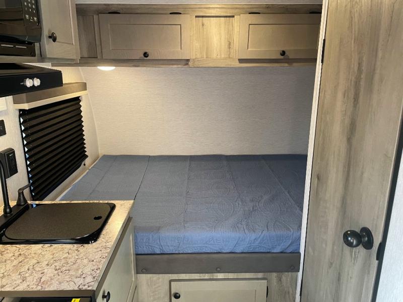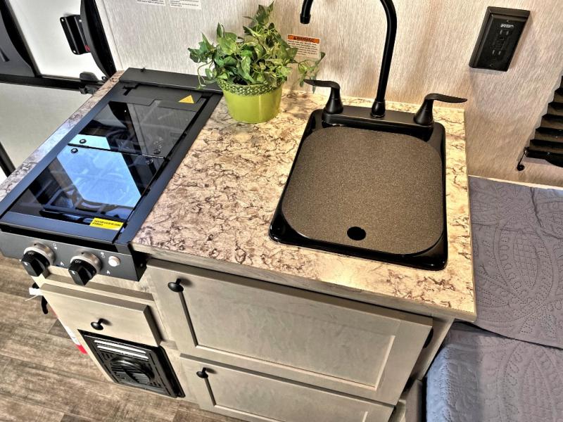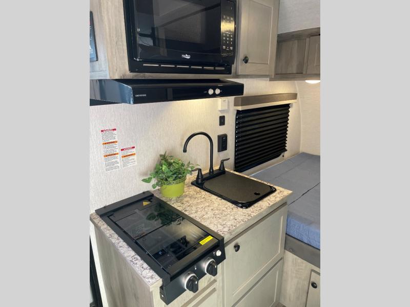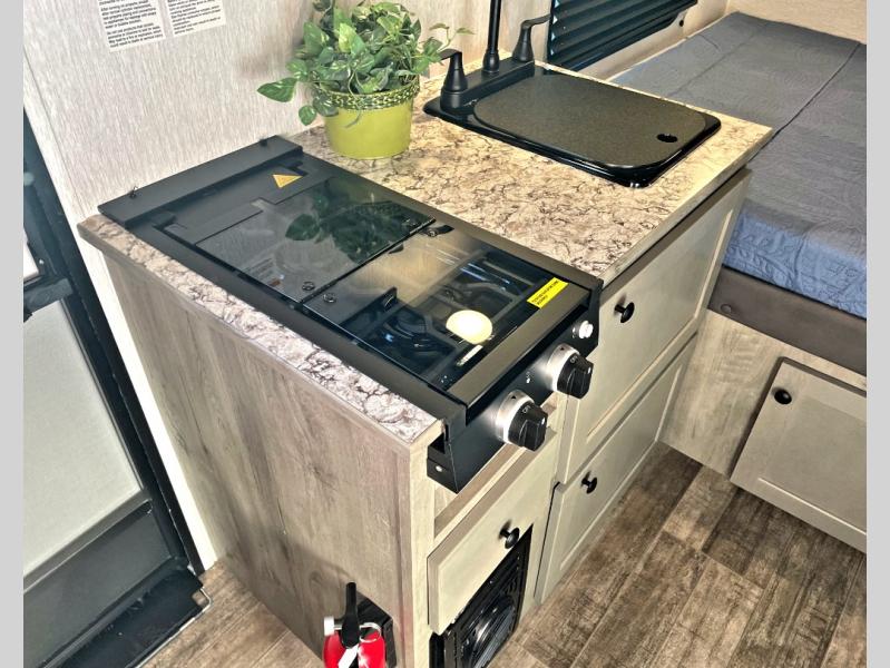 This Sunray travel trailer is the largest and most accommodating because it comes with a wet bath so that you can even take a shower in your trailer! There is a small kitchen on the interior that comes with a two-burner stove top, a refrigerator, and a microwave so that you can cook dinner without having to start a fire, and since it is indoors, you will be able to keep the bugs away while you prepare something delicious to eat. If you need to rinse off some gear, the outside shower will be especially useful, and if you need to charge your devices, use the USB ports. You will also find a Winegard HDTV antenna on this model. Add the available Classic option for 14" tires instead of the off-road version, color matching rims with Moon Caps, and Retro decor and Diner-Style countertops.