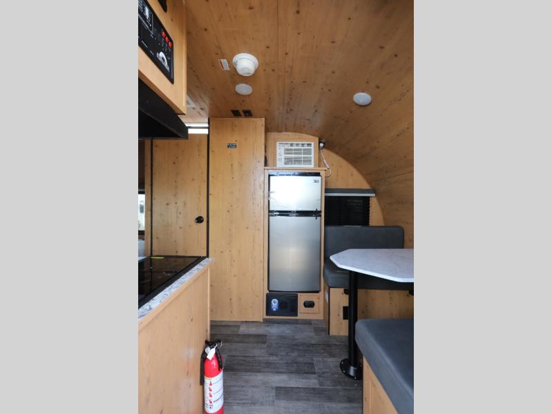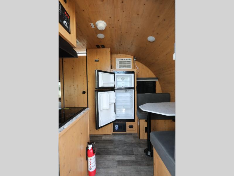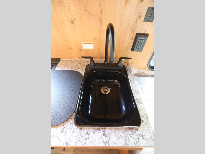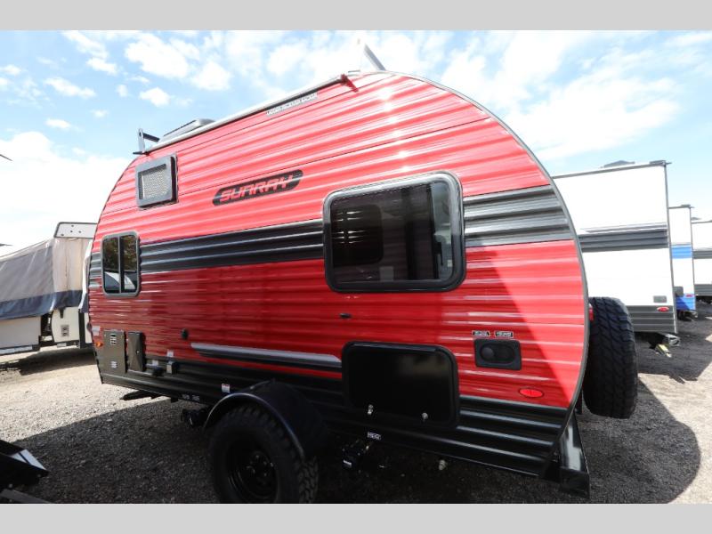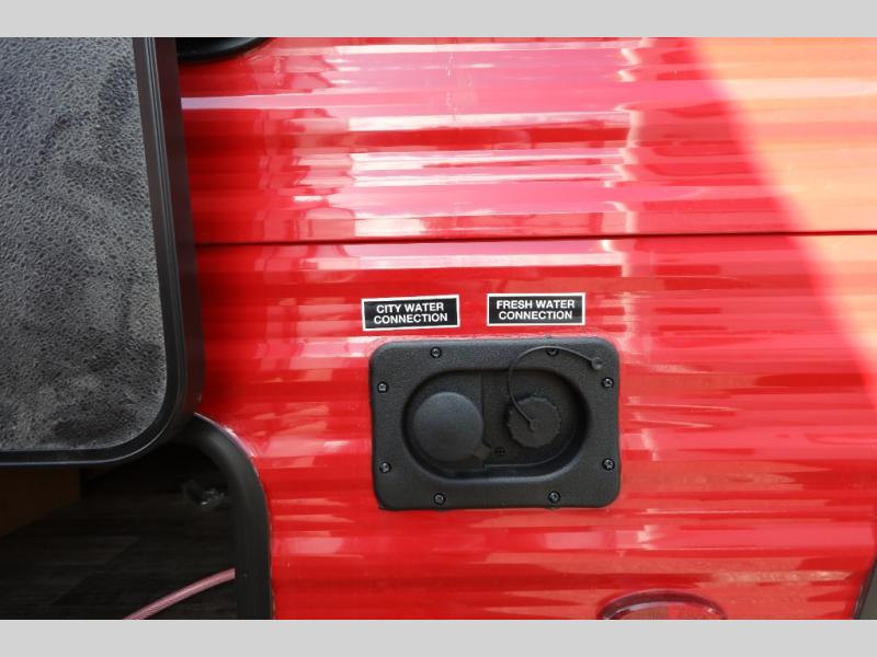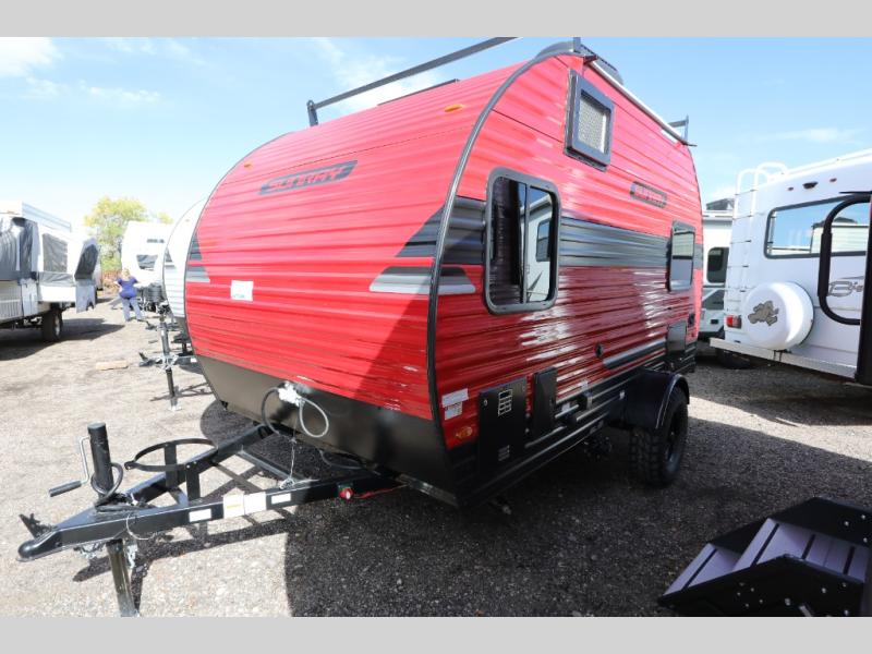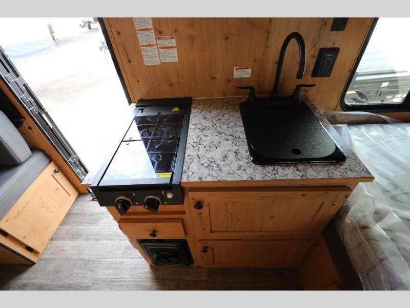 This Sunray travel trailer is the largest and most accommodating because it comes with a wet bath so that you can even take a shower in your trailer! There is a small kitchen on the interior that comes with a two-burner stove top, a refrigerator, and a microwave so that you can cook dinner without having to start a fire, and since it is indoors, you will be able to keep the bugs away while you prepare something delicious to eat. If you need to rinse off some gear, the outside shower will be especially useful, and if you need to charge your devices, use the USB ports. You will also find a Winegard HDTV antenna on this model. Add the available Classic option for 14" tires instead of the off-road version, color matching rims with Moon Caps, and Retro decor and Diner-Style countertops.