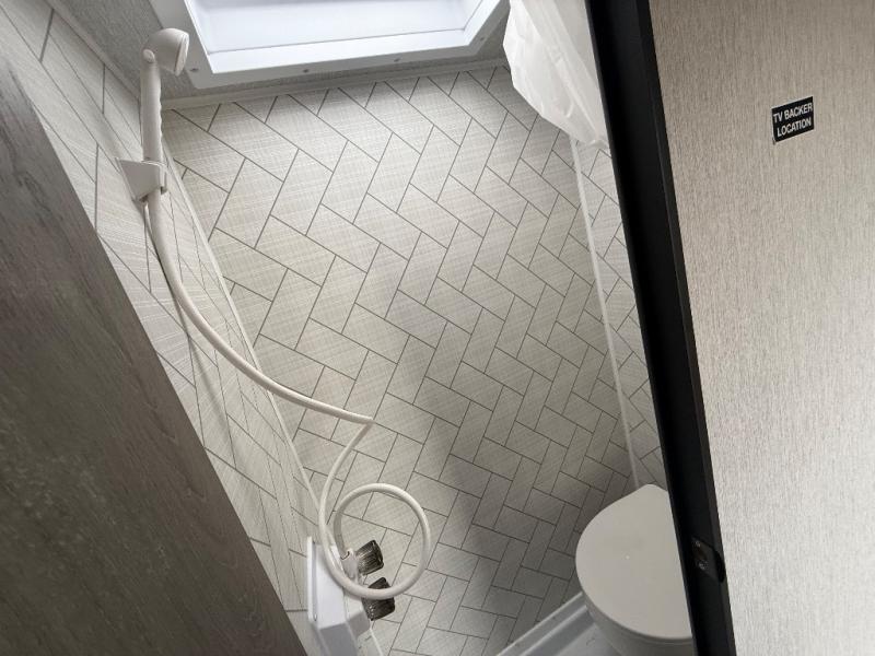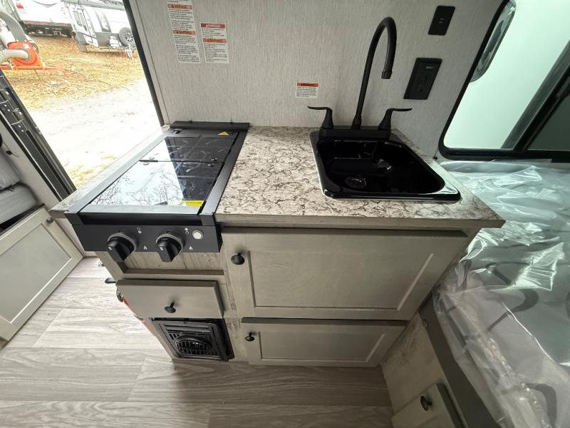 This Sunray travel trailer is the largest and most accommodating because it comes with a wet bath so that you can even take a shower in your trailer! There is a small kitchen on the interior that comes with a two-burner stove top, a refrigerator, and a microwave so that you can cook dinner without having to start a fire, and since it is indoors, you will be able to keep the bugs away while you prepare something delicious to eat. If you need to rinse off some gear, the outside shower will be especially useful, and if you need to charge your devices, use the USB ports. You will also find a Winegard HDTV antenna on this model. Add the available Classic option for 14" tires instead of the off-road version, color matching rims with Moon Caps, and Retro decor and Diner-Style countertops.