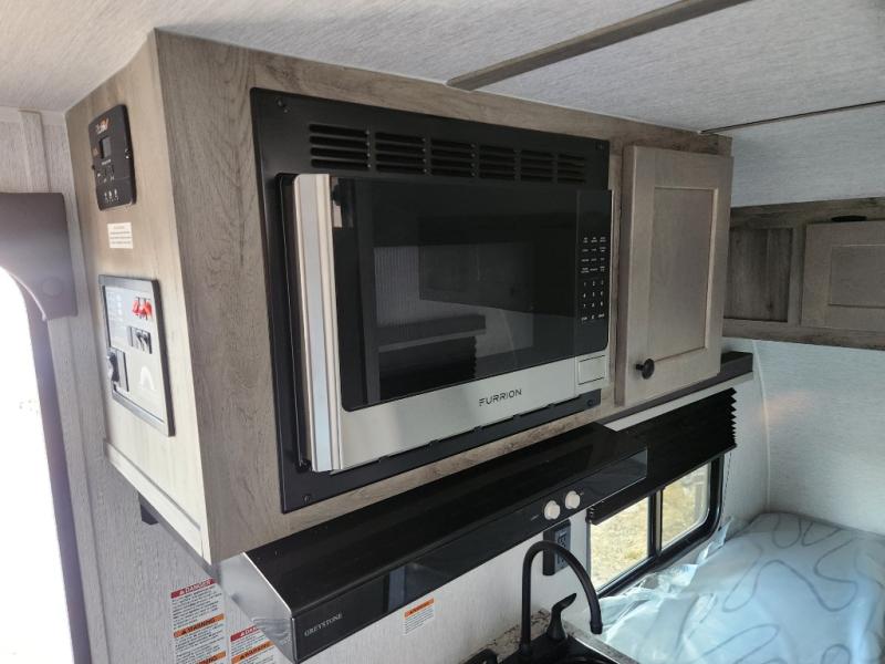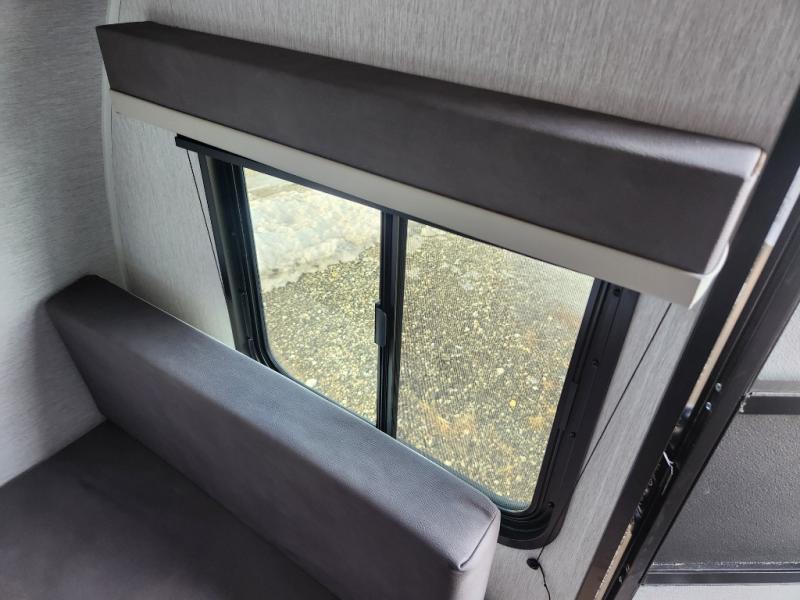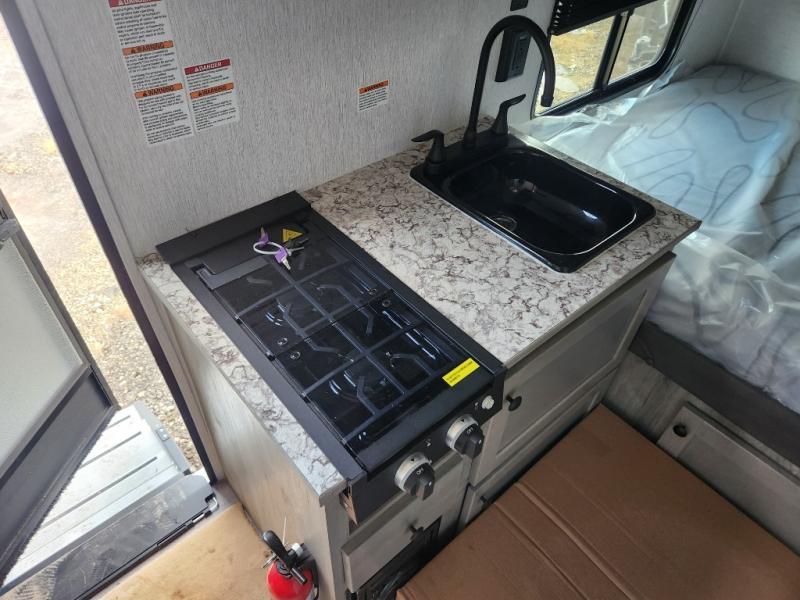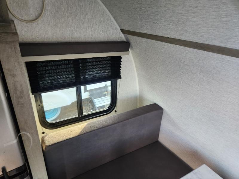 This Sunray travel trailer is the largest and most accommodating because it comes with a wet bath so that you can even take a shower in your trailer! There is a small kitchen on the interior that comes with a two-burner stove top, a refrigerator, and a microwave so that you can cook dinner without having to start a fire, and since it is indoors, you will be able to keep the bugs away while you prepare something delicious to eat. If you need to rinse off some gear, the outside shower will be especially useful, and if you need to charge your devices, use the USB ports. You will also find a Winegard HDTV antenna on this model. Add the available Classic option for 14" tires instead of the off-road version, color matching rims with Moon Caps, and Retro decor and Diner-Style countertops.