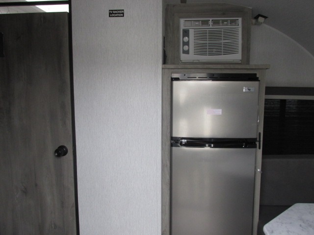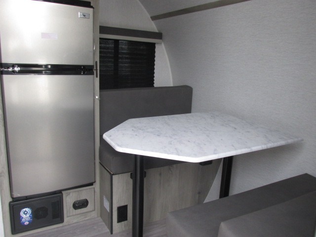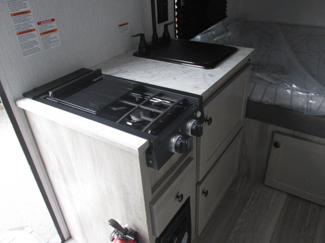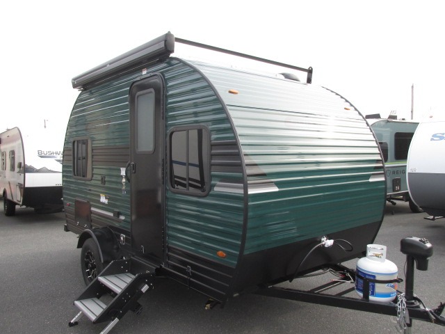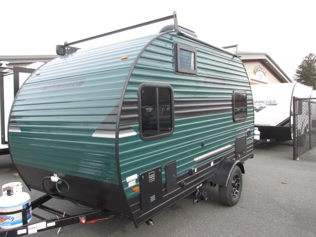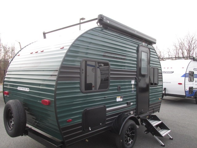 This Sunray travel trailer is the largest and most accommodating because it comes with a wet bath so that you can even take a shower in your trailer! There is a small kitchen on the interior that comes with a two-burner stove top, a refrigerator, and a microwave so that you can cook dinner without having to start a fire, and since it is indoors, you will be able to keep the bugs away while you prepare something delicious to eat. If you need to rinse off some gear, the outside shower will be especially useful, and if you need to charge your devices, use the USB ports. You will also find a Winegard HDTV antenna on this model. Add the available Classic option for 14" tires instead of the off-road version, color matching rims with Moon Caps, and Retro decor and Diner-Style countertops.