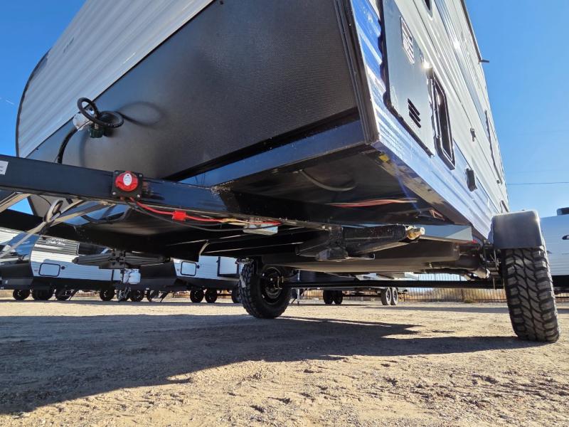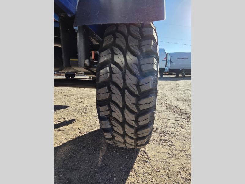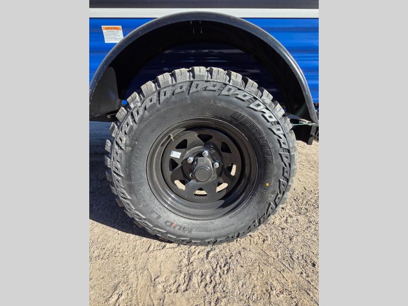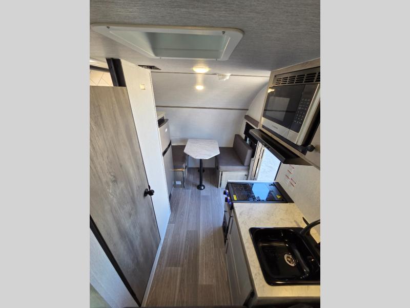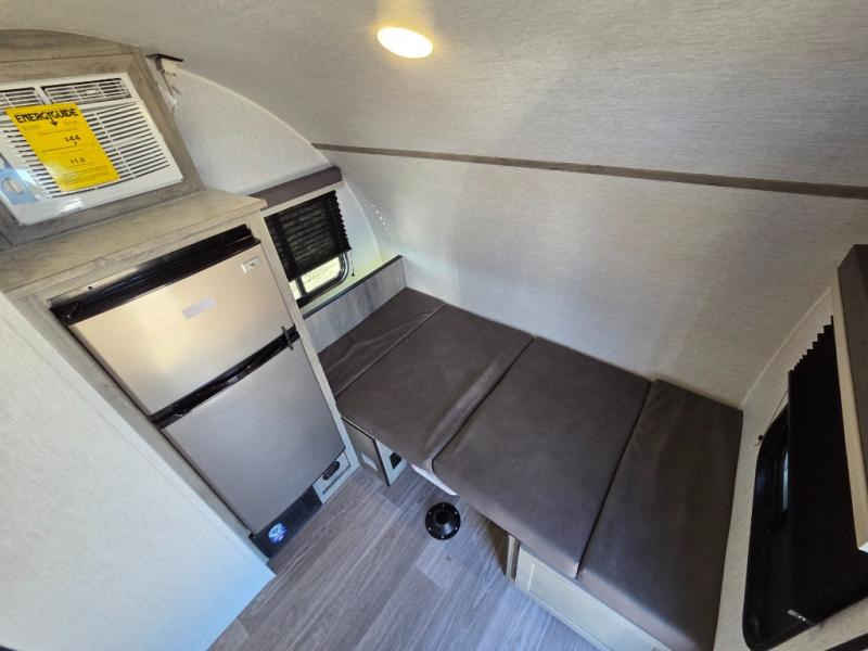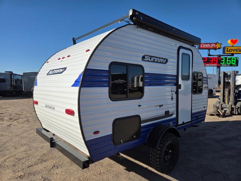 This Sunray travel trailer is the largest and most accommodating because it comes with a wet bath so that you can even take a shower in your trailer! There is a small kitchen on the interior that comes with a two-burner stove top, a refrigerator, and a microwave so that you can cook dinner without having to start a fire, and since it is indoors, you will be able to keep the bugs away while you prepare something delicious to eat. If you need to rinse off some gear, the outside shower will be especially useful, and if you need to charge your devices, use the USB ports. You will also find a Winegard HDTV antenna on this model. Add the available Classic option for 14" tires instead of the off-road version, color matching rims with Moon Caps, and Retro decor and Diner-Style countertops.