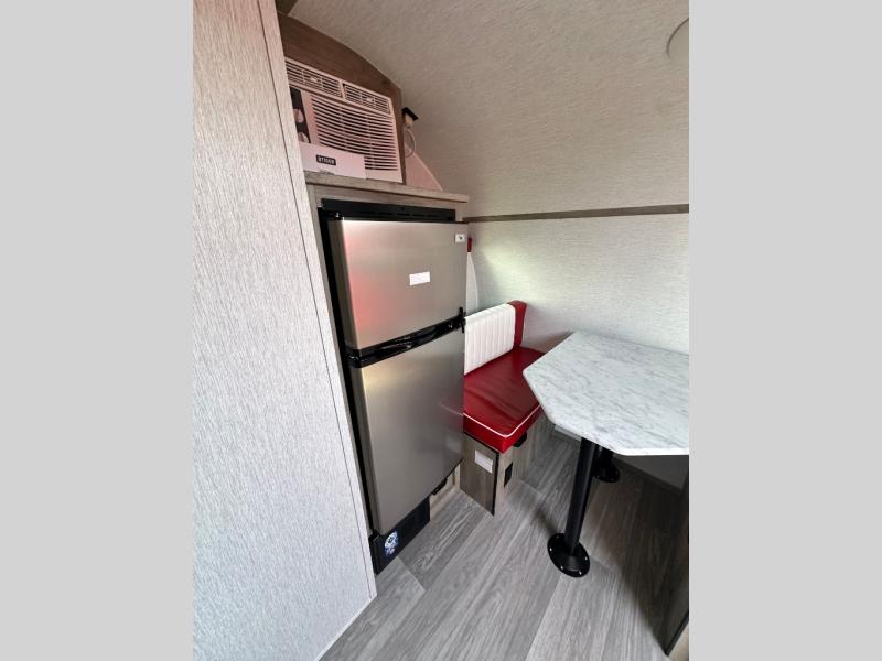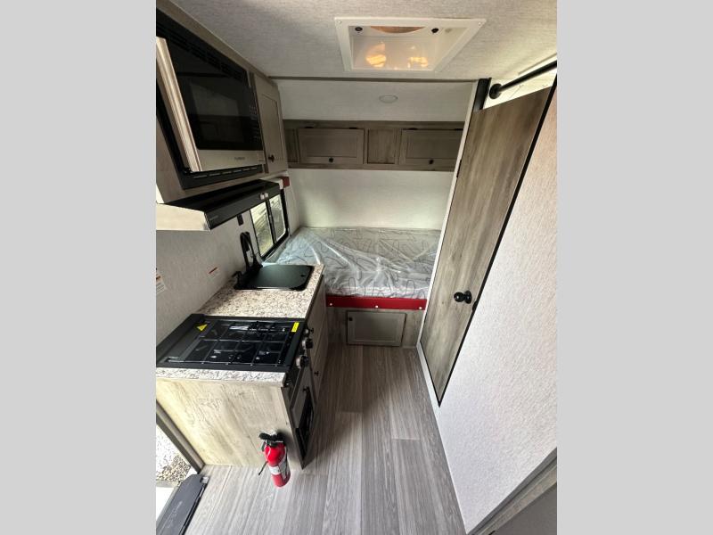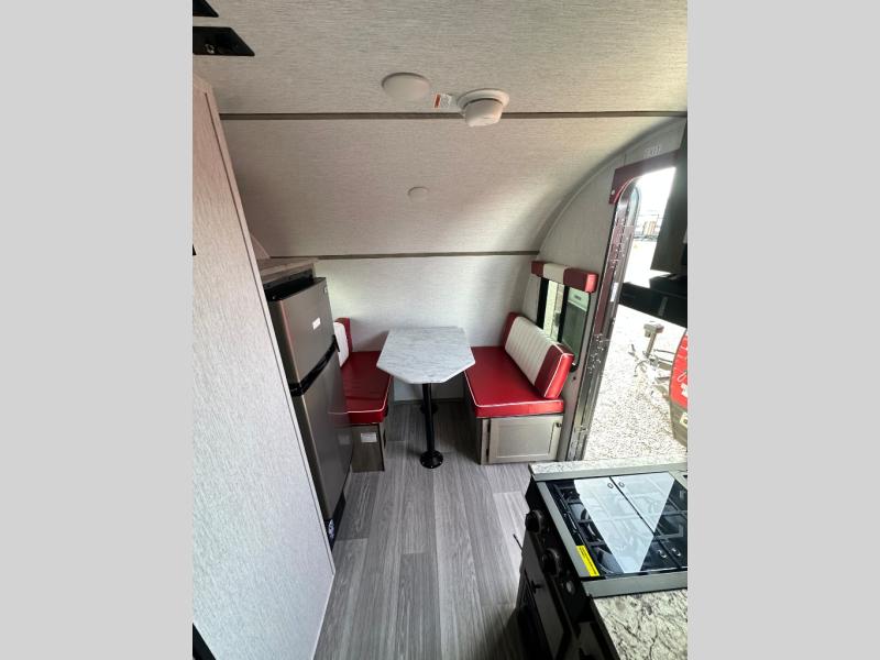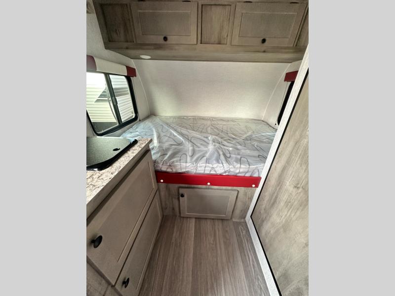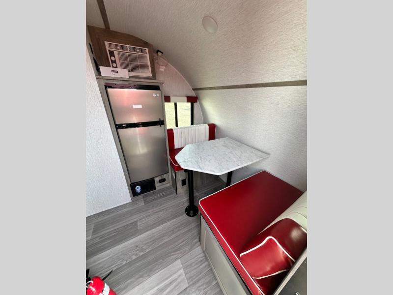 This Sunray travel trailer is the largest and most accommodating because it comes with a wet bath so that you can even take a shower in your trailer! There is a small kitchen on the interior that comes with a two-burner stove top, a refrigerator, and a microwave so that you can cook dinner without having to start a fire, and since it is indoors, you will be able to keep the bugs away while you prepare something delicious to eat. If you need to rinse off some gear, the outside shower will be especially useful, and if you need to charge your devices, use the USB ports. You will also find a Winegard HDTV antenna on this model. Add the available Classic option for 14" tires instead of the off-road version, color matching rims with Moon Caps, and Retro decor and Diner-Style countertops.