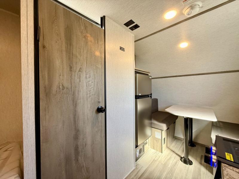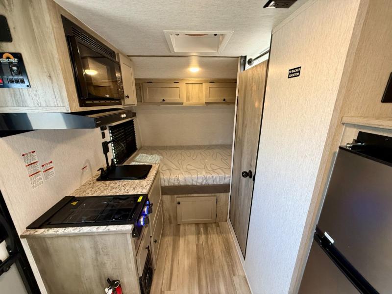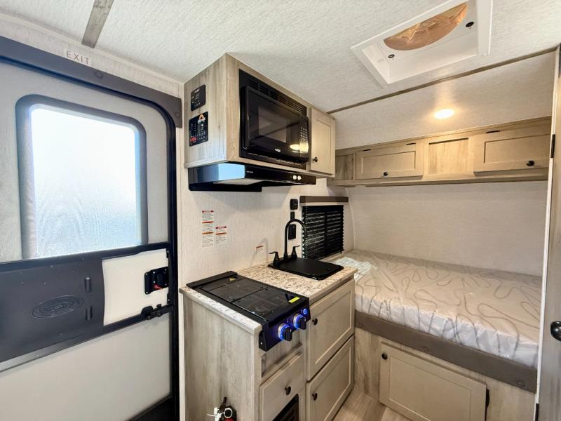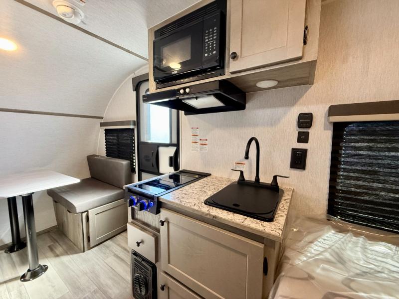 This Sunray travel trailer is the largest and most accommodating because it comes with a wet bath so that you can even take a shower in your trailer! There is a small kitchen on the interior that comes with a two-burner stove top, a refrigerator, and a microwave so that you can cook dinner without having to start a fire, and since it is indoors, you will be able to keep the bugs away while you prepare something delicious to eat. If you need to rinse off some gear, the outside shower will be especially useful, and if you need to charge your devices, use the USB ports. You will also find a Winegard HDTV antenna on this model. Add the available Classic option for 14" tires instead of the off-road version, color matching rims with Moon Caps, and Retro decor and Diner-Style countertops.