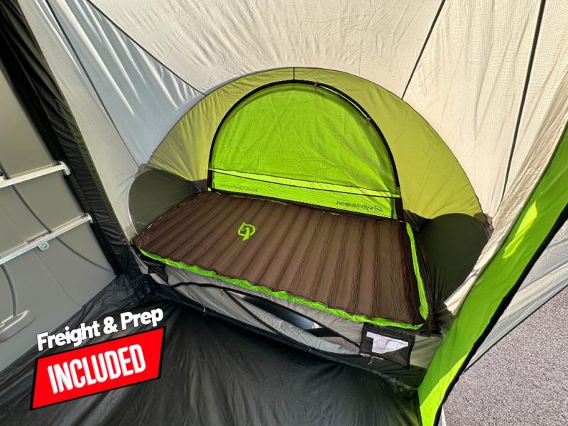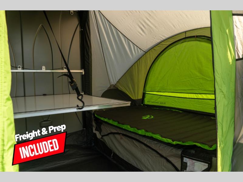 The 2025 SylvanSport GO All Out is a highly versatile and innovative pop-up camper known for its lightweight design, multifunctionality, and durability. It weighs just 840 lbs, making it easy to tow with most vehicles. The camper features a flexible interior that can accommodate up to four people with included Cloud Layer air mattresses and a spacious tent setup. Additional amenities include the GOzeebo tent/screen room, Dine O Max camp kitchen, solar kit, and ample storage options.