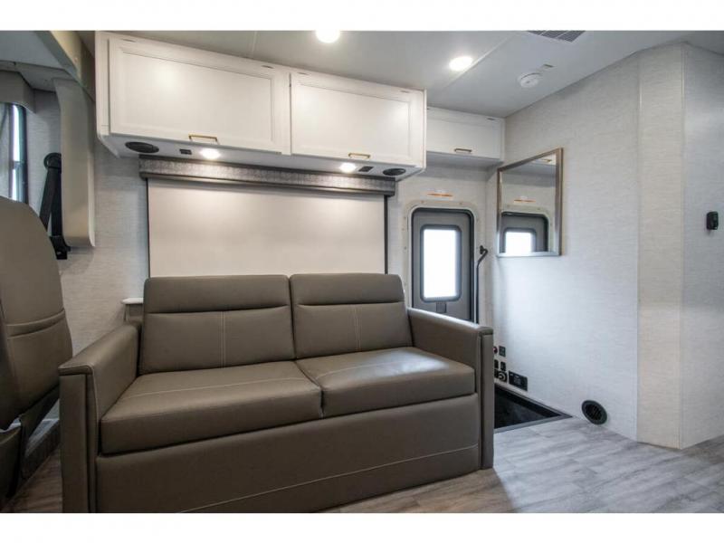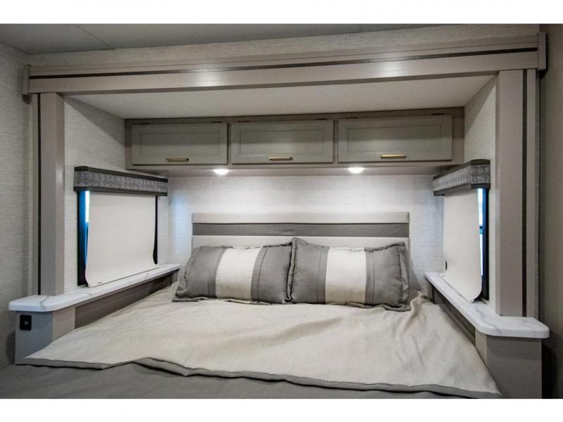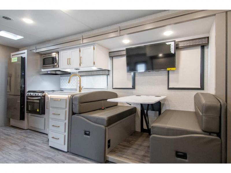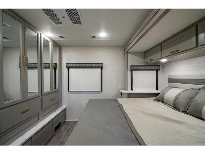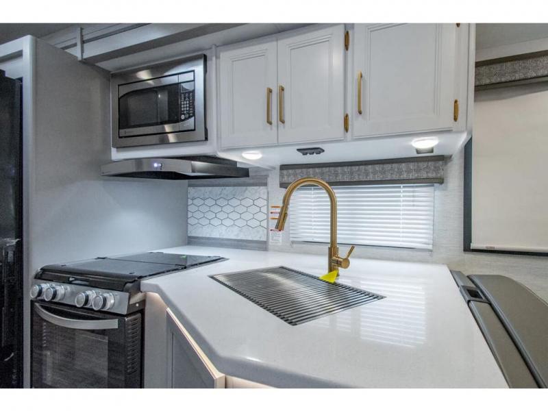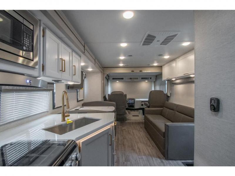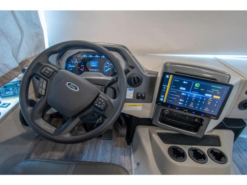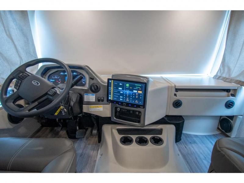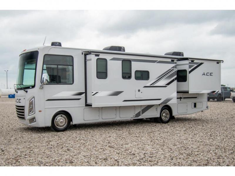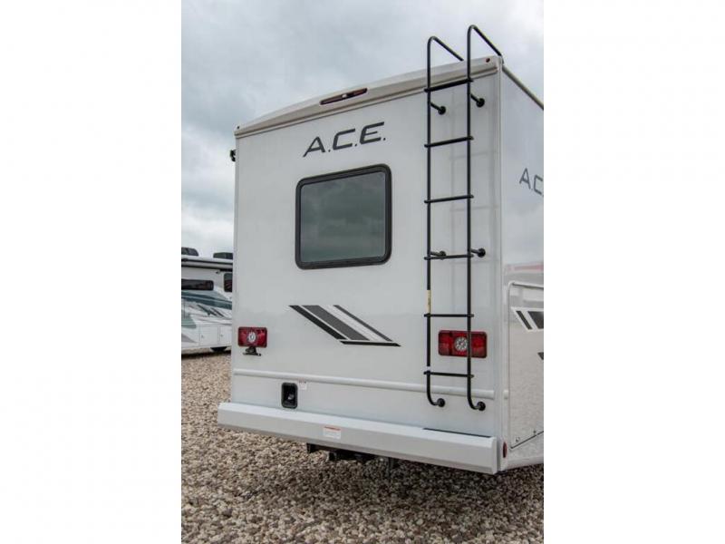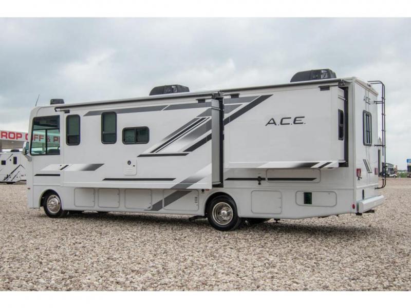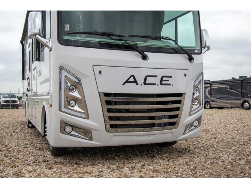 The A.C.E Class A gas motorhome is constructed with a welded tubular steel floor, vacu-bond laminated roof, walls and floor with block foam insulation, and a premium one-piece exterior roof for a coach made to last. You will love the pet-friendly features, like the Bird's Eye window, the Pet-Link multi-purpose tie-down and the Pull-Out Kibble Station with an FDS approved pet bowl liner. Each model includes an Onan RV QG 4,000 gas generator, a Winegard ConnecT Wi-Fi extender +4G, and are pre-wired for solar charging. Some of the other convenient amenities you will find on the A.C.E are framed windows, a basement pass-through storage, and an exterior LP connection. Head inside to find residential vinyl flooring, pressed laminate countertops, glass tile backsplash in the kitchen, and a wireless phone charger!