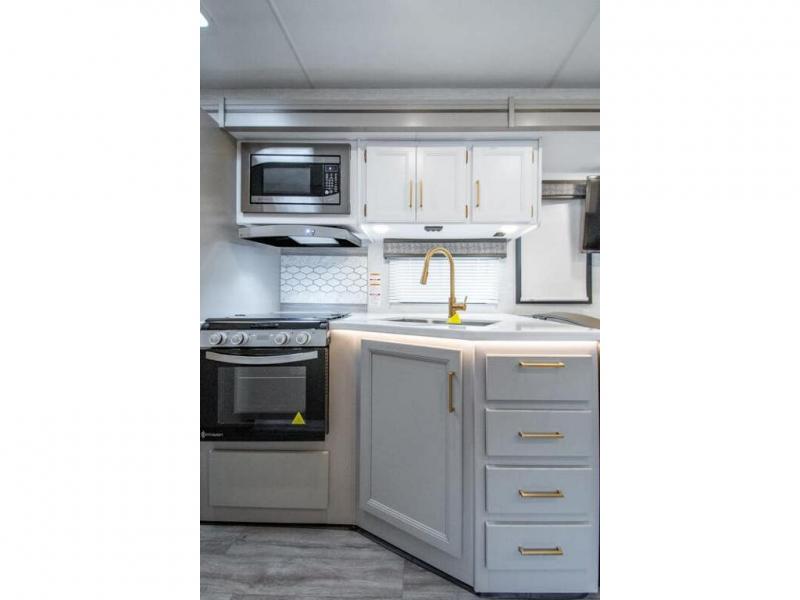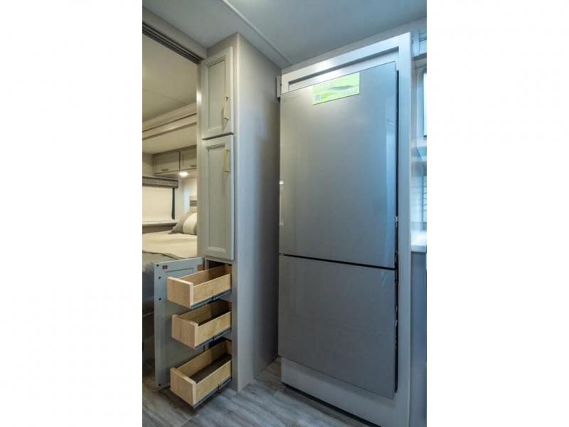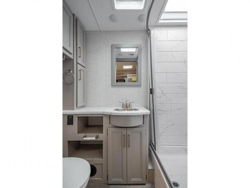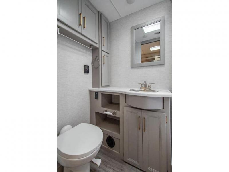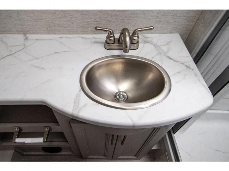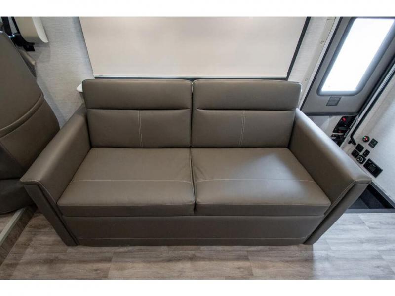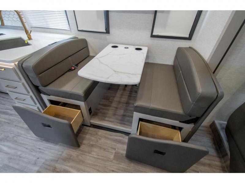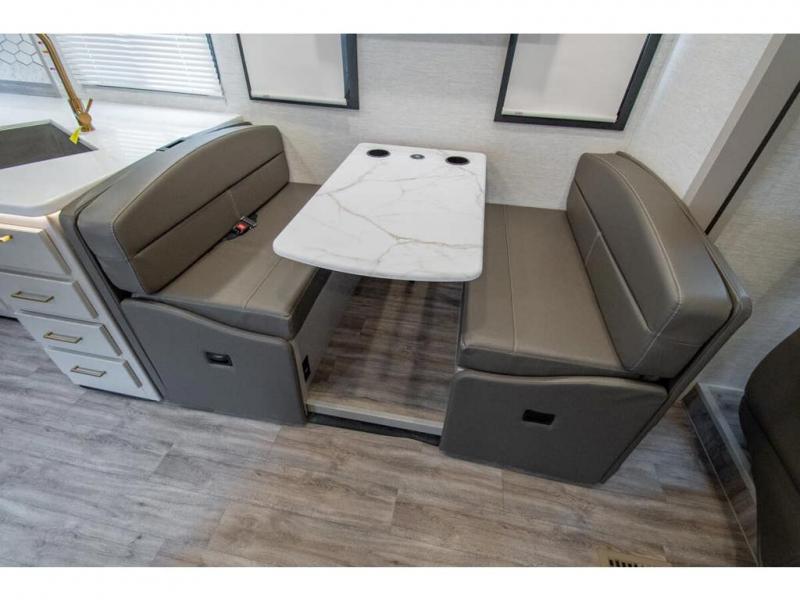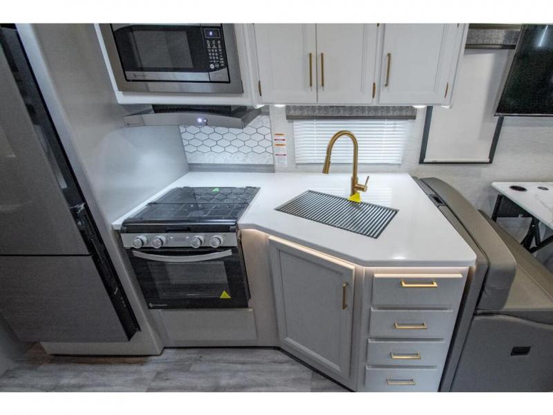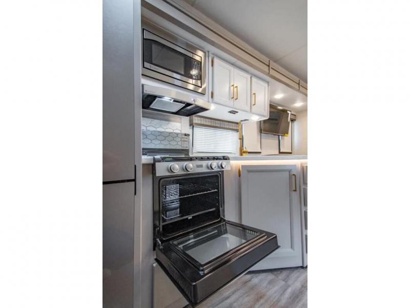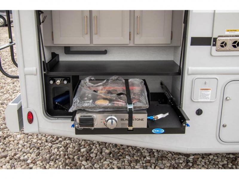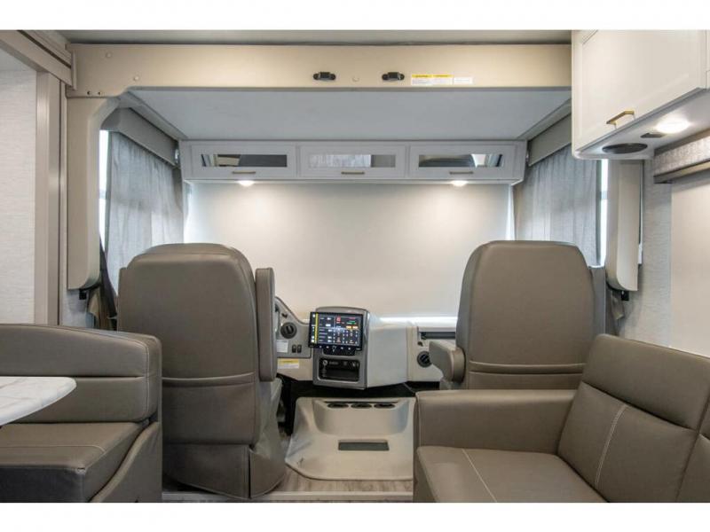 The A.C.E Class A gas motorhome is constructed with a welded tubular steel floor, vacu-bond laminated roof, walls and floor with block foam insulation, and a premium one-piece exterior roof for a coach made to last. You will love the pet-friendly features, like the Bird's Eye window, the Pet-Link multi-purpose tie-down and the Pull-Out Kibble Station with an FDS approved pet bowl liner. Each model includes an Onan RV QG 4,000 gas generator, a Winegard ConnecT Wi-Fi extender +4G, and are pre-wired for solar charging. Some of the other convenient amenities you will find on the A.C.E are framed windows, a basement pass-through storage, and an exterior LP connection. Head inside to find residential vinyl flooring, pressed laminate countertops, glass tile backsplash in the kitchen, and a wireless phone charger!