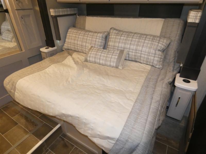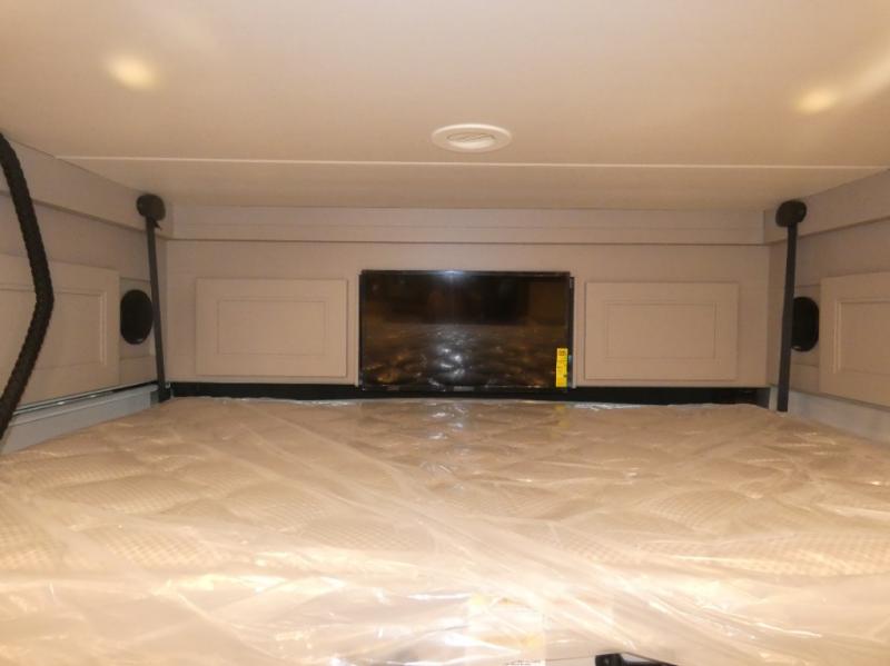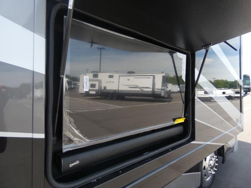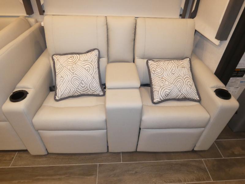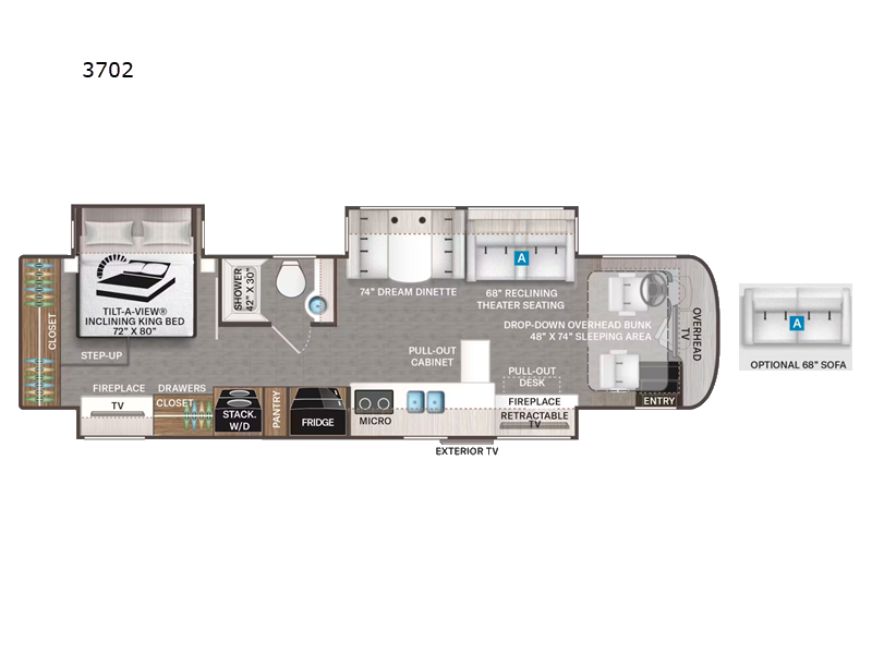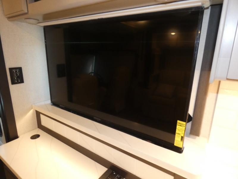You will love these motorhome characteristics! The rear bedroom is a tranquil sanctuary, boasting an inclining king bed and ample closet space for your finest attire. A lavish TV and a fireplace create a warm ambiance, while a convenient closet with drawers provides meticulous storage. The opulent full bathroom is fully equipped, with everything you need to freshen up. The great kitchen area features a spacious pantry, sleek fridge, microwave, and clever pull-out cabinet for effortless meal preparation. In addition, the expansive 74” dream dinette offers generous space for convivial meals and social gatherings, while the plush 68” reclining theater seating provides ultimate relaxation. In the living room area, a practical pull-out desk provides a dedicated workspace, and a roaring fireplace adds warmth and sophistication. A sleek retractable TV and convenient drop-down overhead bunk offer convenient and flexible entertainment options, plus an overhead TV adds to the lavish features of this motorhome.