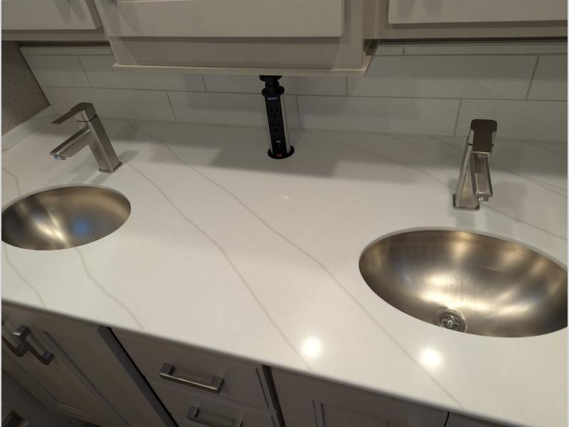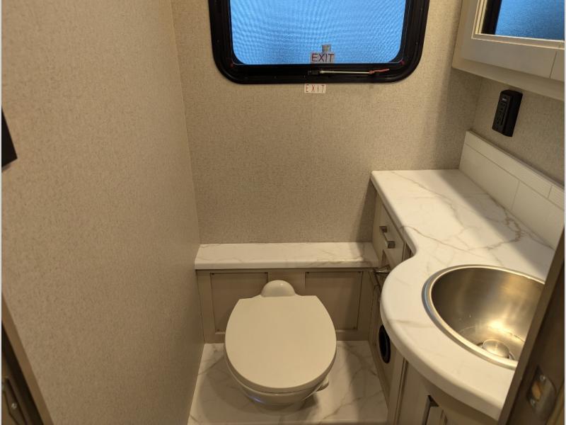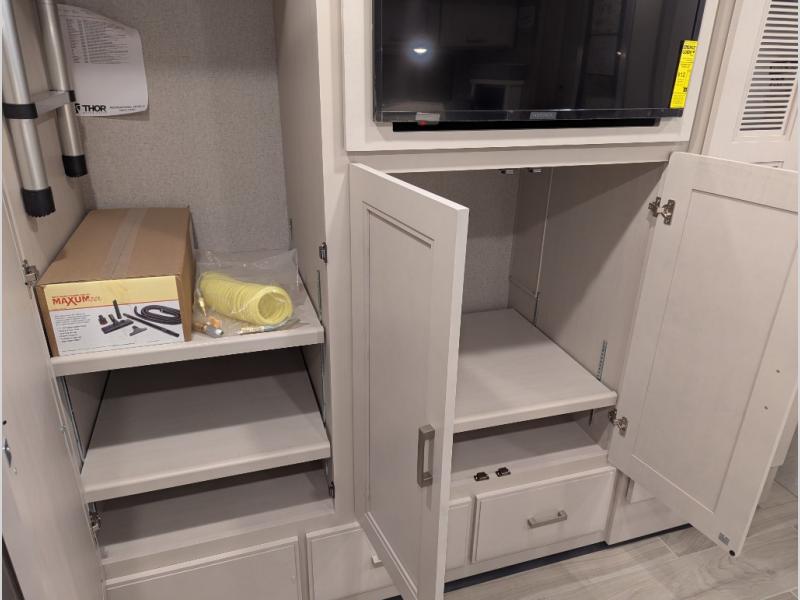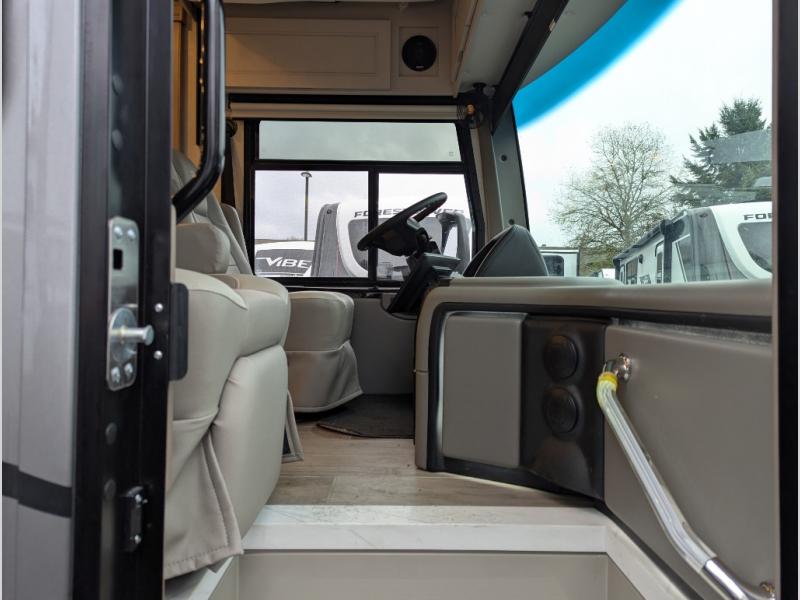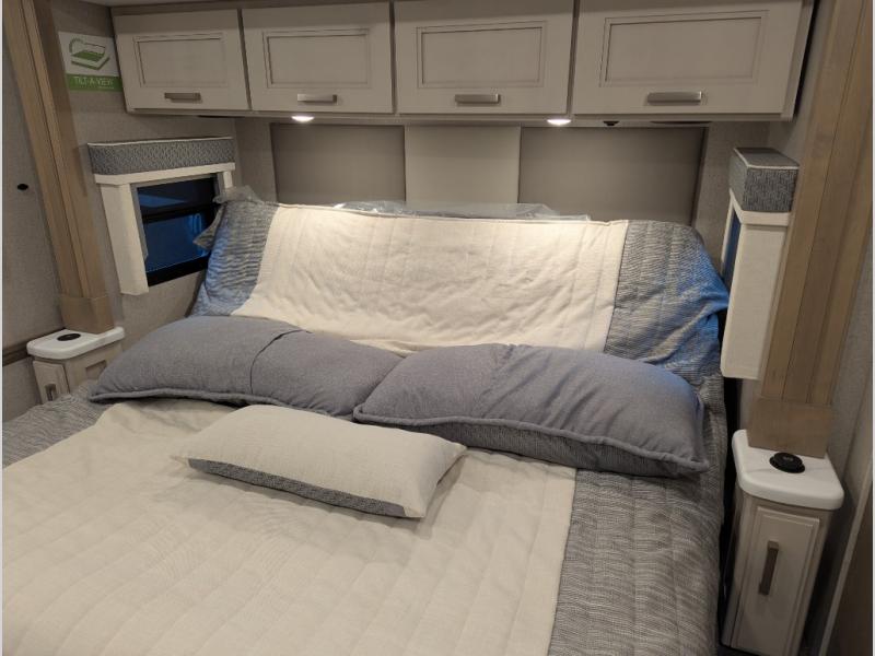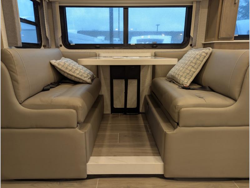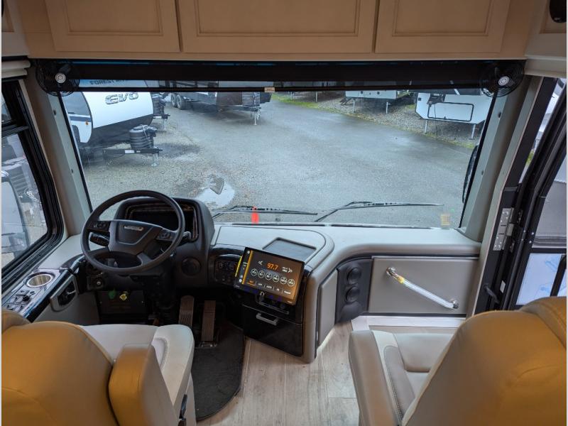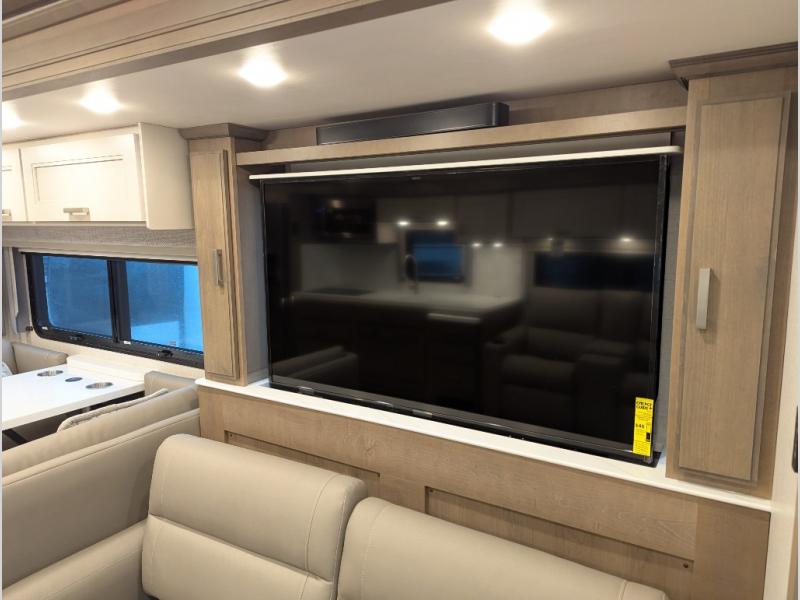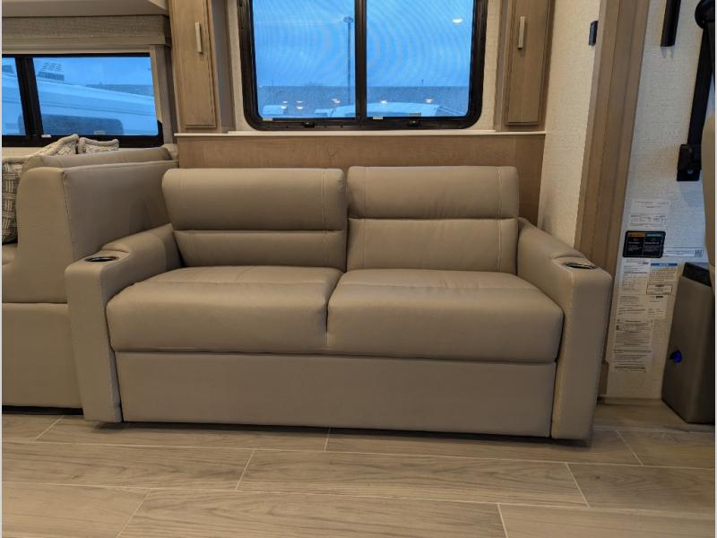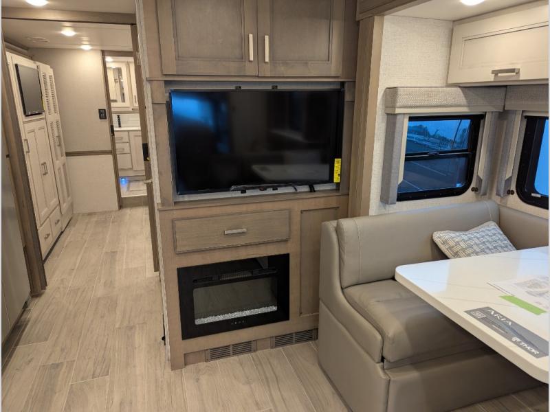 With any Aria Class A diesel motorhome by Thor Motor Coach, experience RV living with all the luxurious amenities you are accustom to, command the roadways with improved handling from the VFS front axle with a 55-degree wheel cut, and enjoy a smooth ride thanks to the Air-Ride suspension and Sachs shock absorbers. The driver will also appreciate the 10.1" touchscreen dash radio with Bluetooth, and Sirius/XM prep when navigating the roads, and the comfort of the leatherette reclining/swivel adjustable captain's chairs. The bathroom provides an oversized full height shower with a glass door and a designer backsplash, while the kitchen provides solid surface countertops and a dinette. You'll also enjoy designer tile backsplash, a large double bowl stainless steel sink with a single handle faucet, a pull-down sprayer, plus full kitchen amenities. More standout features include the Wyndham cabinetry with rake style cabinet doors & nickel finish hardware, plus much much more depending on the Aria you take on the road!