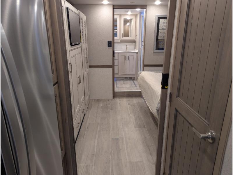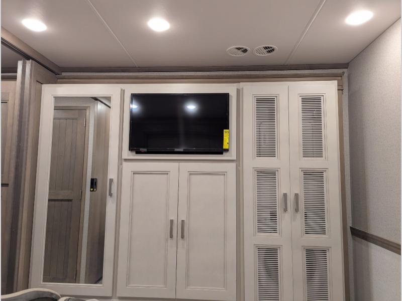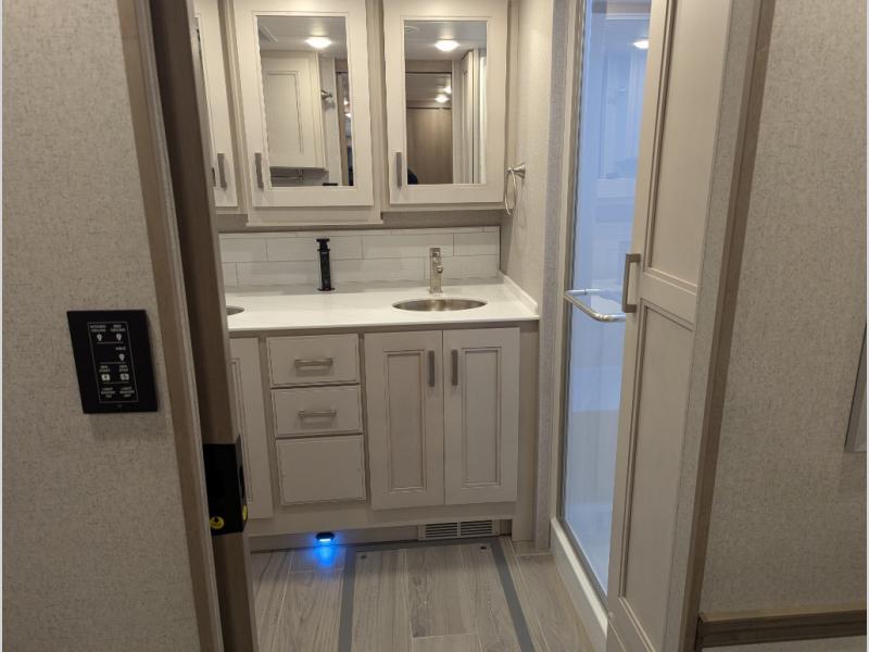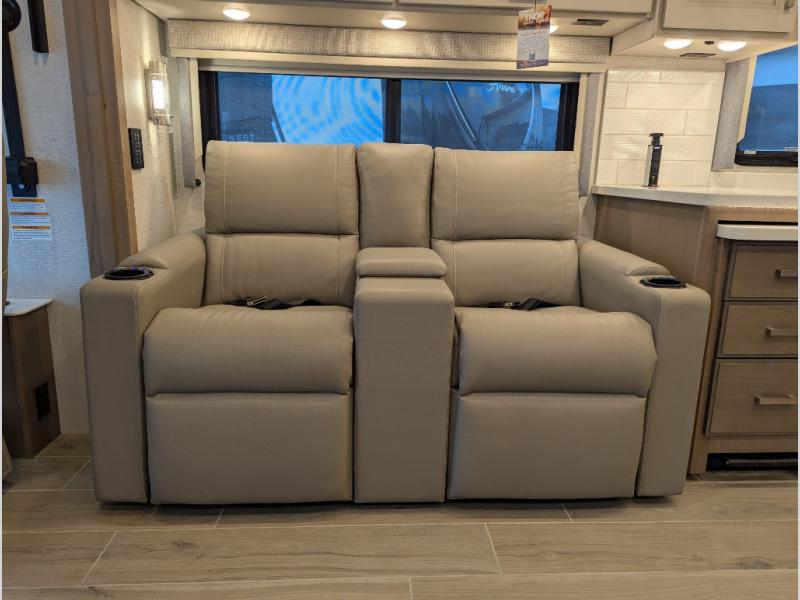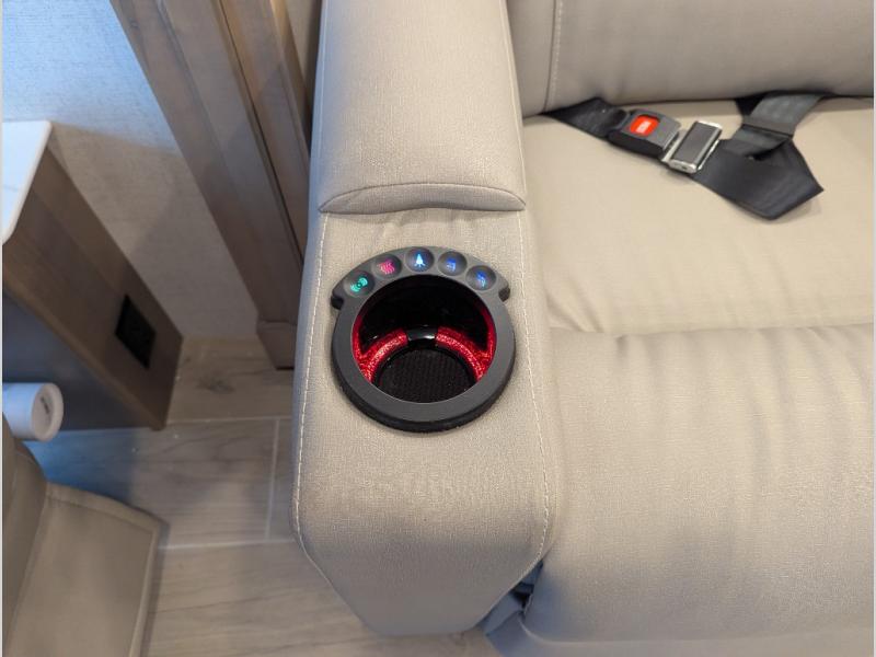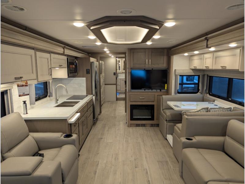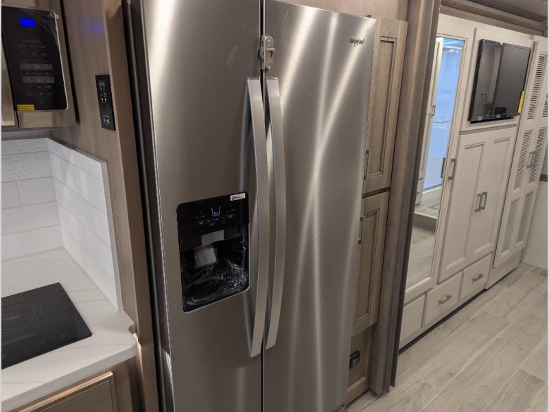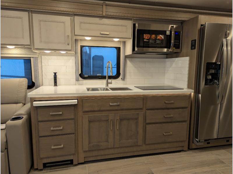 Convenience, comfort, and space can be found throughout this coach with a rear full bathroom with dual sinks and a mid-coach half bath, plus three slide outs, and captain's chairs that swivel. You can entertain your family and friends with all the seating and seatbelts that allow you to invite everyone. The Dream dinette, tri-fold sofa, and reclining theater seats are all great places to relax, unwind, and visit. Everyone will surely enjoy the fireplace and the two LED TVs in the living room. Cooking is made easy with a convection microwave oven and electric induction cooktop, plus there is a 21.4 double door residential refrigerator and a pantry for food storage. When you are ready to call it a night, the Tilt-A-View inclining king bed will be waiting in the walk-through bedroom that leads you to the full bathroom!