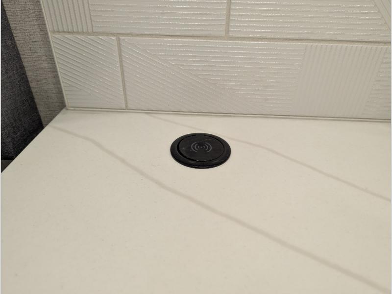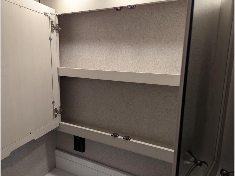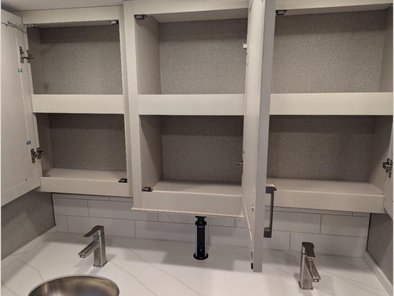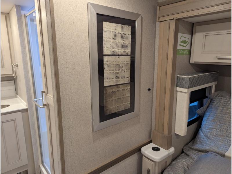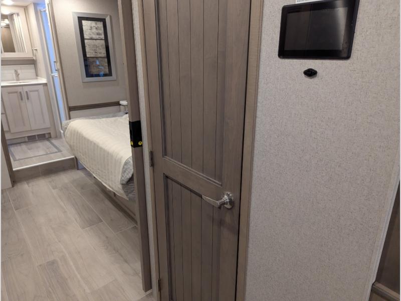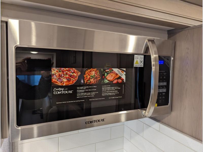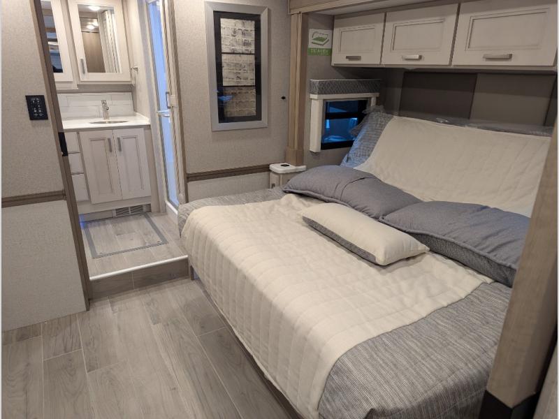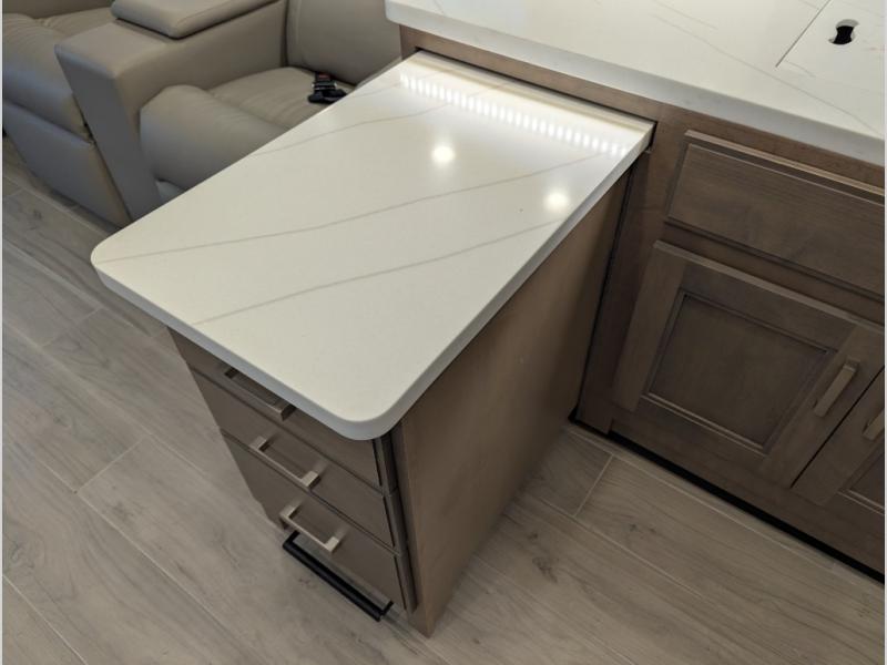 Convenience, comfort, and space can be found throughout this coach with a rear full bathroom with dual sinks and a mid-coach half bath, plus three slide outs, and captain's chairs that swivel. You can entertain your family and friends with all the seating and seatbelts that allow you to invite everyone. The Dream dinette, tri-fold sofa, and reclining theater seats are all great places to relax, unwind, and visit. Everyone will surely enjoy the fireplace and the two LED TVs in the living room. Cooking is made easy with a convection microwave oven and electric induction cooktop, plus there is a 21.4 double door residential refrigerator and a pantry for food storage. When you are ready to call it a night, the Tilt-A-View inclining king bed will be waiting in the walk-through bedroom that leads you to the full bathroom!