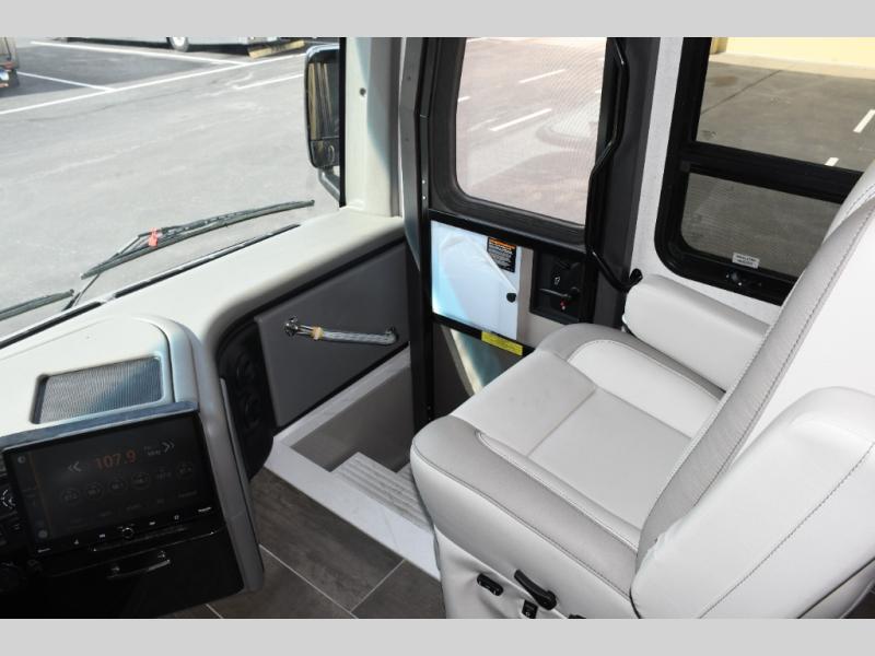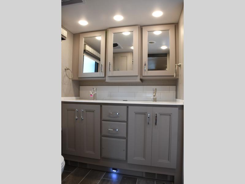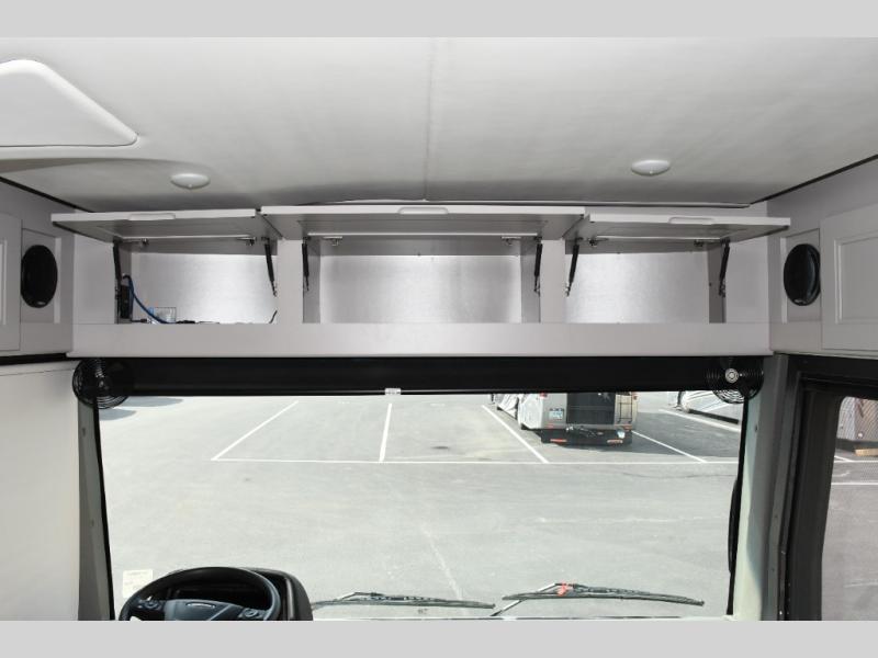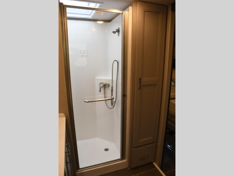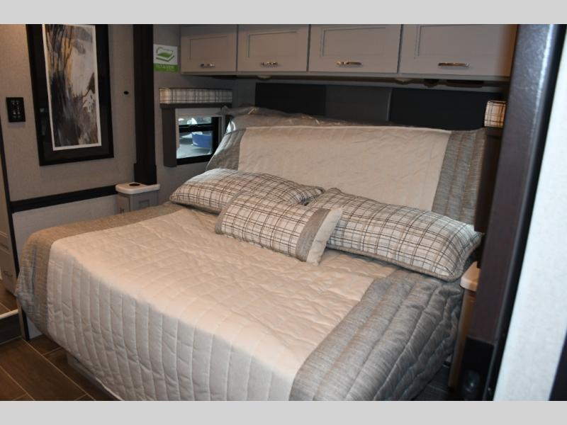 The master suite in the Aria 3901 provides a private retreat with plush bedding, wardrobe space, and thoughtful details designed for restful nights. The full bathroom features residential-style fixtures and a spacious shower, delivering comfort and convenience that enhance life on the road. Built on a powerful diesel chassis with advanced suspension and confidence-inspiring handling, the Aria 3901 delivers a smooth, enjoyable driving experience from highway cruising to scenic byways.