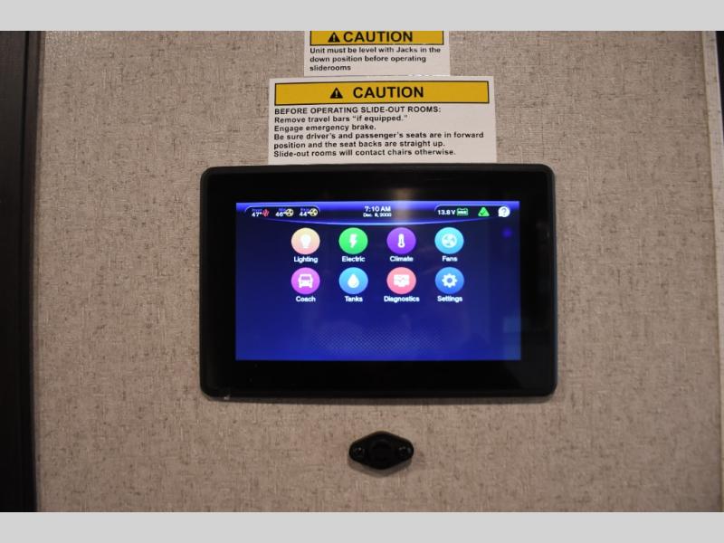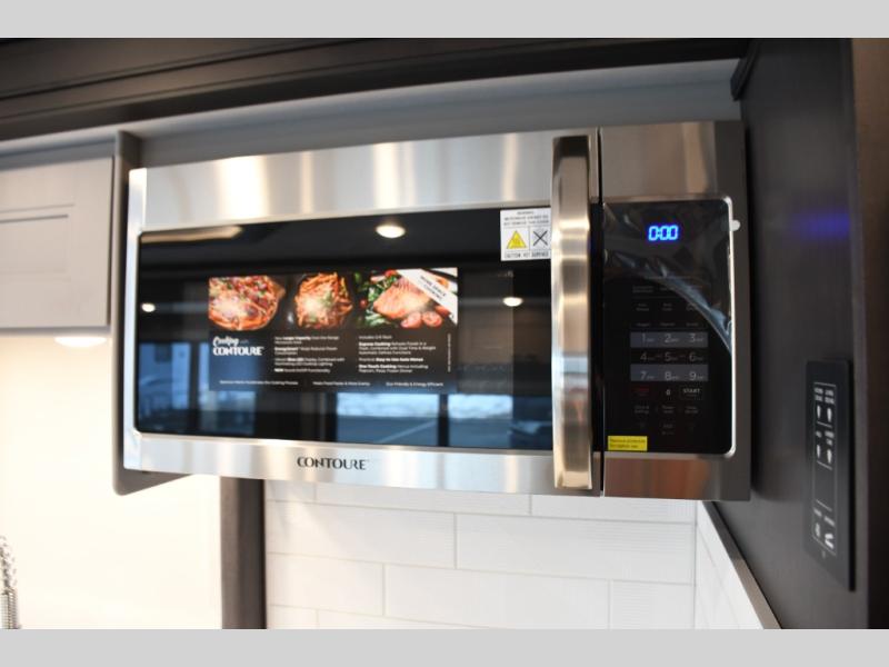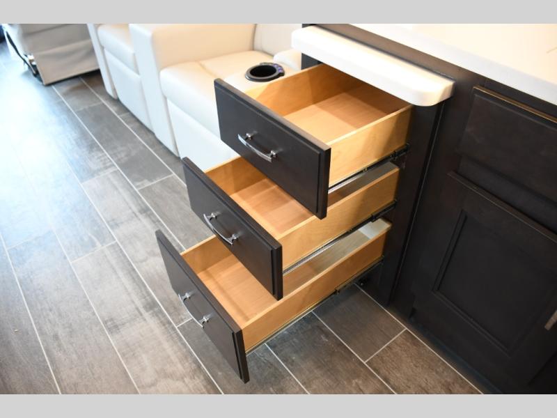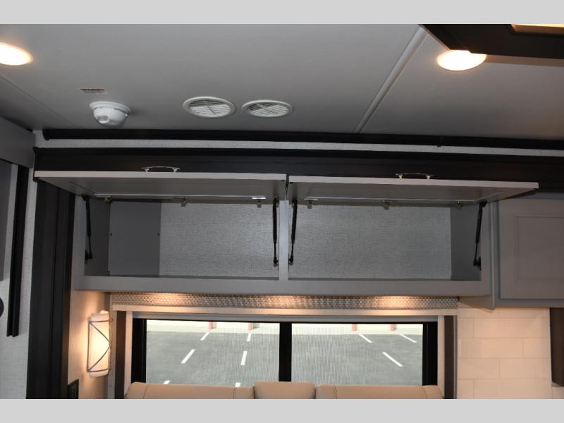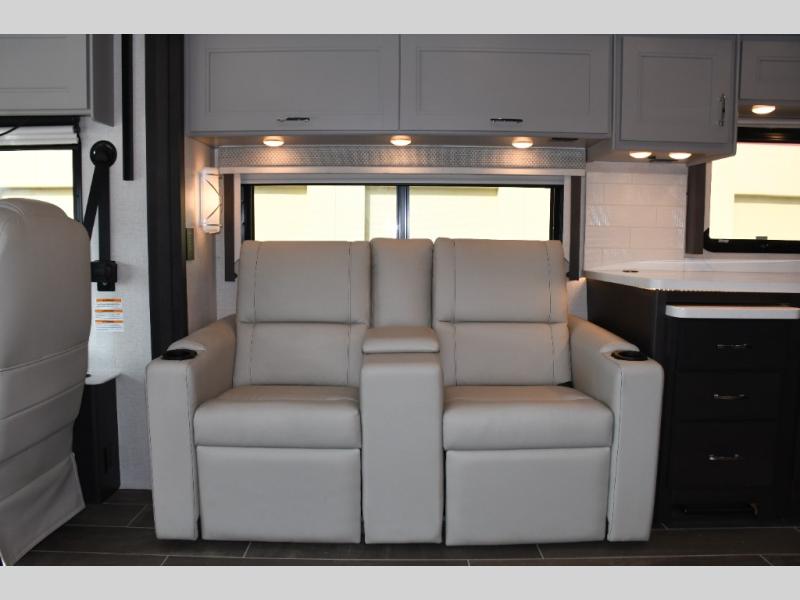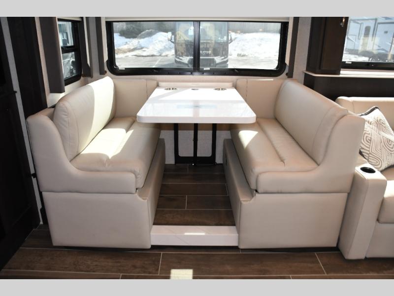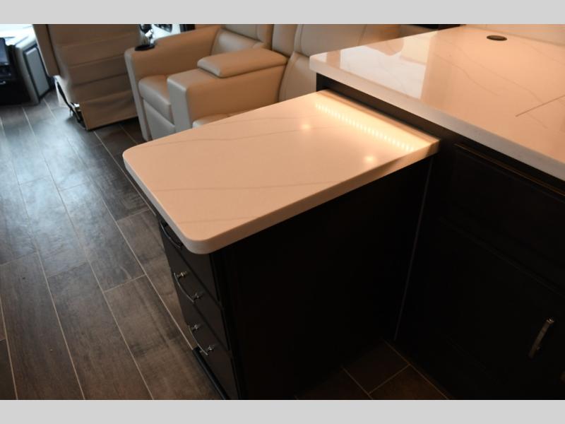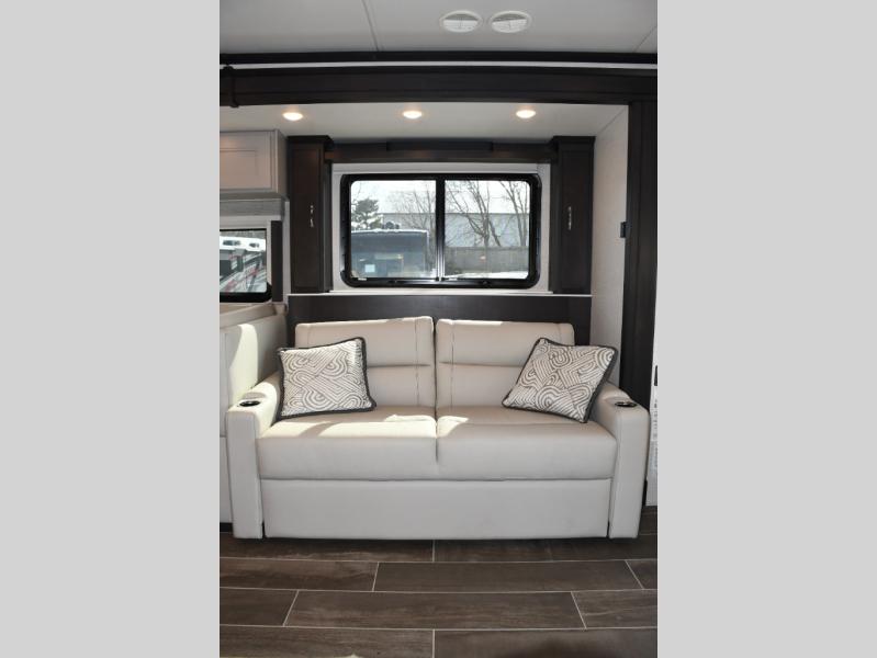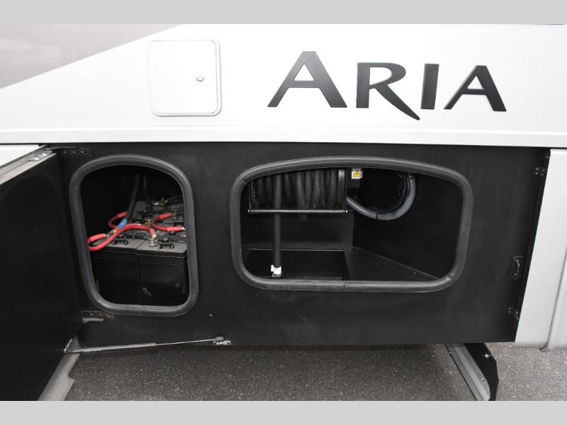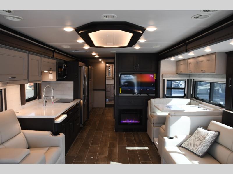 Step inside the Aria 3901 and discover a living space that rivals a high-end home. Panoramic windows fill the interior with natural light, creating an open and welcoming atmosphere. The chef-ready galley offers premium appliances, abundant counter space, and clever storage for seamless meal preparation, whether you’re cooking breakfast before hitting the trail or hosting friends for dinner under the stars. Luxurious seating choices and entertainment options make the main living area a favorite place to relax and socialize.