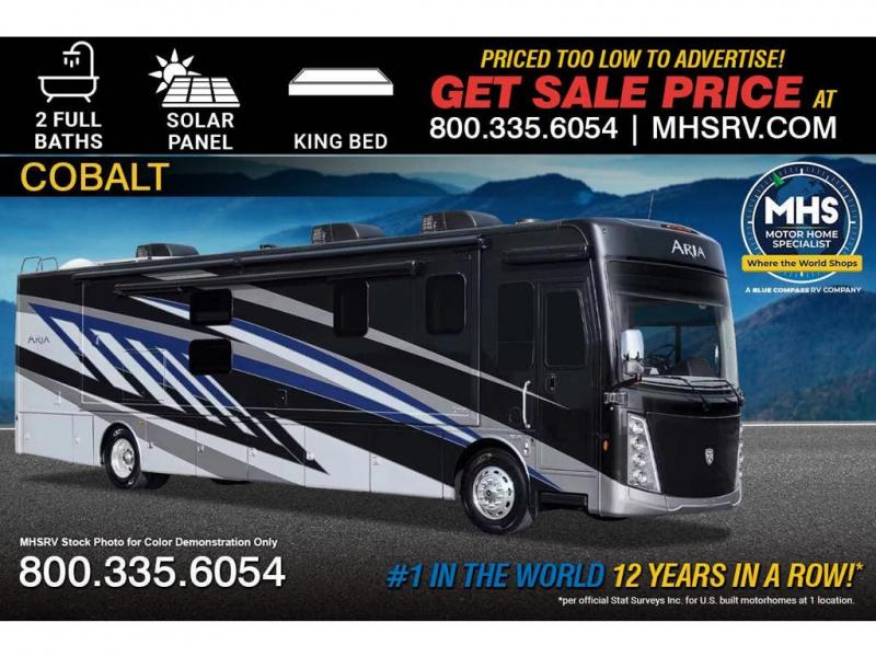 With any Aria Class A diesel motorhome by Thor Motor Coach, experience RV living with all the luxurious amenities you are accustom to, command the roadways with improved handling from the VFS front axle with a 55-degree wheel cut, and enjoy a smooth ride thanks to the Air-Ride suspension and Sachs shock absorbers. The driver will also appreciate the 10.1" touchscreen dash radio with Bluetooth, and Sirius/XM prep when navigating the roads, and the comfort of the leatherette reclining/swivel adjustable captain's chairs. The bathroom provides an oversized full height shower with a glass door and a designer backsplash, while the kitchen provides solid surface countertops and a dinette. You'll also enjoy designer tile backsplash, a large double bowl stainless steel sink with a single handle faucet, a pull-down sprayer, plus full kitchen amenities. More standout features include the Wyndham cabinetry with rake style cabinet doors & nickel finish hardware, plus much much more depending on the Aria you take on the road!