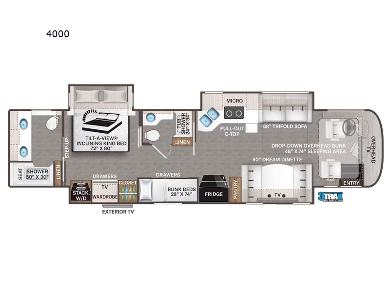 Not many coaches include two full bathrooms, yet this one does for total convenience! The spacious rear bathroom offers a dual-sink vanity and a 52" x 30" full-height shower with glass door that is located off of the walk-through master bedroom with a Tilt-A-View inclining king bed. You will also find a stackable washer and dryer to keep all your clothes clean! The other bathroom is mid-coach, and includes a 24" x 34" full-height tub/shower and linen storage directly across from the bunk beds with drawers. In the front, the drop-down overhead bunk above the cab has a 32" TV to watch, and the main living area offers a 50" LED Smart TV. When it is time to relax, the tri-fold sofa and Dream dinette, plus captain's chairs that swivel offer seating. And the power awning offers an outdoor living area that is covered for you to sit outside and visit or watch the exterior 40" LED TV.