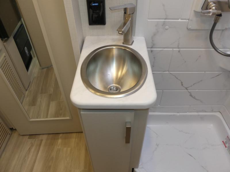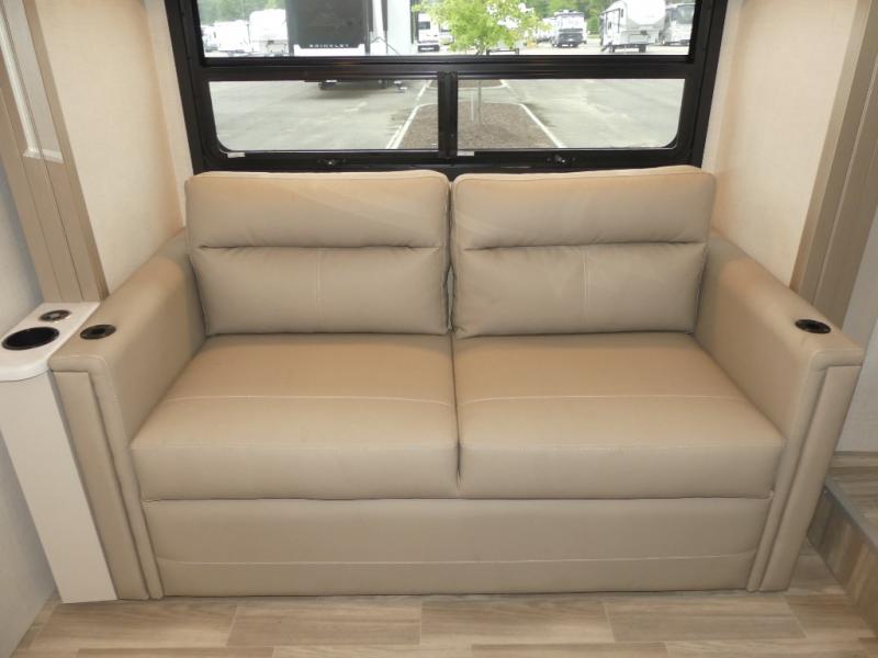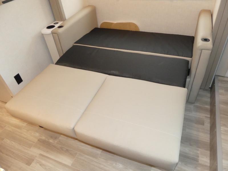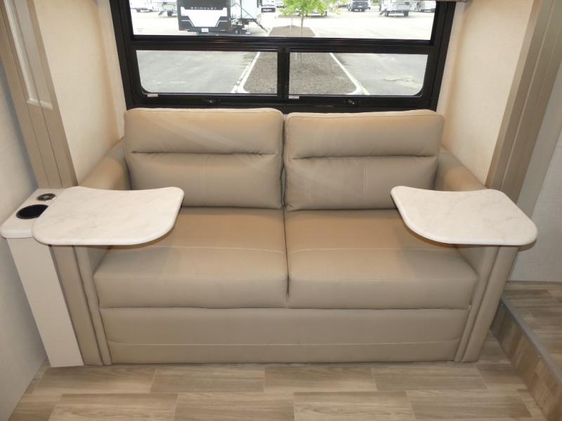 Plan to see it all in this Class A gas coach that can sleep four people each night. The sofa slide out includes a 32" Smart TV across from the sofa to watch your favorite shows. You will also find a 32" Smart TV in the rear bedroom, along with twin beds that convert to a king-size bed if you like. The spacious full bath includes a stainless steel sink, a shower skylight, and convenient robe hooks. Breakfast, lunch, and dinner can be made on the two burner gas cooktop or in the convection microwave with an air fryer, and the 12V double door refrigerator can store your perishables for the whole week.