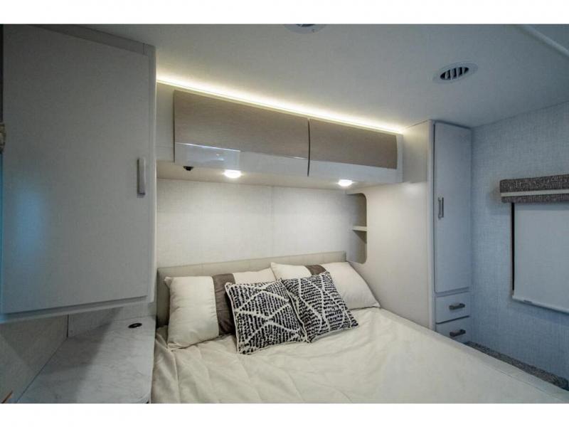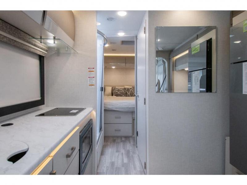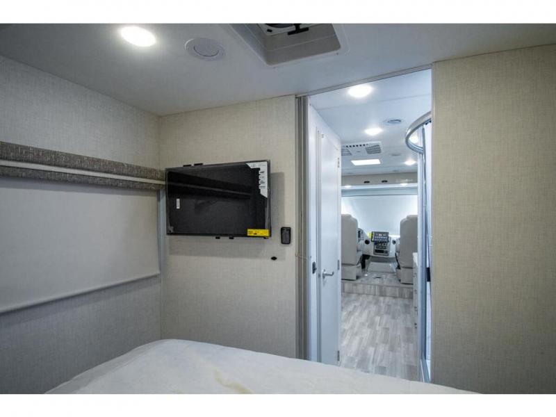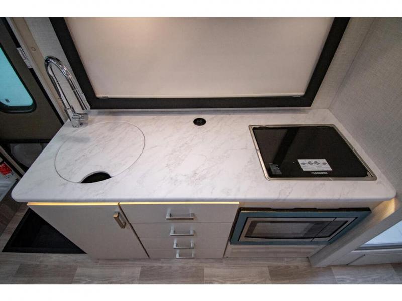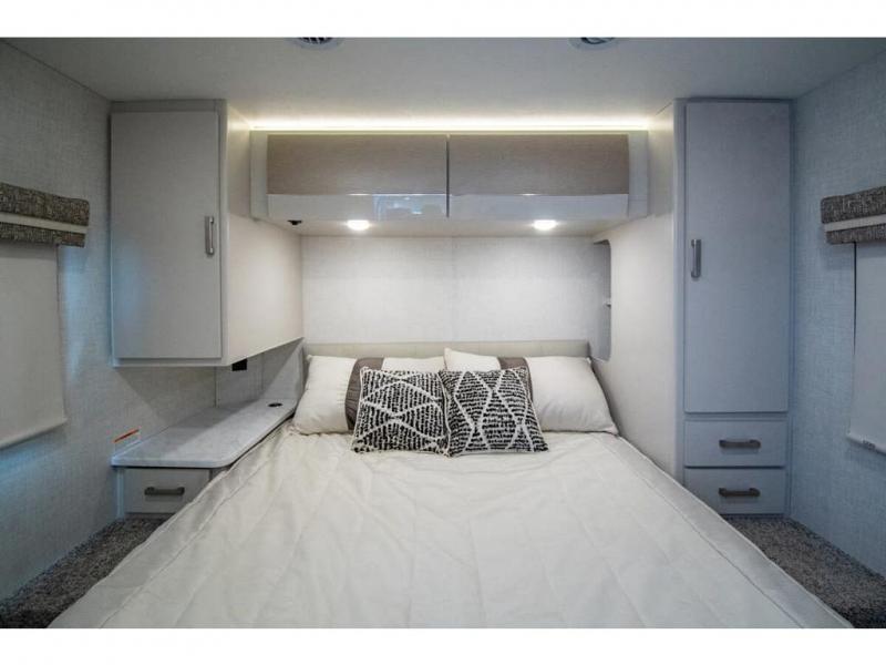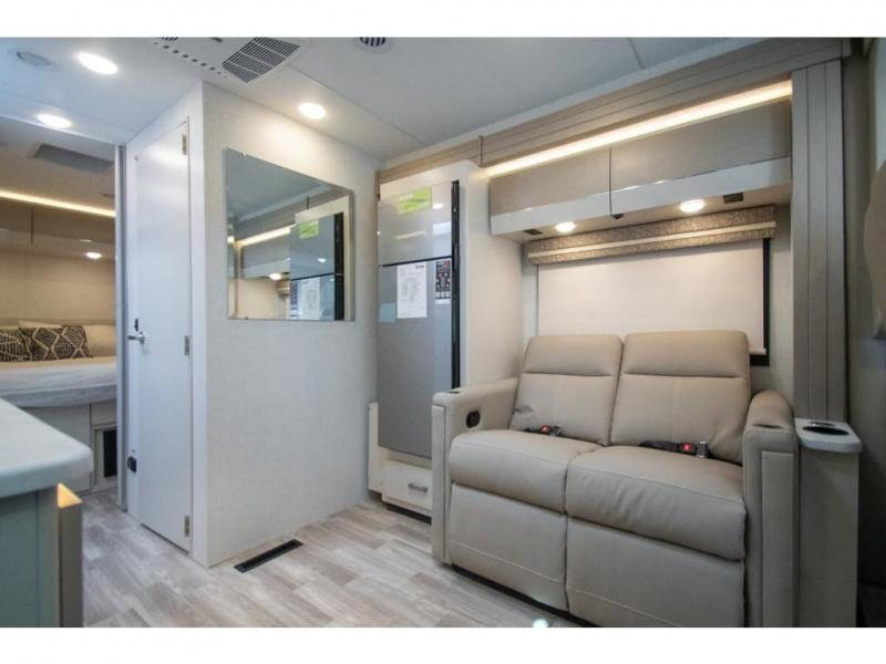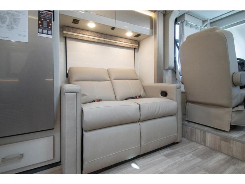 This is a perfect couples coach! After you've arrived at your destination and set up camp, prepare lunch with the two burner gas cooktop or in the convection microwave with an air fryer. You'll also find a 12V double door refrigerator for perishables, plus a single bowl sink with a pull-down sprayer and a waste basket for easy clean up. The theater seating slide has a direct view of the 32" Smart TV, and there is a coffee table up front between the swivel captain's chairs for even more seating space. When you're ready for some shut-eye, the rear bedroom with an RV queen bed will provide a great night's rest, and you'll appreciate closets on either side of the bed for your clothes, and even a 32" Smart TV for movie night!