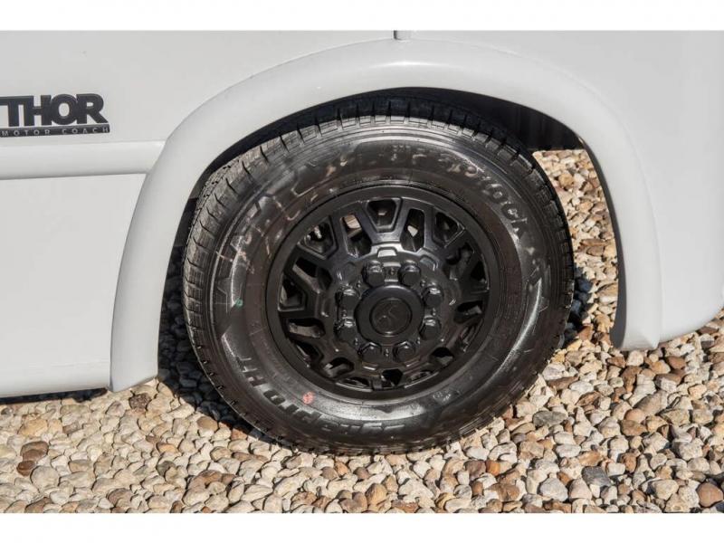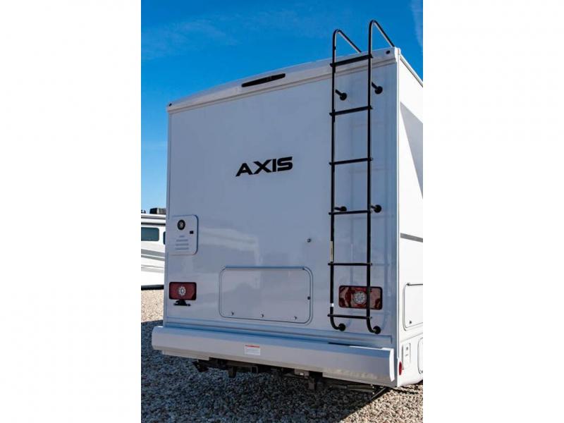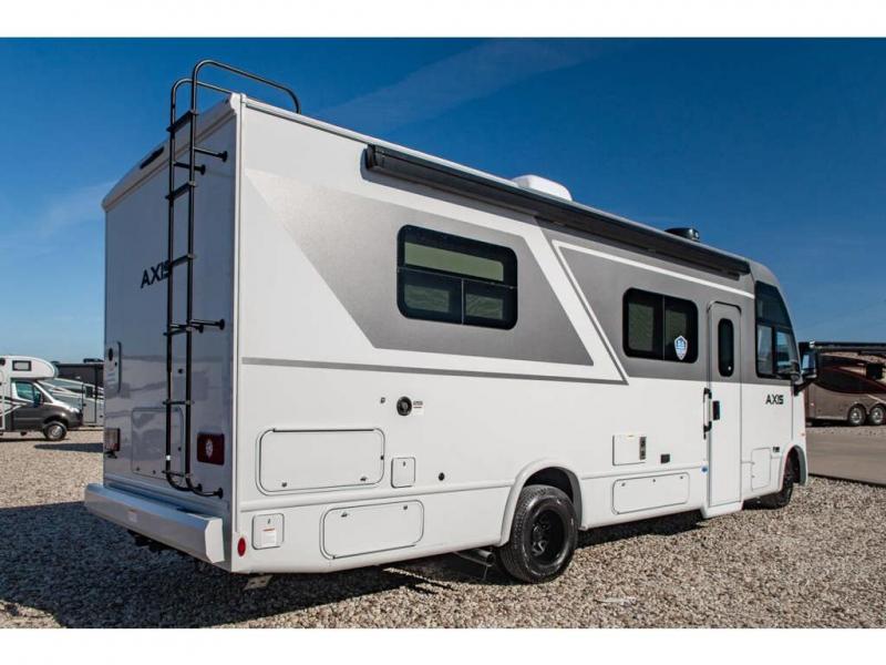 With any Axis Class A gas motorhome by Thor Motor Coach you will enjoy added technology features to make each trip enjoyable, like the RapidCamp+ multiplex lighting and systems control and the Winegard ConnecT 2.0 Wi-Fi/4G/TV antenna. Each model features heated and remote exterior mirrors with integrated side view cameras, reclining and swivel leatherette captain's chairs, and a dash workstation with 110-volt and 12-volt outlets to get some work done if needed. Relaxing after a long day of traveling will be easy with the leatherette furniture, complete kitchen and bath amenities, and 82" interior ceiling height. The HD-MAX exterior with graphics package and black frameless windows provide a sleek look you are sure to love, and don't overlook the lateral arm power awning with integrated LED lighting and lighted rotocast storage compartments for all your gear.