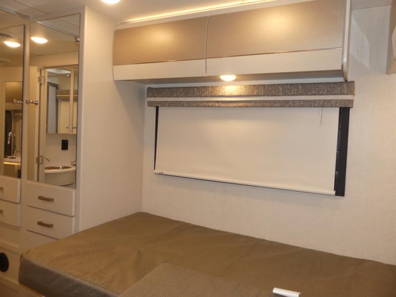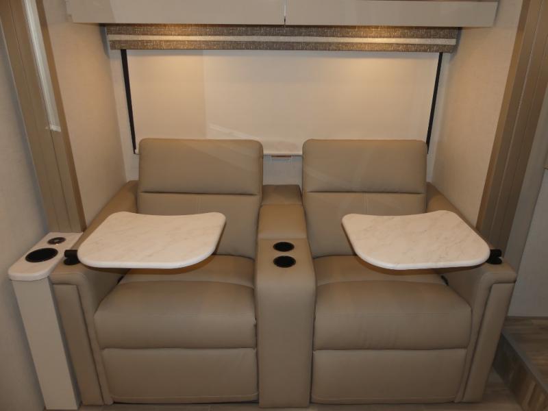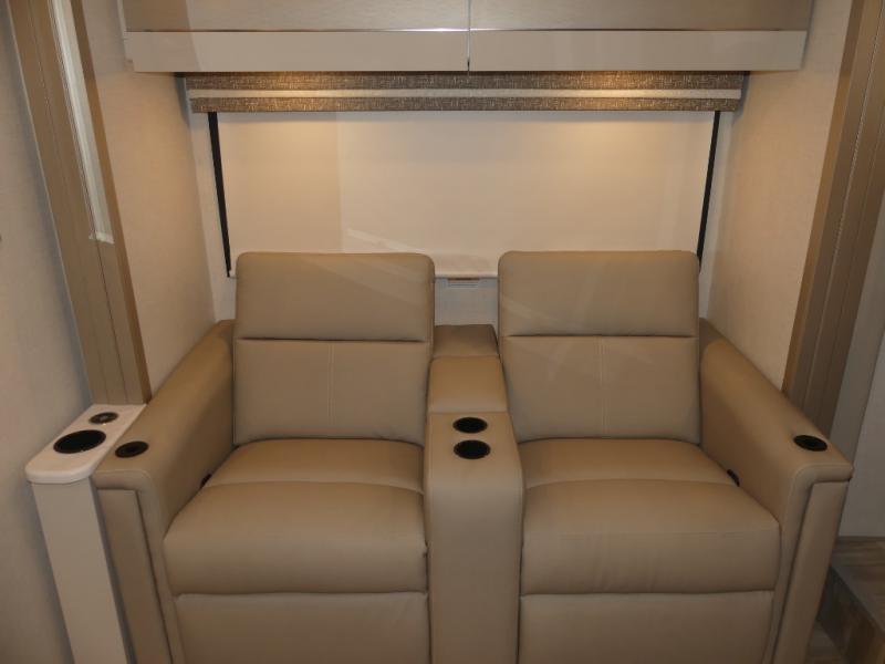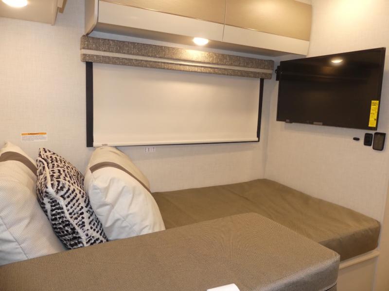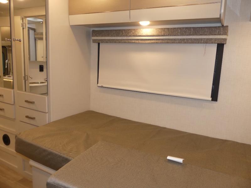 Wherever you decide to roam, you can be sure to make the most out of each trip in this coach! The swivel captain's seats can be turned to face the main living room once you park, and there is additional seating space on the theater seating. There is even a 32" Smart TV across from the sofa to enjoy movies! It will be so easy to make meals with a two burner gas cooktop and convection microwave with an air fryer, plus there is a 12V double door refrigerator for cold items. A full bath will let you freshen up after a day of exploring, and the rear bedroom with a privacy curtain is sure to bring comfort. Here, you'll enjoy twin beds with a king bed conversion, a USB power charging center for your electronics, and a 32" Smart TV so you can watch shows in bed!