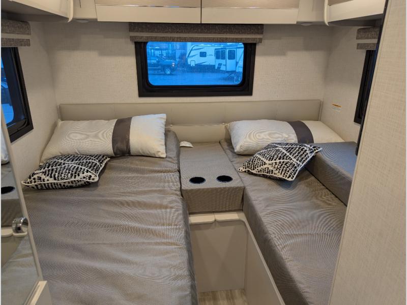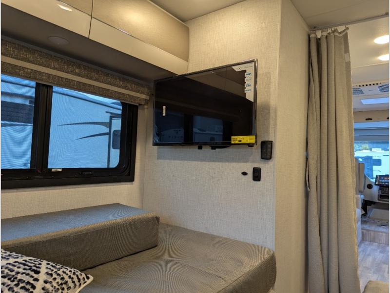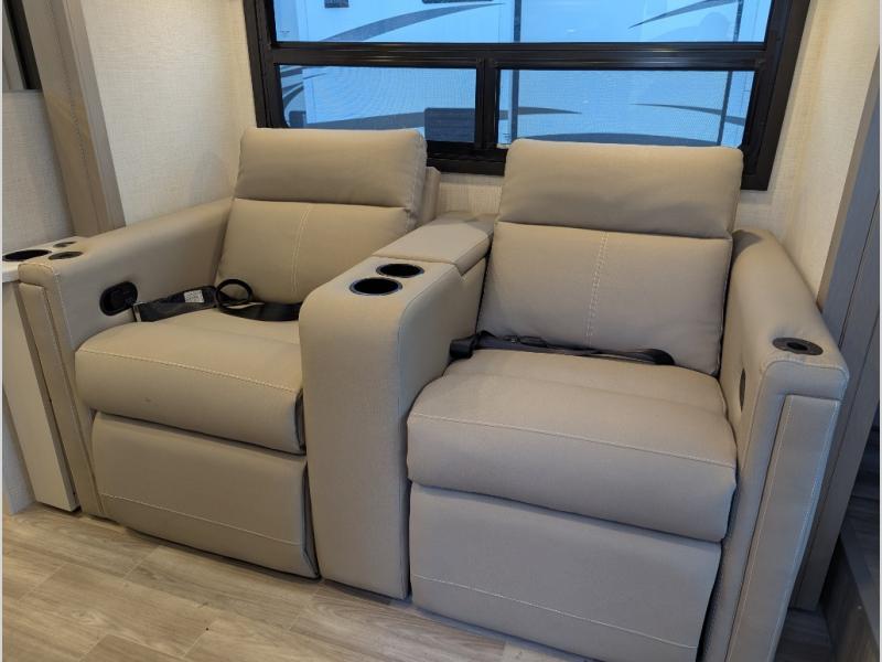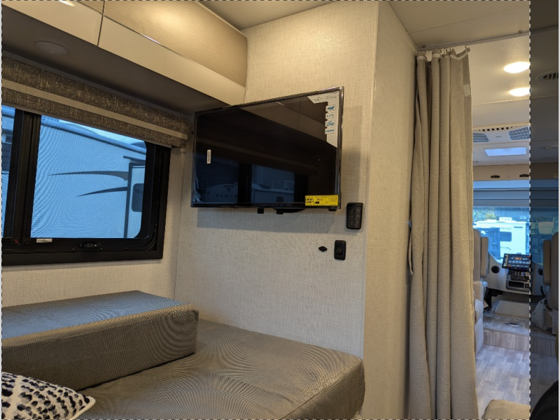 Wherever you decide to roam, you can be sure to make the most out of each trip in this coach! The swivel captain's seats can be turned to face the main living room once you park, and there is additional seating space on the theater seating. There is even a 32" Smart TV across from the sofa to enjoy movies! It will be so easy to make meals with a two burner gas cooktop and convection microwave with an air fryer, plus there is a 12V double door refrigerator for cold items. A full bath will let you freshen up after a day of exploring, and the rear bedroom with a privacy curtain is sure to bring comfort. Here, you'll enjoy twin beds with a king bed conversion, a USB power charging center for your electronics, and a 32" Smart TV so you can watch shows in bed!