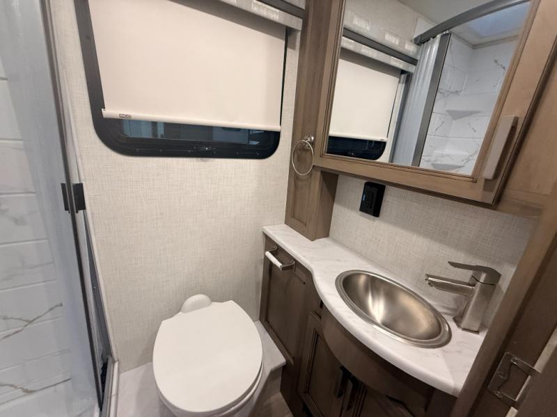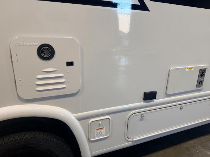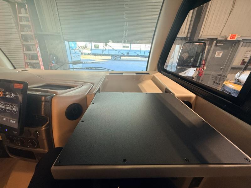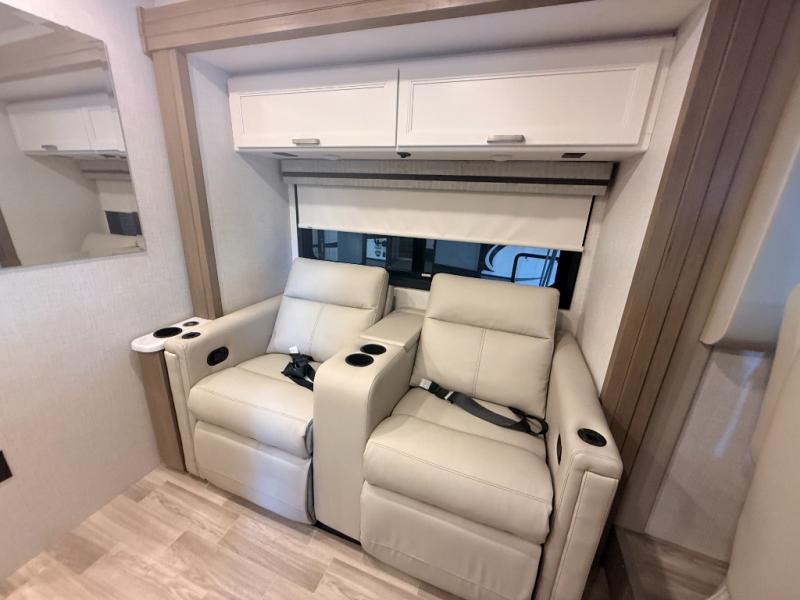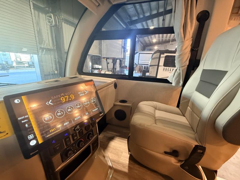 With any Axis Class A gas motorhome by Thor Motor Coach you will enjoy added technology features to make each trip enjoyable, like the RapidCamp+ multiplex lighting and systems control and the Winegard ConnecT 2.0 Wi-Fi/4G/TV antenna. Each model features heated and remote exterior mirrors with integrated side view cameras, reclining and swivel leatherette captain's chairs, and a dash workstation with 110-volt and 12-volt outlets to get some work done if needed. Relaxing after a long day of traveling will be easy with the leatherette furniture, complete kitchen and bath amenities, and 82" interior ceiling height. The HD-MAX exterior with graphics package and black frameless windows provide a sleek look you are sure to love, and don't overlook the lateral arm power awning with integrated LED lighting and lighted rotocast storage compartments for all your gear.