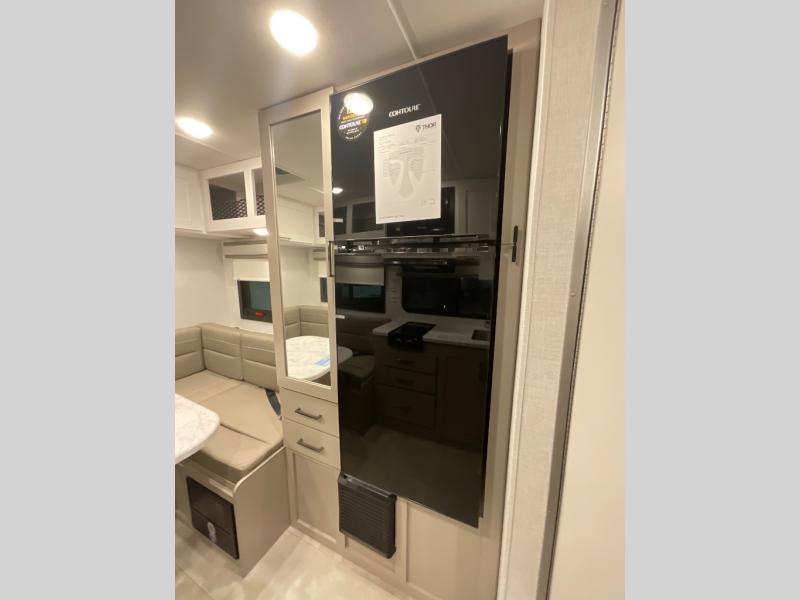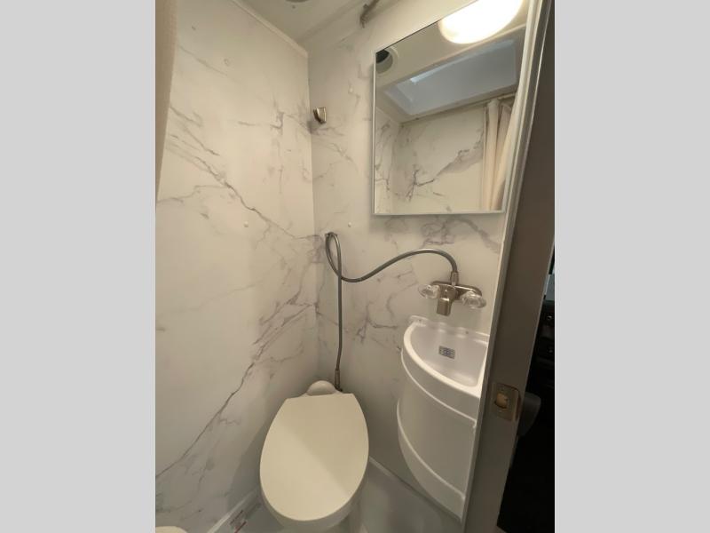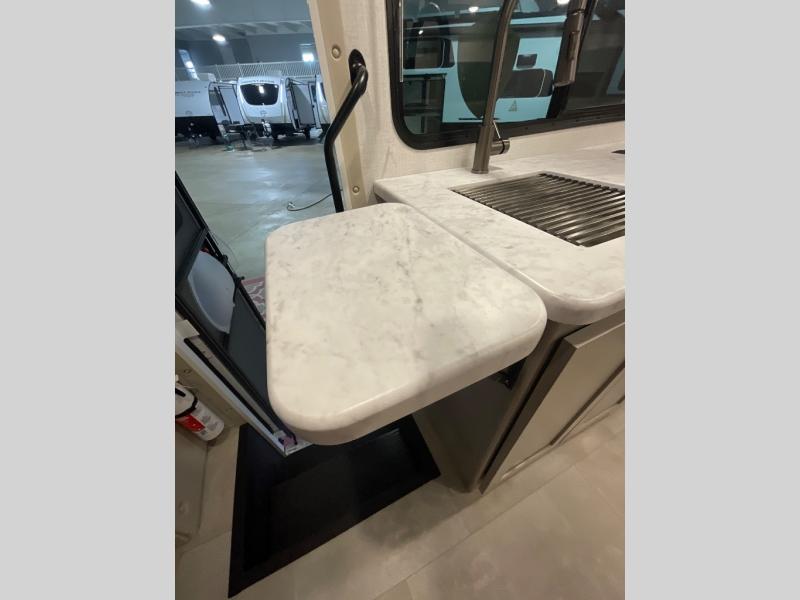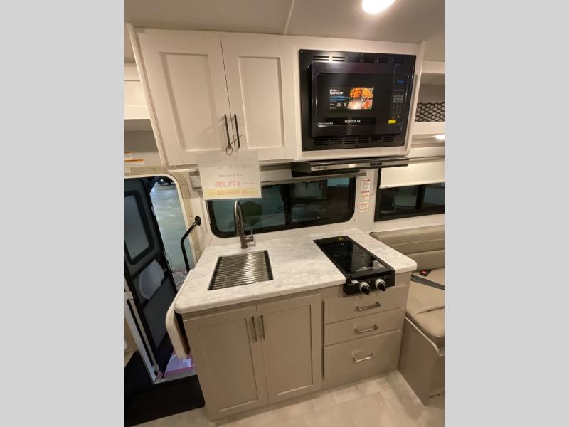 This compact, yet cozy coach is perfect for trips to the campground each weekend! Once you've reached your destination, you can set up the 11' power awning, unload the exterior storage compartments, and relax in your camp chairs. The two burner gas cooktop and convection microwave with an air fryer will let you make meals each day, and there is a 12V refrigerator to keep food fresh. A flip-up counter is another great feature that will give you more prep space! You can freshen up in the wet bath, grab your night clothes from the closet, then convert the U-shaped dinette into a 54" x 77" bed for a great night's rest!