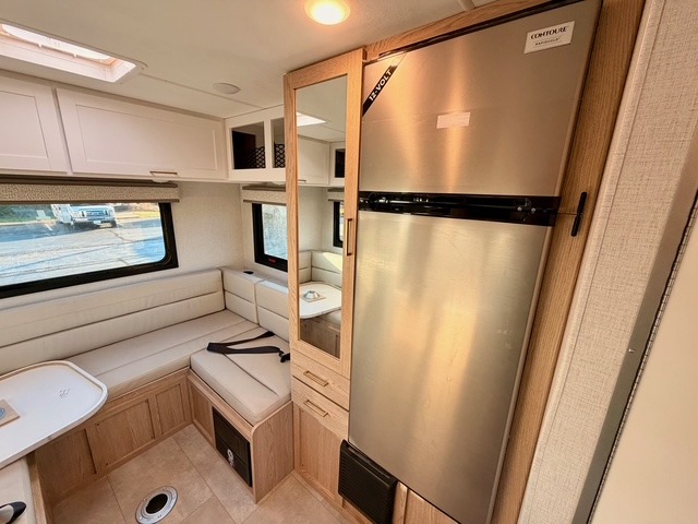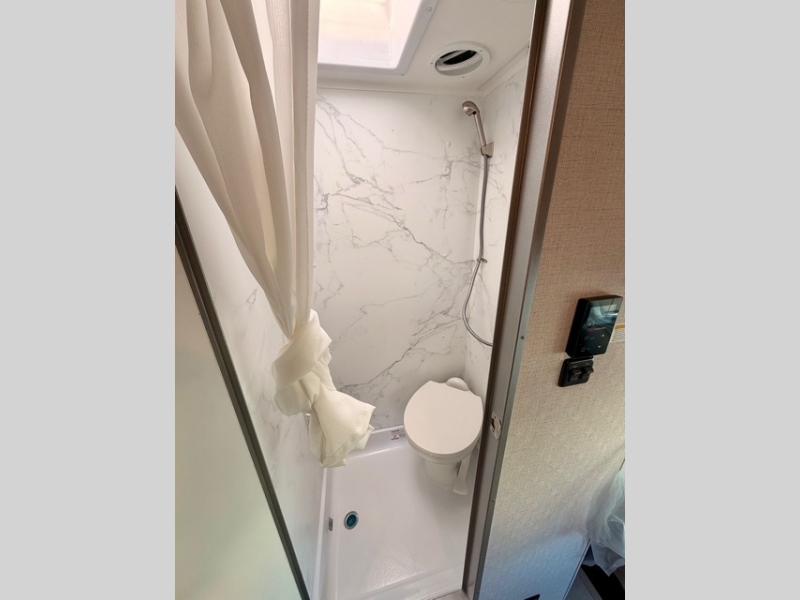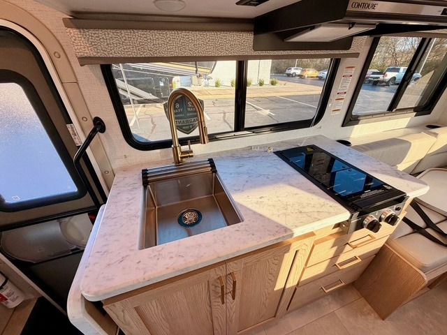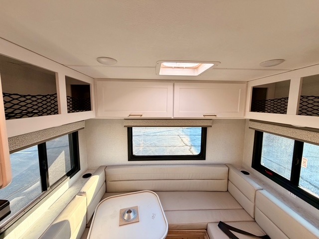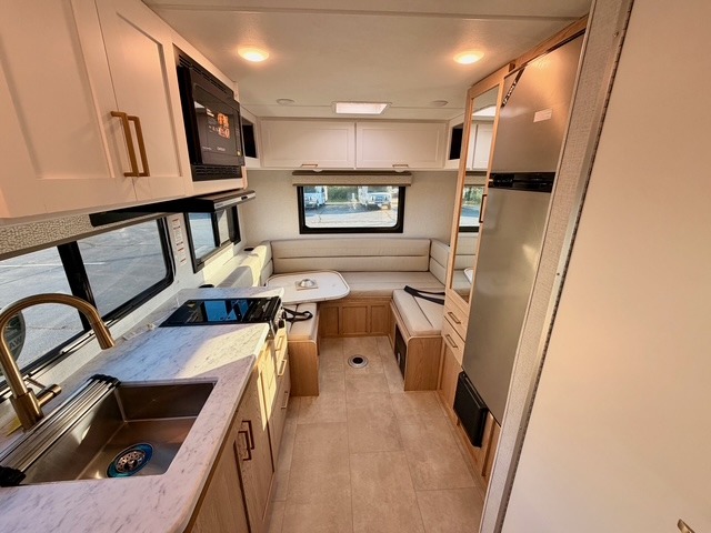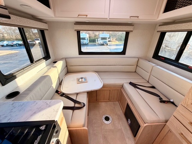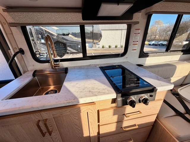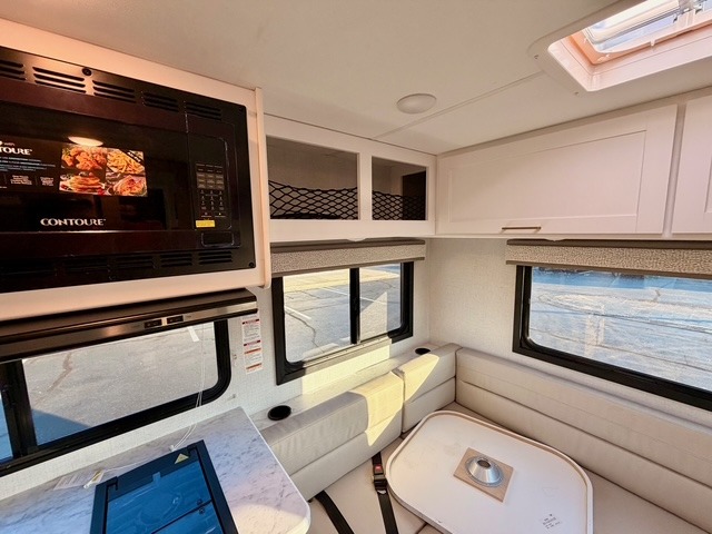 This compact, yet cozy coach is perfect for trips to the campground each weekend! Once you've reached your destination, you can set up the 11' power awning, unload the exterior storage compartments, and relax in your camp chairs. The two burner gas cooktop and convection microwave with an air fryer will let you make meals each day, and there is a 12V refrigerator to keep food fresh. A flip-up counter is another great feature that will give you more prep space! You can freshen up in the wet bath, grab your night clothes from the closet, then convert the U-shaped dinette into a 54" x 77" bed for a great night's rest!
