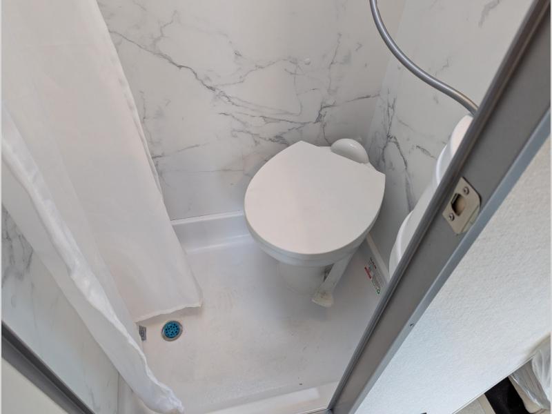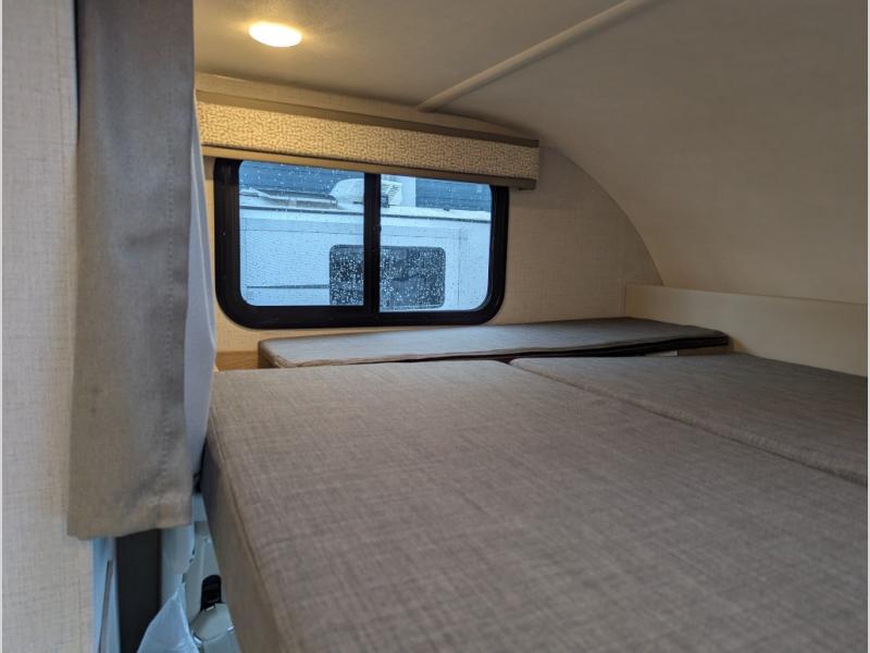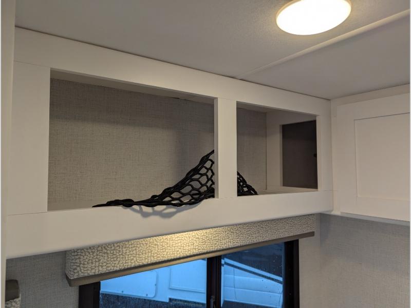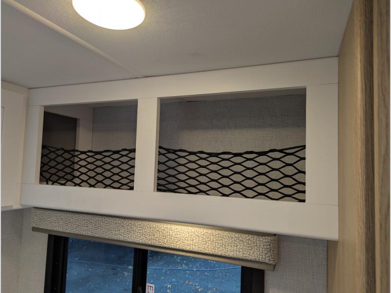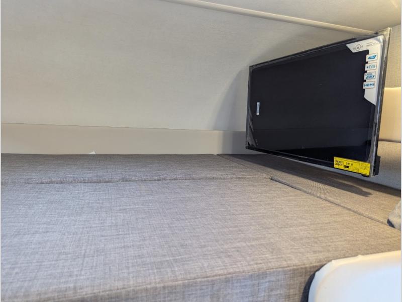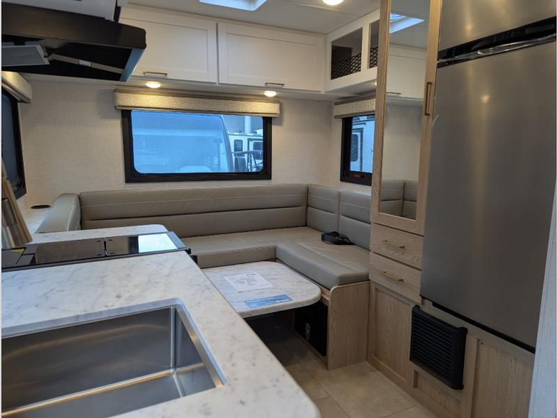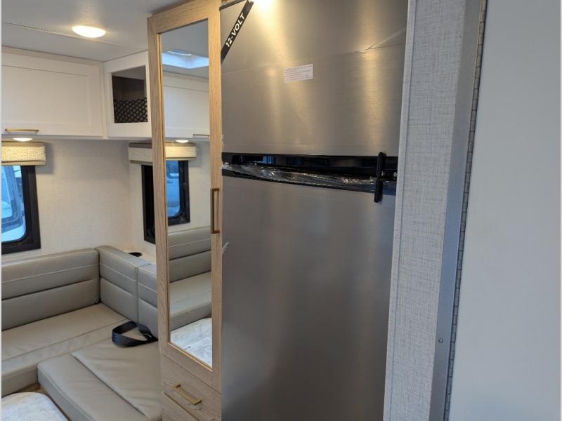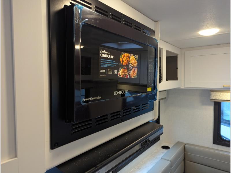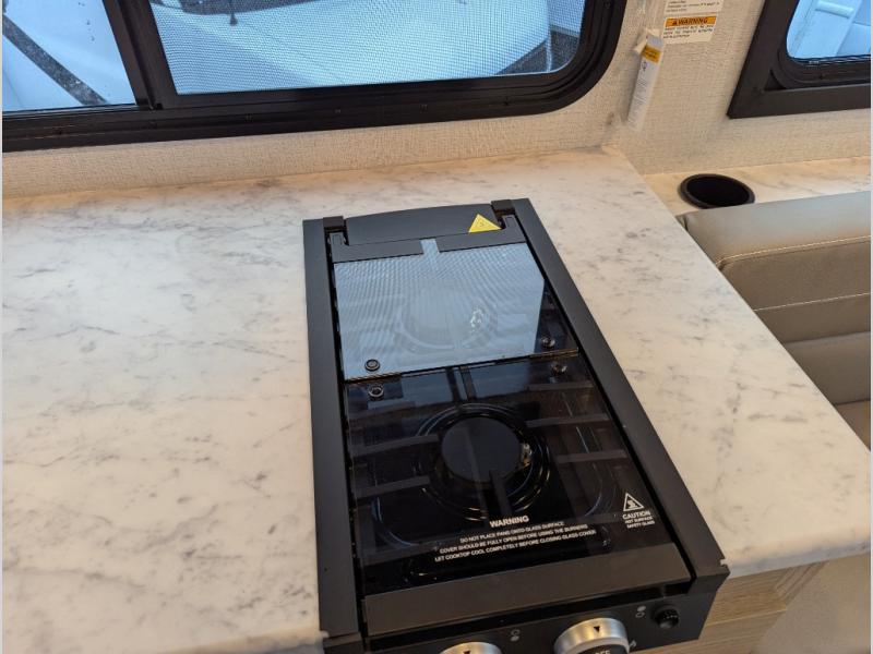 This compact, yet cozy coach is perfect for trips to the campground each weekend! Once you've reached your destination, you can set up the 11' power awning, unload the exterior storage compartments, and relax in your camp chairs. The two burner gas cooktop and convection microwave with an air fryer will let you make meals each day, and there is a 12V refrigerator to keep food fresh. A flip-up counter is another great feature that will give you more prep space! You can freshen up in the wet bath, grab your night clothes from the closet, then convert the U-shaped dinette into a 54" x 77" bed for a great night's rest!