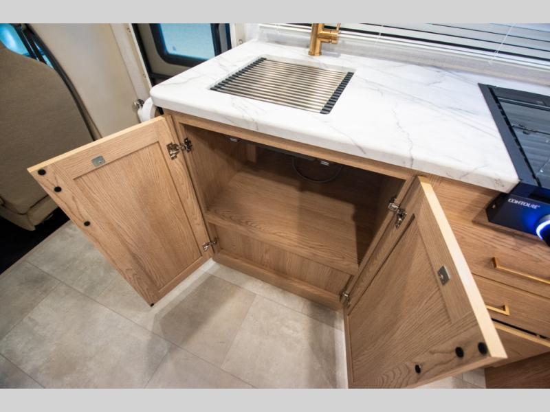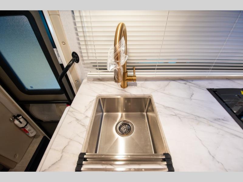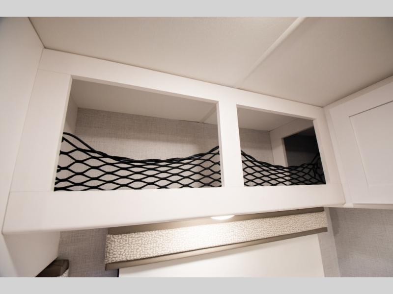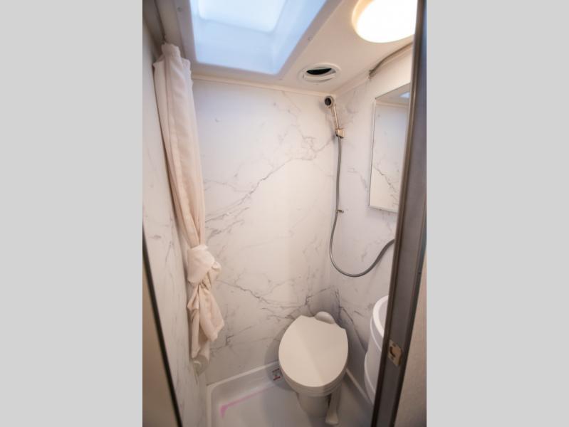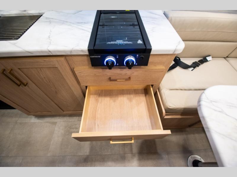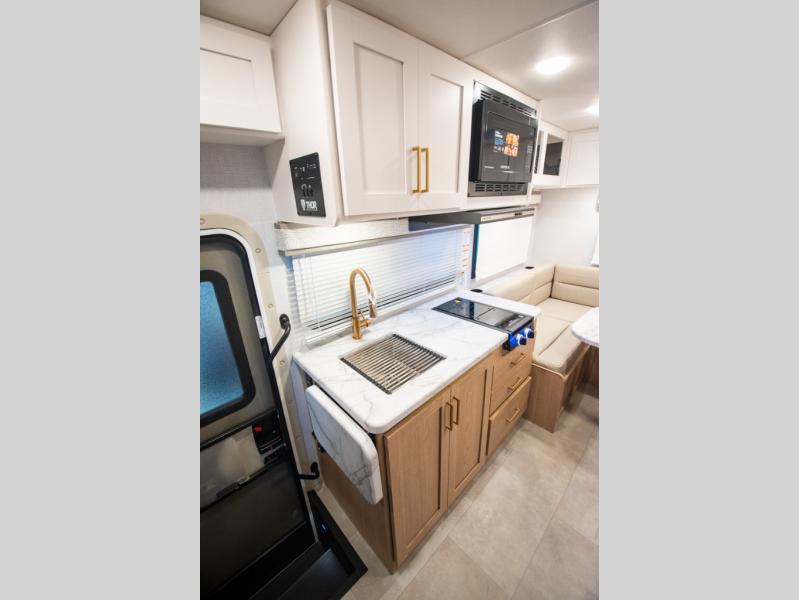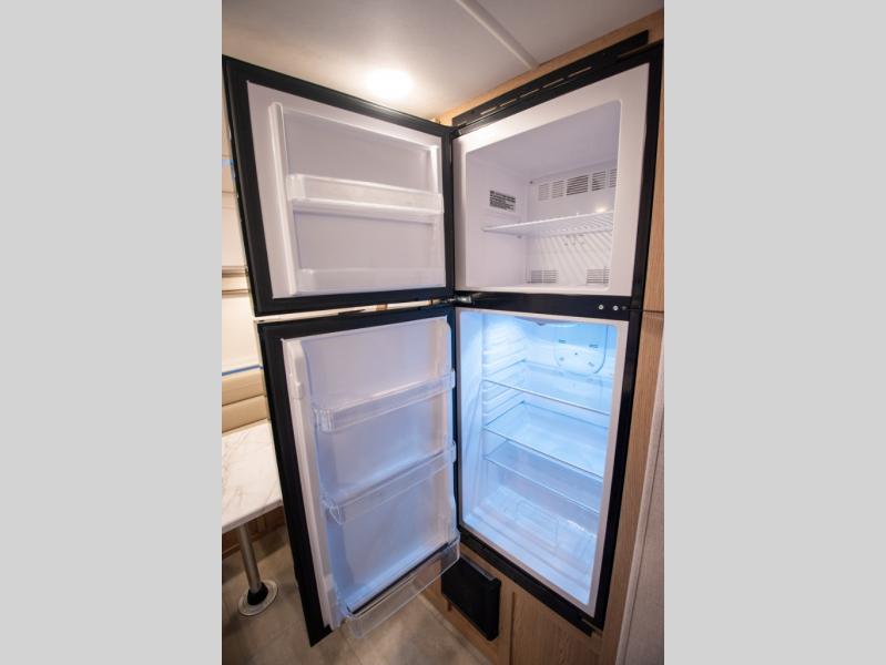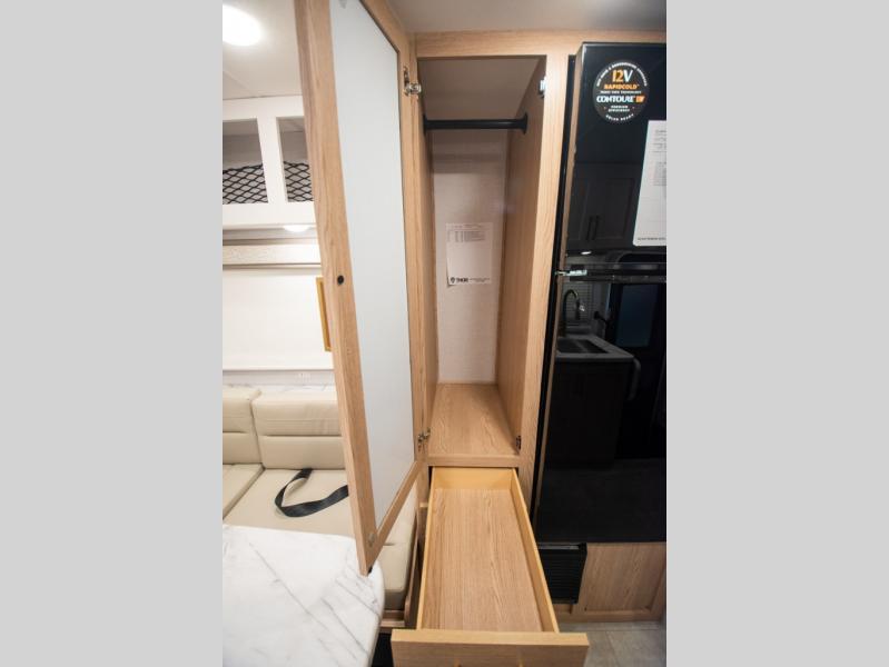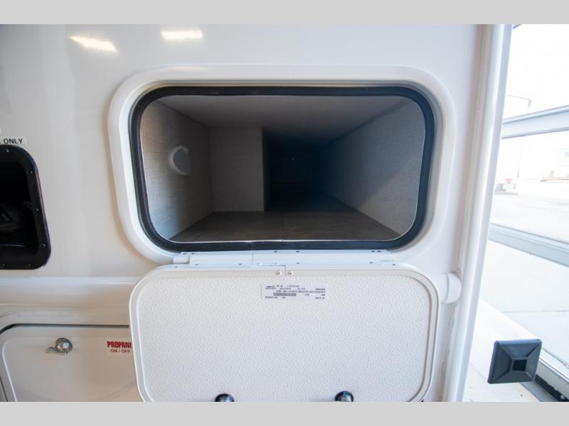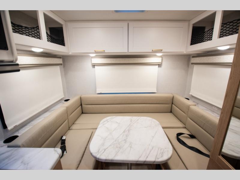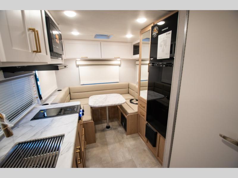 This compact, yet cozy coach is perfect for trips to the campground each weekend! Once you've reached your destination, you can set up the 11' power awning, unload the exterior storage compartments, and relax in your camp chairs. The two burner gas cooktop and convection microwave with an air fryer will let you make meals each day, and there is a 12V refrigerator to keep food fresh. A flip-up counter is another great feature that will give you more prep space! You can freshen up in the wet bath, grab your night clothes from the closet, then convert the U-shaped dinette into a 54" x 77" bed for a great night's rest!