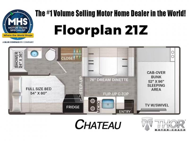 MSRP $129,626. New 2026 Thor Motor Coach Chateau® 21Z. It measures approximately 24 feet 1 inches in length providing a sleeping, dining and living space while still remaining compact enough for most any state park and exceptional maneuverability even for first time RVers! This features the Ford E-Series Chassis and the Ford 7.3L V8. 325HP engine with 450 lb.-ft Torque. Additional features and construction highlights include an Thor’s MEGA-Storage® exterior compartment, One-piece fiberglass front cap, one-piece upper rear cap, premium one-piece crossflex exterior roofing, power patio awning with integrated LED lighting, Drop down stairwell entrance step with accent light under step, exterior grab handle, 7” Touchscreen dash radio with Bluetooth, Android Auto, Apple CarPlay, keyless entry key fob, back-up monitor, full extension soft close metal ball-bearing drawer guides, cab-over sleeping area with cup holders and bunk ladder, dual child safety tethers in dinette, flip-up countertop extension, 4.0KW gas generator, automatic transfer switch with power protection, tankless water heater and battery tray for four batteries. Shop hundreds of class C gas RVs at 1 location! Choose from Fleetwood Altitude - Gulf Stream BT Cruiser - Thor Chateau - Four Winds - Geneva and Quantum - Entegra Coach Odyssey Odyssey SE and Esteem - East to West Entrada - Forest River Forester - Forester LE - Nexus Phantom - Viper and much more. We also sell quality pre-owned models such as Jayco Greyhawk – Redhawk - Redhawk SE - Thor Magnitude - Winnebago Spirit - and Minnie Winnie - Coachmen Freelander and Leprechaun - Forest River Sunseeker Classic - Sunseeker LE – Solera - Holiday Rambler Incline and much more. Visit MHSRV.com for our complete line-up and the sale prices that have made us the #1 volume selling motor home dealership in the world 12 years in a row! For additional details on this unit and our entire inventory including brochures, window sticker, videos, photos, reviews and testimonials as well as additional information about Motor Home Specialist and our manufacturers please visit us at MHSRV.com or call 800-335-6054. At Motor Home Specialist, we DO NOT charge any prep or orientation fees like you will find at other dealerships. All sale prices include a 200-point inspection, interior & exterior wash, detail service and a fully automated high-pressure rain booth test and coach wash that is a standout service unlike that of any other in the industry. You will also receive a thorough coach orientation with an MHSRV technician, a night stay in our delivery park featuring landscaped and covered pads with full hook-ups and much more! Read thousands-upon-thousands of 5-Star reviews at MHSRV.com and see what they had to say about their experience at Motor Home Specialist. WHY PAY MORE? WHY SETTLE FOR LESS?