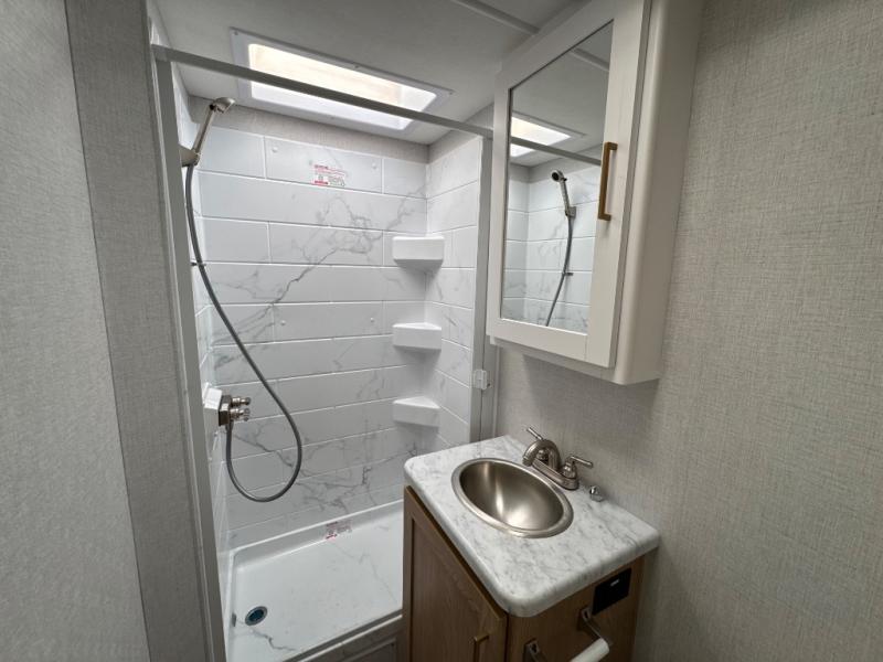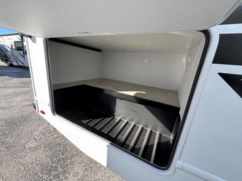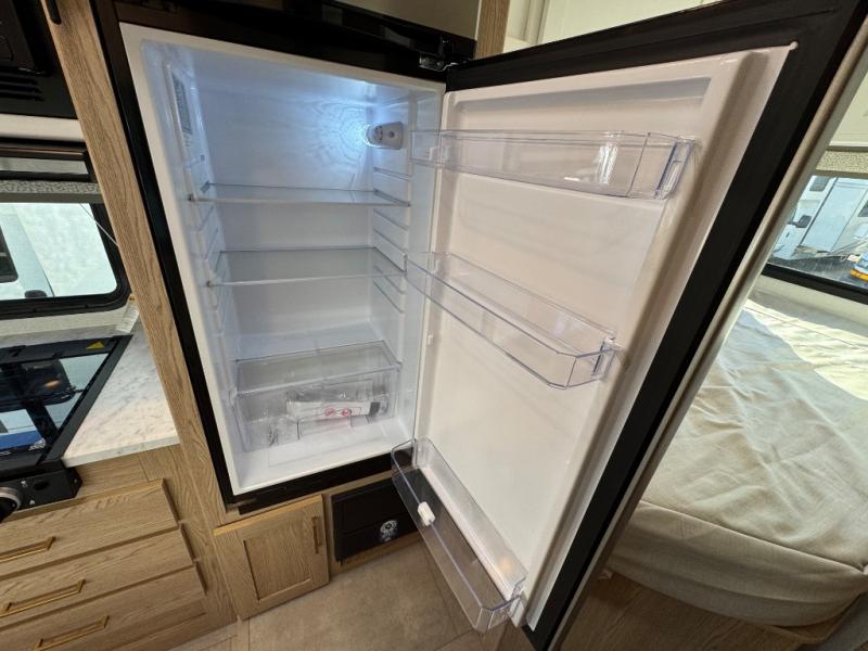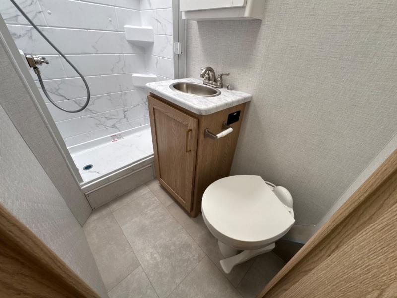 It won't be hard to find comfort in this coach for five! You can freshen up in the rear corner full bath once you've set up camp, then make lunch on the two burner gas cooktop or convection microwave with an air fryer. There is also a 12V refrigerator for cold items and a flip-up countertop for more space. Whether you dine at the Dream Dinette or take your plate outdoors under the 15' power awning, you're sure to have a great time in this motorhome. The rear corner full-size bed will provide a comfy place to rest your head at night, while your guests take the dinette and cab-over bunk!