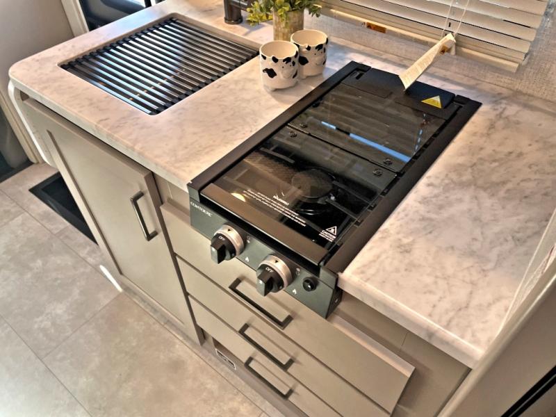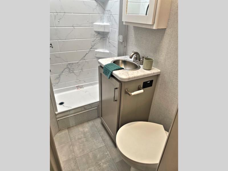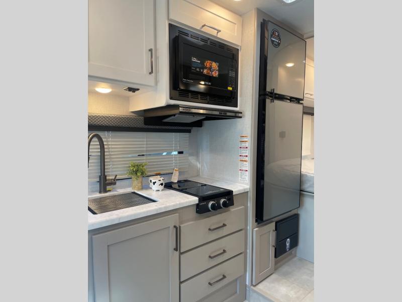 It won't be hard to find comfort in this coach for five! You can freshen up in the rear corner full bath once you've set up camp, then make lunch on the two burner gas cooktop or convection microwave with an air fryer. There is also a 12V refrigerator for cold items and a flip-up countertop for more space. Whether you dine at the Dream Dinette or take your plate outdoors under the 15' power awning, you're sure to have a great time in this motorhome. The rear corner full-size bed will provide a comfy place to rest your head at night, while your guests take the dinette and cab-over bunk!